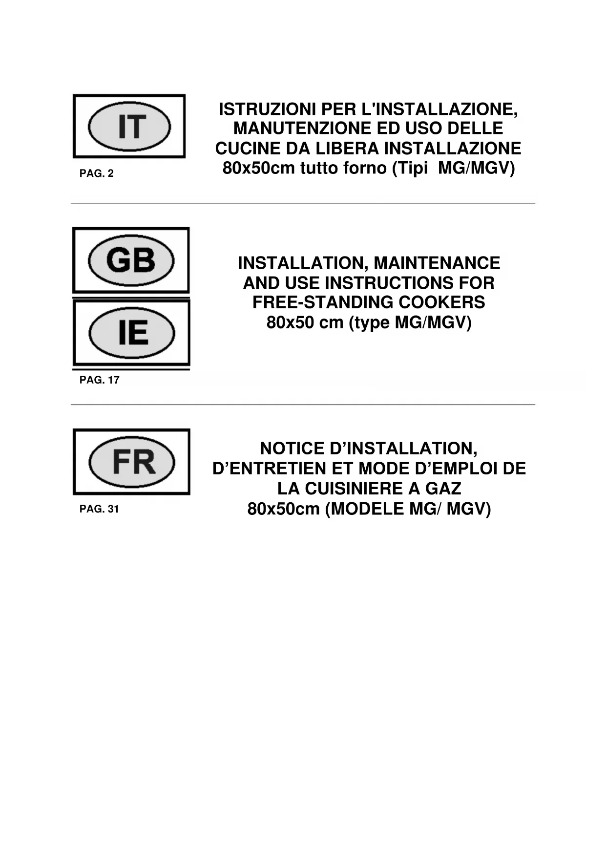 ET MODE D’EMPLOI DE LA CUISINIERE A GAZ 80x50cm (MODELE MG/ MGV) LIRE ATTENTIVEMENT LE CONTENU DE CETTE NOTICE AVANT D’INSTALLER OU D’UTILISER LA CUISINIERE. Cette notice n’est valable que dans les pays de destination dont les sigles figurent sur la couverture et sur l’étiquette de la cuisinière. Le fabricant décline toute responsabilité en cas de dommages à des personnes ou à des biens provoqués par une mauvaise installation ou un usage impropre de la cuisinière. Le fabricant ne saurait être retenu responsable des inexactitudes éventuelles dues à des erreurs d’impression ou de transcription, contenues dans cette notice. Les dessins sont purement indicatifs. Le fabricant se réserve le droit d’apporter les modifications qu’il jugera utiles à tout moment et sans préavis, mais sans modifier les caractéristiques essentielles de sécurité et de fonctionnement. INDEX : NOTICE TECHNIQUE DESTINEE A L’INSTALLATEUR ................................................................................ page 32 Installation de la cuisinière - Conseils importants sur l’installation ................................................................. page 33 Ventilation et aération de la pièce .................................................................................................................. page 33 Raccordement au réseau de distribution du gaz ............................................................................................. page 33 Adaptation aux différents type de gaz et réglage des brûleurs ........................................................................ page 34-35 Raccordement électrique ................................................................................................................................ page 35-36 ENTRETIEN DE L'APPAREIL - Changement des composants ...................................................................... page 36 NOTICE D’EMPLOI ET D’ENTRETIEN .......................................................................................................... page 37 Description des plans de cuisson .................................................................................................................... page 37 Description du tableau de bord et des commandes ........................................................................................ page 37 Utilisation des brûleurs .................................................................................................................................... page 38 Utilisation des plaques elestriques ................................................................................................................. page 38-39 Utilisation du four à gaz ................................................................................................................................... page 39-40 Utilisation du thermostat avec commutateur en serie - Utilisation du thermostat électrique ............................ page 40-41 Utilisation des commutateur 4+0 et commutateur 9+0 .................................................................................... page 41-42 Utilisation du four électrique a convection naturelle ........................................................................................ page 42 Utilisation du four électrique statique a convection ventilée ............................................................................ page 43 Utilisation du four électrique ventilé ................................................................................................................. page 43-44 Utilisation du grill a gaz ................................................................................................................................... page 44 Utilisation du grill électrique statique - Utilisation du grill électrique ventilé ..................................................... page 45 Utilisation de la minuterie - Utilisation du programmateur electronique ........................................................... page 45 Utilisation du four autonettoyant - Nettoyage de l’appareil .............................................................................. page 45-46 CET APPAREIL A ETE CONCU POUR UN USAGE DOMESTIQUE.