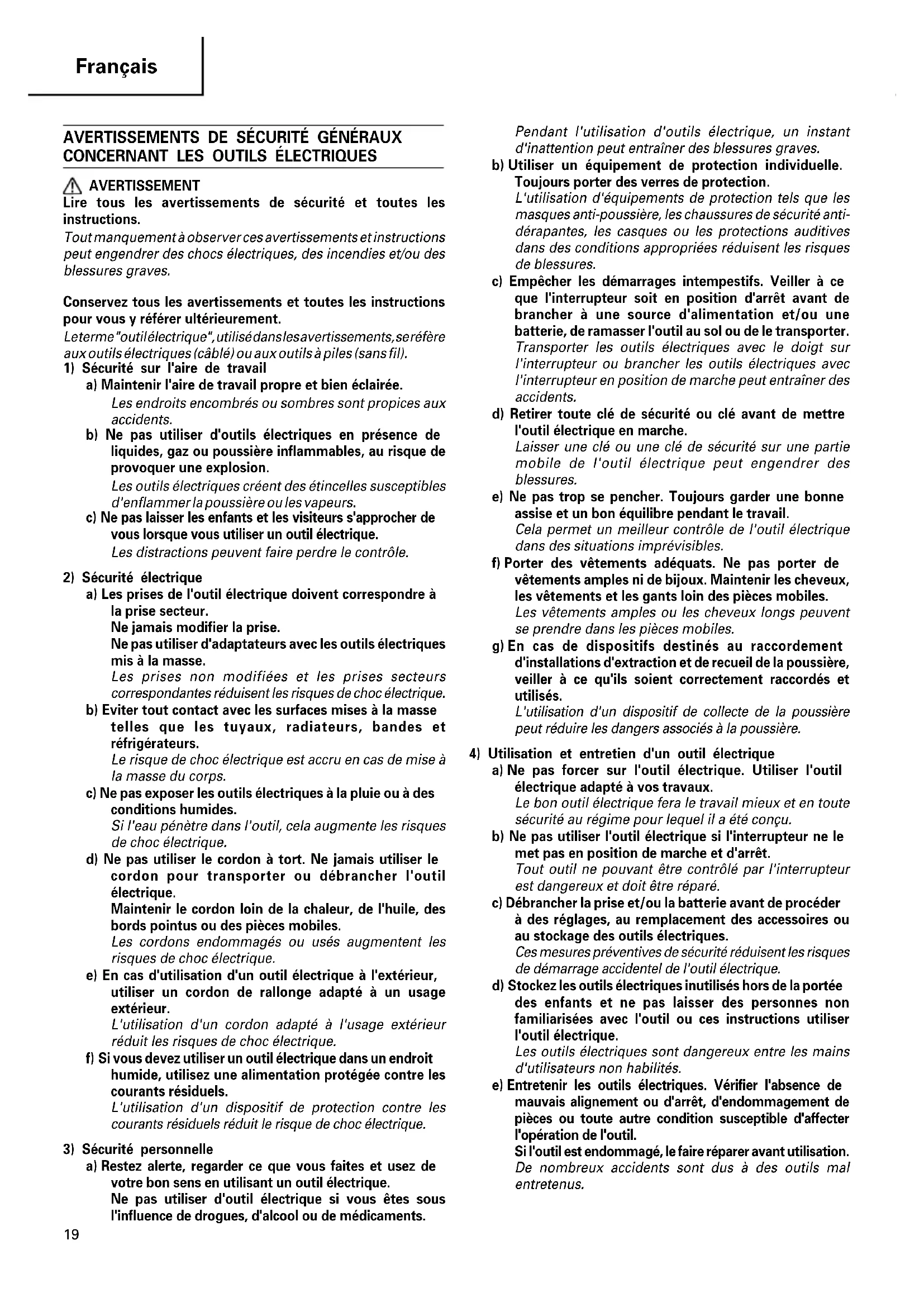 AVERTISSEMENT Lire tous les avertissements de sécurité et toutes les instructions. Tout manquement à observer ces avertissements et instructions peut engendrer des chocs électriques, des incendies et/ou des blessures graves. Conservez tous les avertissements et toutes les instructions pour vous y référer ultérieurement. Le terme "outil électrique", utilisé dans les avertissements, se réfère aux outils électriques (câblé) ou aux outils à piles (sans fil).