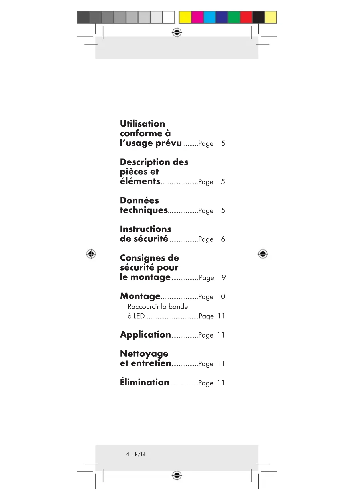 214 FR/BE Utilisation conforme à l’usage prévu .........Page 5 Description des pièces et éléments .....................Page 5 Données techniques .................Page 5 Instructions de sécurité ................Page 6 Consignes de sécurité pour le montage ............... Page 9 Montage .....................Page 10 Raccourcir la bande à LED ..............................Page 11 Application ...............Page 11 Nettoyage et entretien ...............Page 11 Élimination ................Page 115 FR/BE Bande LED Utilisation conforme à l’usage prévu Ce produit est uniquement conçu pour un usage intérieur. Ce produit est uniquement conçu pour un usage domestique privé et non pas pour un usage commercial. Description des pièces et éléments