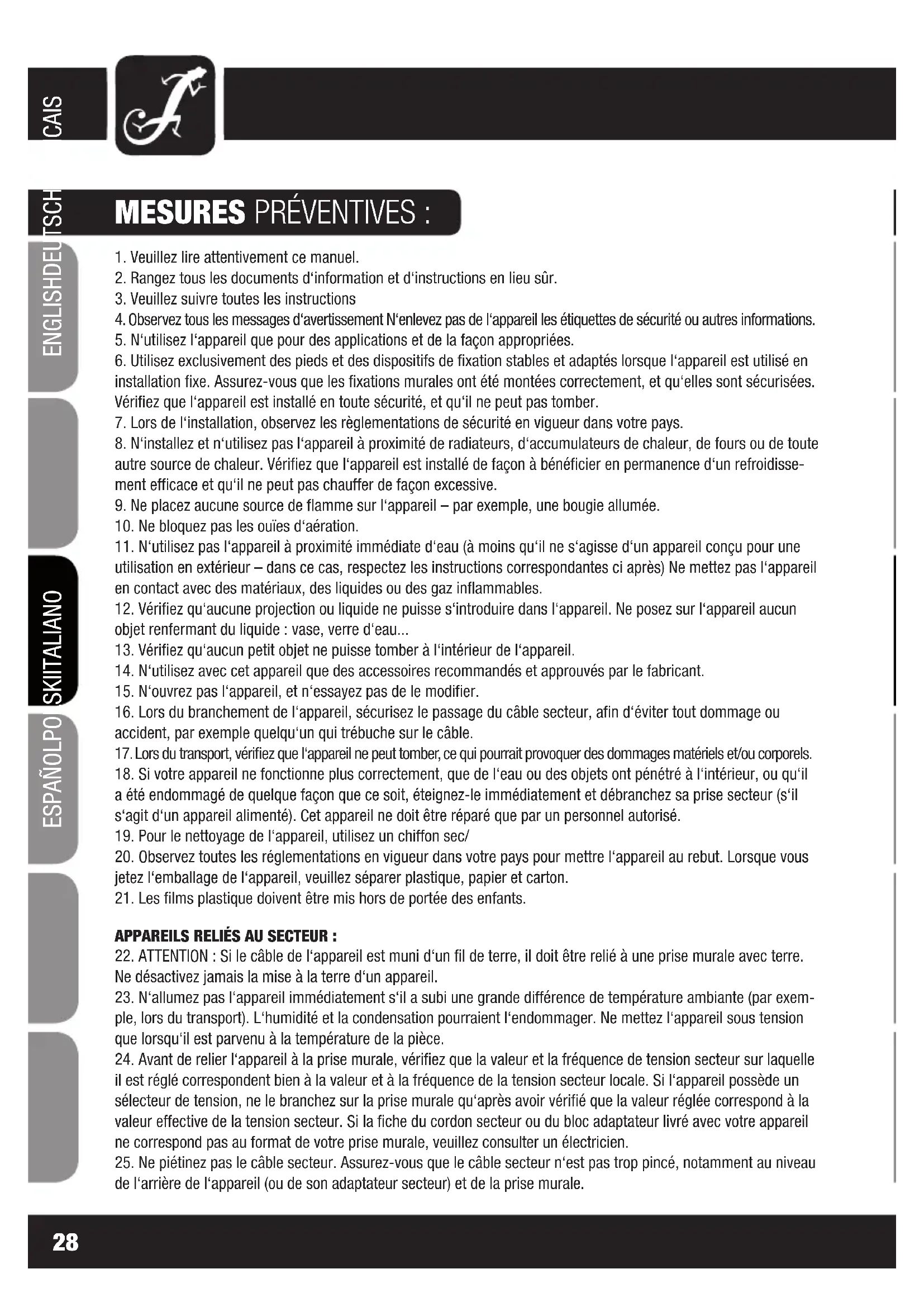 24. Avant de relier l‘appareil à la prise murale, vérifiez que la valeur et la fréquence de tension secteur sur laquelle