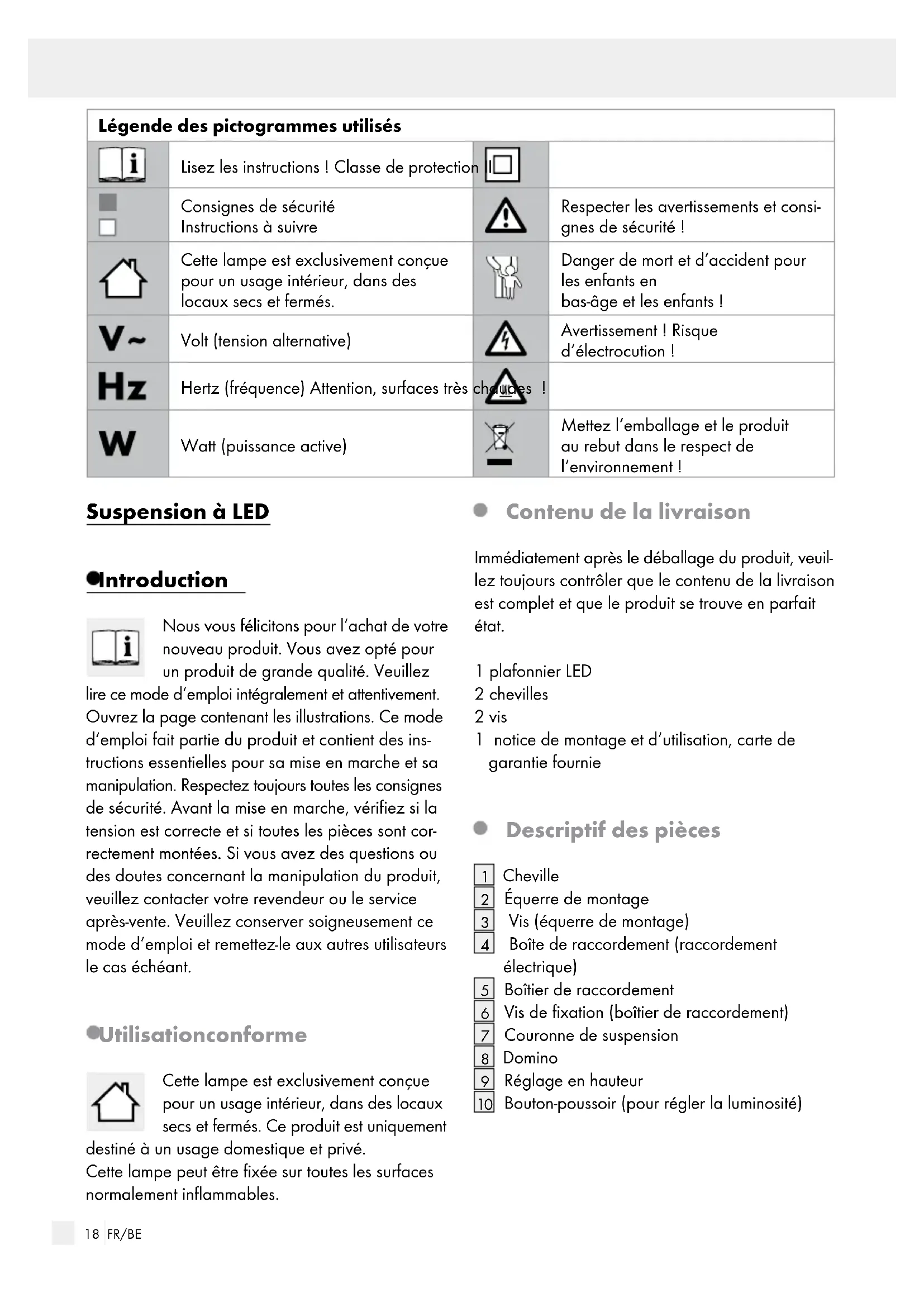 Non-warranty cases: Please return the unrepaired item, carriage paid. Please provide pricing. Repair the product against charge.17 FR/BE Légende des pictogrammes utilisés .......................................................................... Page 18 Introduction ................................................................................................................................... Page 18 Utilisation conforme ............................................................................................................................Page 18 Contenu de la livraison .......................................................................................................................Page 18 Descriptif des pièces ...........................................................................................................................Page 18 Caractéristiques techniques ................................................................................................................Page 19 Sécurité .............................................................................................................................................Page 19 Consignes de sécurité ......................................................................................................................... Page 19 Préparation ...................................................................................................................................Page 20 Outils et matériel nécessaires ............................................................................................................. Page 20 Avant l‘installation ..................................................................................................................Page 20 Mise en marche .......................................................................................................................... Page 20 Montage de la lampe .........................................................................................................................Page 20 Variation de la lampe .........................................................................................................................Page 20 Orientation de la lampe .....................................................................................................................Page 21 Entretien et nettoyage..........................................................................................................Page 21 Mise au rebut ............................................................................................................................... Page 21 Déclaration de conformité ................................................................................................ Page 21 Garantie / Service .....................................................................................................................Page 21 Garantie ..............................................................................................................................................Page 21 Adresse du service après-vente .......................................................................................................... Page 22 Carte de garantie ................................................................................................................................Page 22 Table des matièresWarranty / Service centre18 FR/BE Introduction / Sécurité Introduction Légende des pictogrammes utilisés Lisez les instructions! Classe de protection II Consignes de sécurité Instructions à suivre Respecter les avertissements et consi- gnes de sécurité ! Cette lampe est exclusivement conçue pour un usage intérieur, dans des locaux secs et fermés. Danger de mort et d’accident pour les enfants en bas-âge et les enfants ! Volt (tension alternative) Avertissement ! Risque d‘électrocution! Hertz (fréquence) Attention, surfaces très chaudes ! Watt (puissance active) Mettez l‘emballage et le produit au rebut dans le respect de l‘environnement ! Suspension à LED Introduction Nous vous félicitons pour l‘achat de votre nouveau produit. Vous avez opté pour un produit de grande qualité. Veuillez lire ce mode d‘emploi intégralement et attentivement. Ouvrez la page contenant les illustrations. Ce mode d‘emploi fait partie du produit et contient des ins- tructions essentielles pour sa mise en marche et sa manipulation. Respectez toujours toutes les consignes de sécurité. Avant la mise en marche, vérifiez si la tension est correcte et si toutes les pièces sont cor- rectement montées. Si vous avez des questions ou des doutes concernant la manipulation du produit, veuillez contacter votre revendeur ou le service après-vente. Veuillez conserver soigneusement ce mode d‘emploi et remettez-le aux autres utilisateurs le cas échéant. Utilisation conforme Cette lampe est exclusivement conçue pour un usage intérieur, dans des locaux secs et fermés. Ce produit est uniquement destiné à un usage domestique et privé. Cette lampe peut être fixée sur toutes les surfaces normalement inflammables. Contenu de la livraison Immédiatement après le déballage du produit, veuil- lez toujours contrôler que le contenu de la livraison est complet et que le produit se trouve en parfait état. 1 plafonnier LED 2 chevilles 2 vis 1 notice de montage et d‘utilisation, carte de garantie fournie Descriptif des pièces