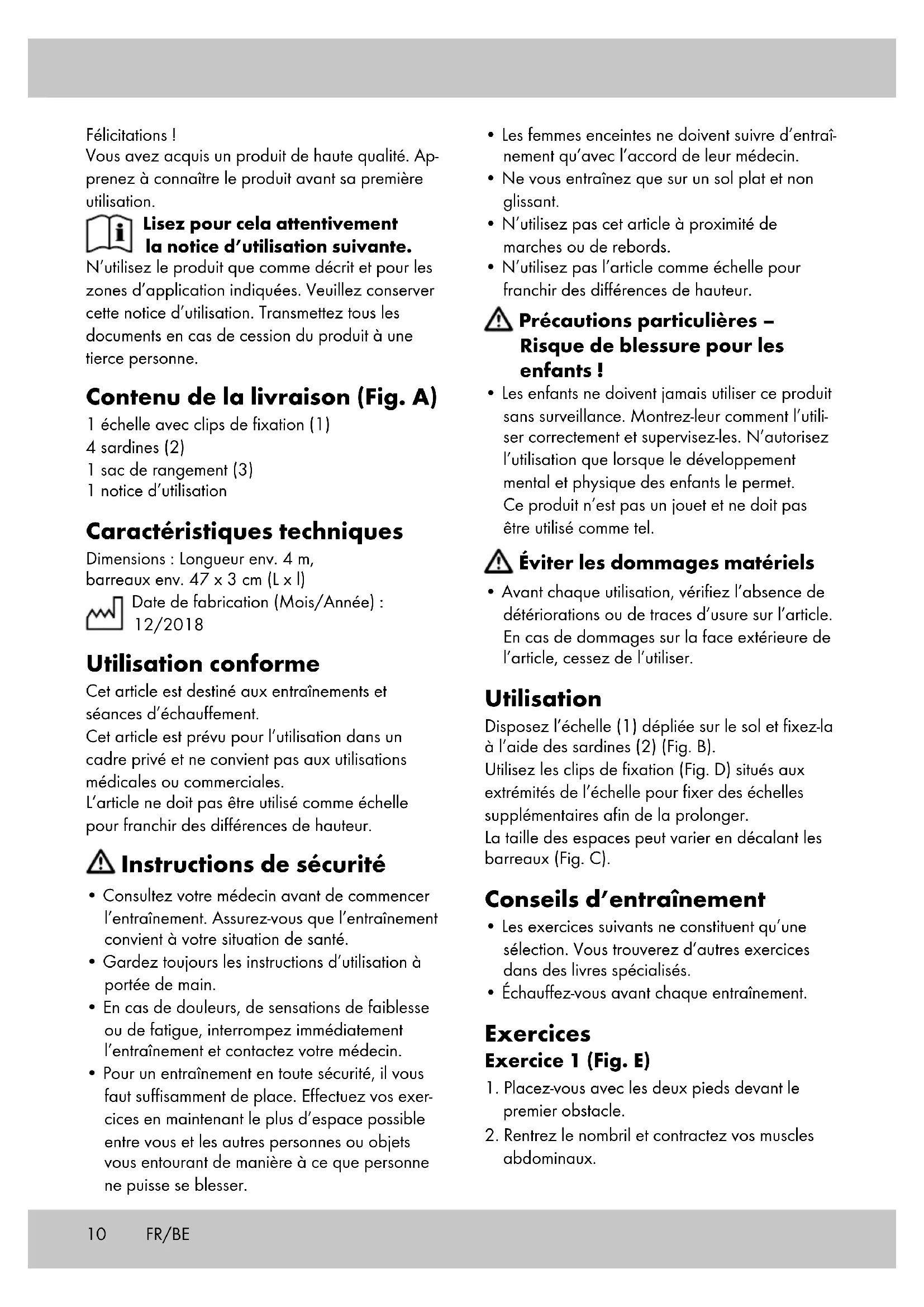 abdominaux. Félicitations ! Vous avez acquis un produit de haute qualité. Ap- prenez à connaître le produit avant sa première utilisation. Lisez pour cela attentivement lanotice d’utilisation suivante. N’utilisez le produit que comme décrit et pour les zones d’application indiquées. Veuillez conserver cette notice d’utilisation. Transmettez tous les documents en cas de cession du produit à une tierce personne. Contenu de la livraison (Fig. A) 1 échelle avec clips de fixation (1) 4 sardines (2) 1 sac de rangement (3) 1 notice d’utilisation Caractéristiques techniques Dimensions : Longueur env. 4 m, barreauxenv. 47 x 3 cm (L x l) Date de fabrication (Mois/Année) : 12/2018 Utilisation conforme Cet article est destiné aux entraînements et séances d’échauffement. Cet article est prévu pour l’utilisation dans un cadre privé et ne convient pas aux utilisations médicales ou commerciales. L’article ne doit pas être utilisé comme échelle pour franchir des différences de hauteur. Instructions de sécurité