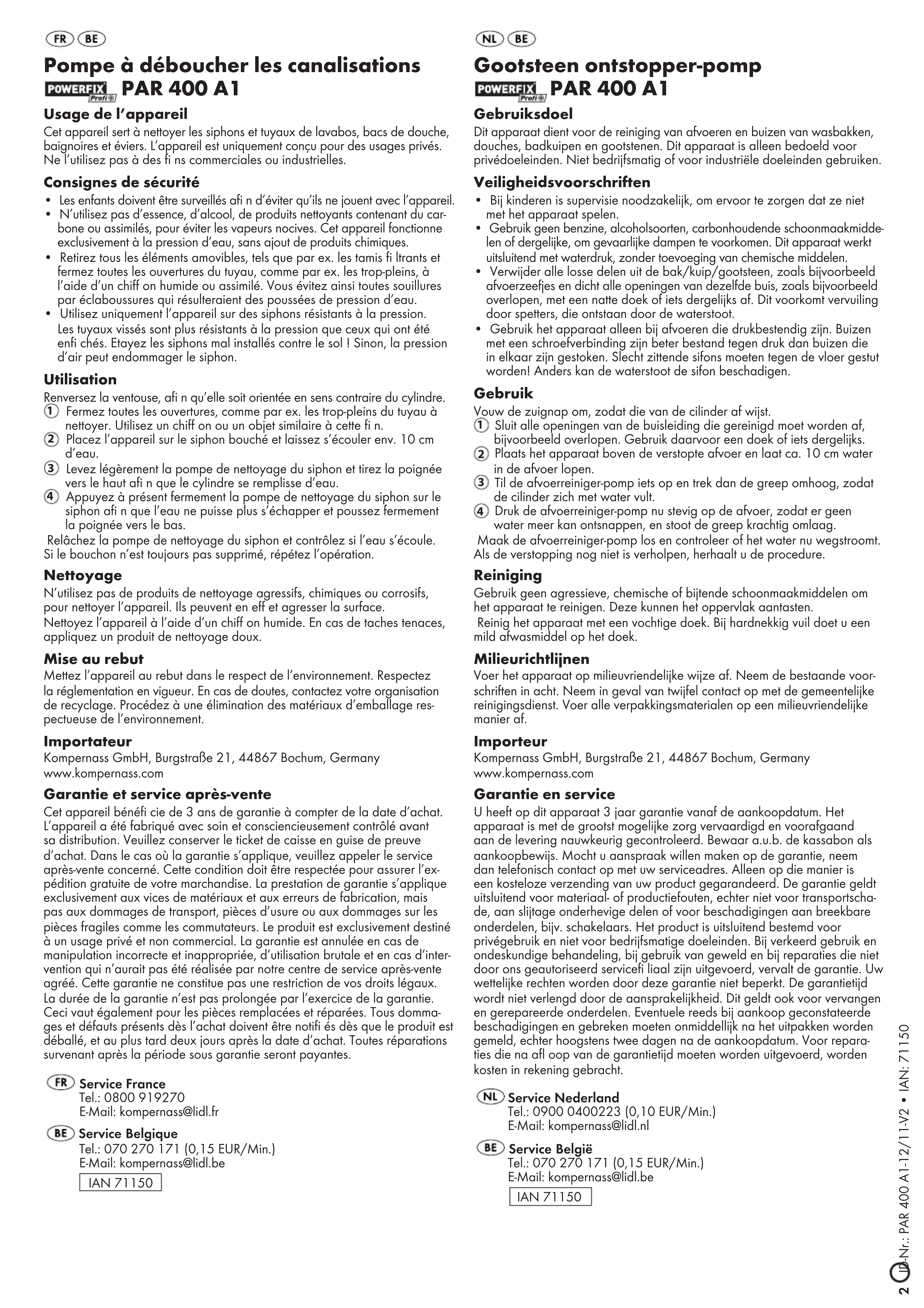 Appuyez à présent fermement la pompe de nettoyage du siphon sur le siphon afi n que l’eau ne puisse plus s’échapper et poussez fermement la poignée vers le bas. Relâchez la pompe de nettoyage du siphon et contrôlez si l’eau s’écoule. Si le bouchon n’est toujours pas supprimé, répétez l’opération. Nettoyage N’utilisez pas de produits de nettoyage agressifs, chimiques ou corrosifs, pour nettoyer l’appareil. Ils peuvent en eff et agresser la surface. Nettoyez l’appareil à l’aide d’un chiff on humide. En cas de taches tenaces, appliquez un produit de nettoyage doux. Mise au rebut Mettez l’appareil au rebut dans le respect de l’environnement. Respectez la réglementation en vigueur. En cas de doutes, contactez votre organisation de recyclage. Procédez à une élimination des matériaux d’emballage res- pectueuse de l’environnement. Importateur Kompernass GmbH, Burgstraße 21, 44867 Bochum, Germany www.kompernass.com Garantie et service après-vente Cet appareil bénéfi cie de 3 ans de garantie à compter de la date d’achat. L’appareil a été fabriqué avec soin et consciencieusement contrôlé avant sa distribution. Veuillez conserver le ticket de caisse en guise de preuve d’achat. Dans le cas où la garantie s’applique, veuillez appeler le service après-vente concerné. Cette condition doit être respectée pour assurer l’ex- pédition gratuite de votre marchandise. La prestation de garantie s’applique exclusivement aux vices de matériaux et aux erreurs de fabrication, mais pas aux dommages de transport, pièces d’usure ou aux dommages sur les pièces fragiles comme les commutateurs. Le produit est exclusivement destiné à un usage privé et non commercial. La garantie est annulée en cas de manipulation incorrecte et inappropriée, d’utilisation brutale et en cas d’inter- vention qui n’aurait pas été réalisée par notre centre de service après-vente agréé. Cette garantie ne constitue pas une restriction de vos droits légaux. La durée de la garantie n’est pas prolongée par l’exercice de la garantie. Ceci vaut également pour les pièces remplacées et réparées. Tous domma- ges et défauts présents dès l’achat doivent être notifi és dès que le produit est déballé, et au plus tard deux jours après la date d’achat. Toutes réparations survenant après la période sous garantie seront payantes. Service France Tel.: 0800 919270 E-Mail: kompernass@lidl.fr Service Belgique Tel.: 070 270 171 (0,15 EUR/Min.) E-Mail: kompernass@lidl.be IAN 71150 Gootsteen ontstopper-pomp PAR 400 A1 Gebruiksdoel Dit apparaat dient voor de reiniging van afvoeren en buizen van wasbakken, douches, badkuipen en gootstenen. Dit apparaat is alleen bedoeld voor privédoeleinden. Niet bedrijfsmatig of voor industriële doeleinden gebruiken. Veiligheidsvoorschriften