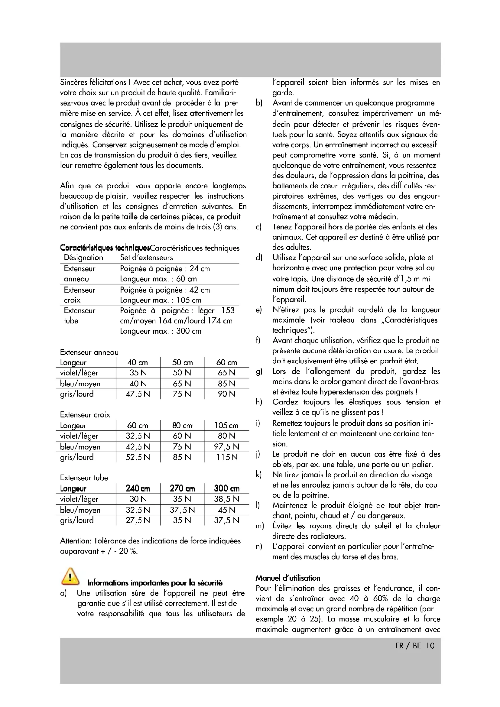 a) Une utilisation sûre de l'appareil ne peut être garantie que s'il est utilisé correctement. Il est de votre responsabilité que tous les utilisateurs de l'appareil soient bien informés sur les mises en garde. b) Avant de commencer un quelconque programme d'entraînement, consultez impérativement un mé- decin pour détecter et prévenir les risques éven- tuels pour la santé. Soyez attentifs aux signaux de votre corps. Un entraînement incorrect ou excessif peut compromettre votre santé. Si, à un moment quelconque de votre entraînement, vous ressentez des douleurs, de l'oppression dans la poitrine, des battements de cflur irréguliers, des difficultés res- piratoires extrêmes, des vertiges ou des engour- dissements, interrompez immédiatement votre en- traînement et consultez votre médecin. c) Tenez l'appareil hors de portée des enfants et des animaux. Cet appareil est destiné à être utilisé par des adultes. d) Utilisez l'appareil sur une surface solide, plate et horizontale avec une protection pour votre sol ou votre tapis. Une distance de sécurité d'1,5 m mi- nimum doit toujours être respectée tout autour de l'appareil. e) NÂétirez pas le produit au-delà de la longueur maximale (voir tableau dans ıCaractéristiques techniques„). f) Avant chaque utilisation, vérifiez que le produit ne présente aucune détérioration ou usure. Le produit doit exclusivement être utilisé en parfait état. g) Lors de lÂallongement du produit, gardez les mains dans le prolongement direct de lÂavant-bras et évitez toute hyperextension des poignets ! h) Gardez toujours les élastiques sous tension et veillez à ce quÂils ne glissent pas !