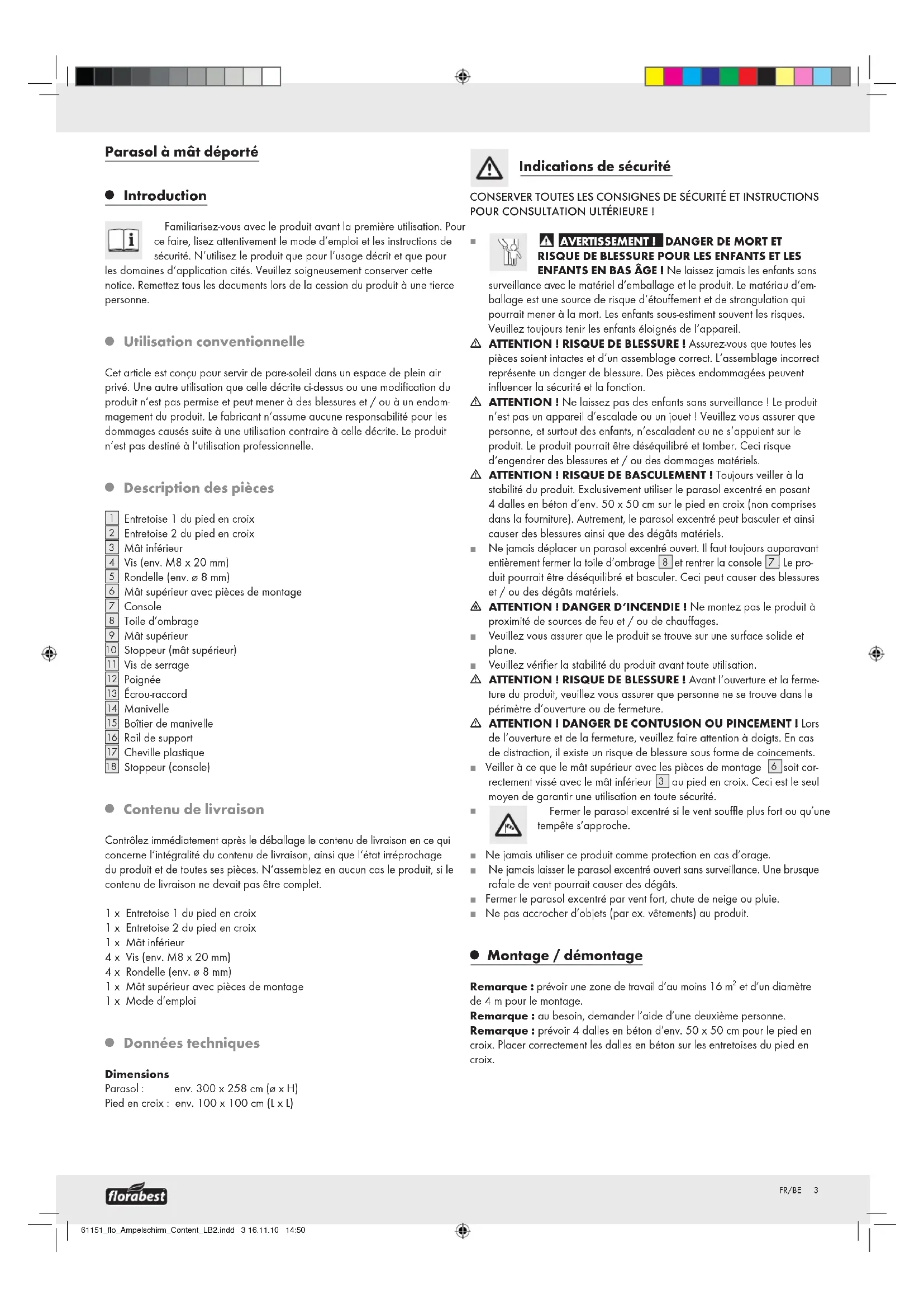 Données techniques Dimensions Parasol : env. 300 x 258 cm (ø x H) Pied en croix : env. 100 x 100 cm (L x L) Indications de sécurité CONSERVER TOUTES LES CONSIGNES DE SÉCURITÉ ET INSTRUCTIONS POUR CONSULTATION ULTÉRIEURE !