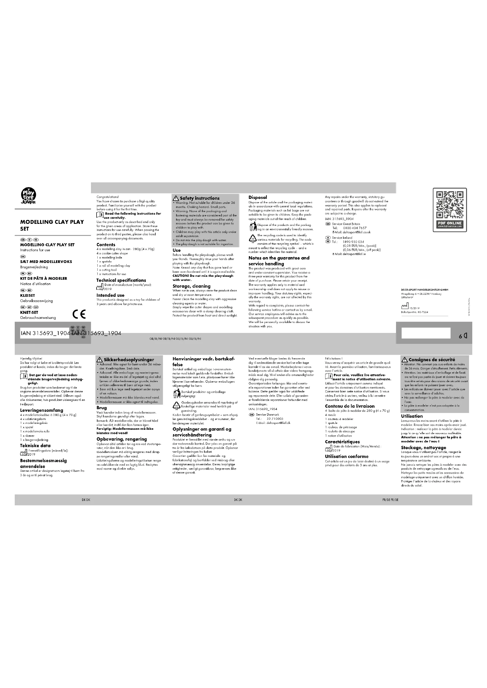 - La pâte à modeler n‘est pas adaptée à la consommation. Utilisation Lavez-vous les mains avant d‘utiliser la pâte à modeler. Rincez bien vos mains après avoir joué. Indication : malaxer la pâte à modeler durcie jusqu‘à ce qu‘elle soit de nouveau malléable. Attention : ne pas mélanger la pâte à modeler avec de l‘eau ! Stockage, nettoyage Lorsque vous n’utilisez pas l’article, rangez-le toujours dans un endroit sec et propre à une température ambiante. Ne jamais nettoyer les pâtes à modeler avec des produits de nettoyage agressifs ou de l‘eau. Nettoyer les petits moules et les accessoires de modelage uniquement avec un chiffon humide. Protéger l‘article de la chaleur et des rayons directs du soleil. Any repairs under the warranty, statutory gu- arantees or through goodwill do not extend the warranty period. This also applies to replaced and repaired parts. Repairs after the warranty are subject to a charge. IAN: 315693_1904 Service Great Britain Tel.: 0800 404 7657 E-Mail: deltasport@lidl.co.uk Service Ireland Tel.: 1890 930 034 (0,08 EUR/Min., (peak)) (0,06 EUR/Min., (off peak)) E-Mail: deltasport@lidl.ie
