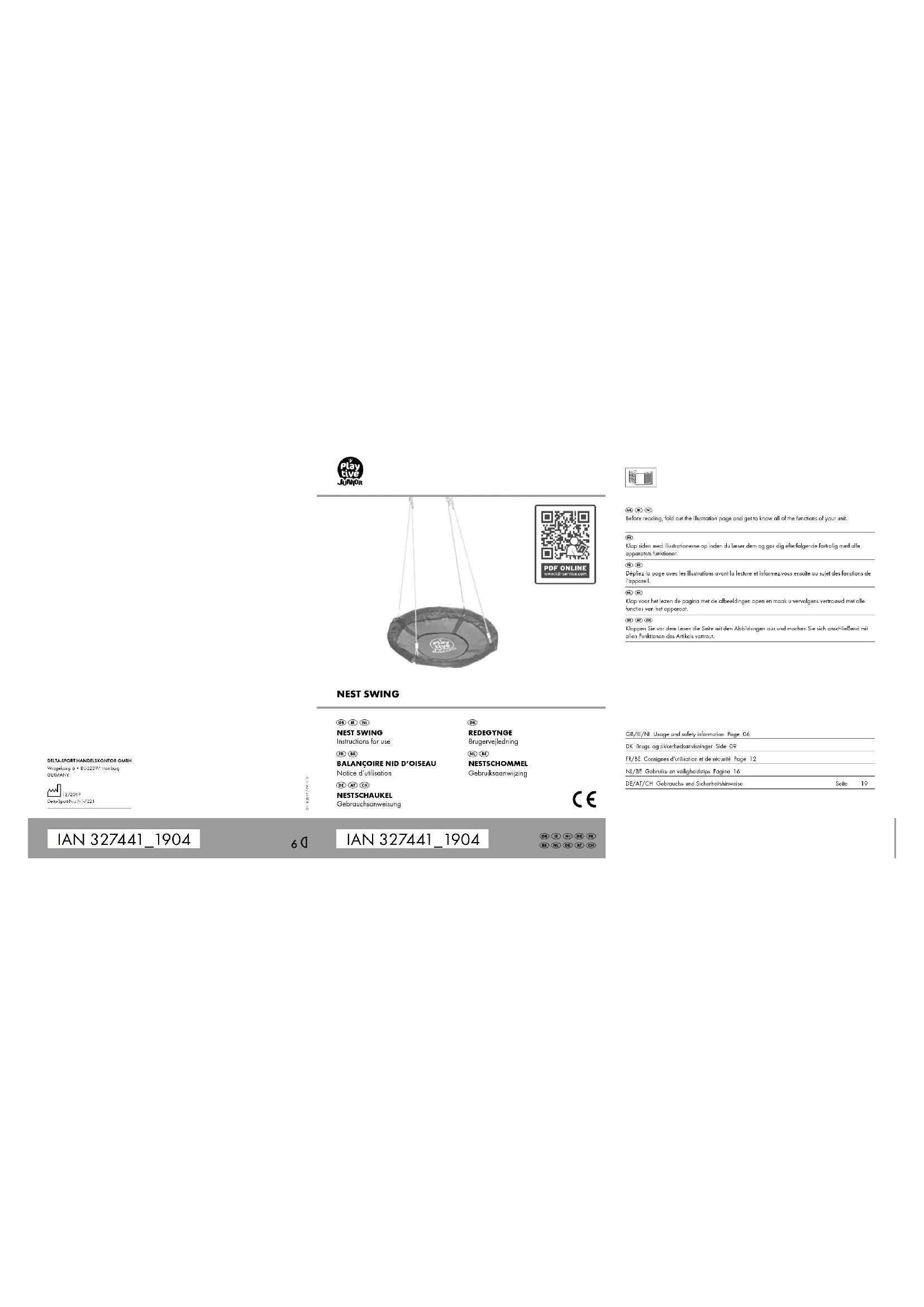 - Lors de l‘utilisation de l‘article, veillez à ce que votre enfant ne porte pas de casque ou de vêtements à cordelettes/lacets dans la mesure où ceux-ci pourraient s‘accrocher et l‘enfant pourrait être blessé. Félicitations ! Vous venez d’acquérir un article de grande qualité. Avant la première utilisation, familiari- sez-vous avec l’article. Pour cela, veuillez lire attentive- ment la notice d’utilisation suiva- nte. Utilisez l’article uniquement comme indiqué et pour les domaines d’utilisation mentionnés. Conservez bien cette notice d’utilisation. Si vous cédez l’article à un tiers, veillez à lui remettre l’ensemble de la documentation. Contenu de la livraison (fig. A) 1 x balançoire nid d’oiseau (1) 4 x renforts latéraux (2) 2 x suspensions (3) 1 x clé (4) 1 x notice d‘utilisation Caractéristiques techniques Charge portante maximale de l‘article : 150 kg Réglable en hauteur : 105 à 180 cm Dimensions : Ø env. 113 cm Date de fabrication (Mois/Année) : 12/2019 Utilisation conforme L‘article est conçu comme un jeu destiné à un usage privé par les enfants de plus de 36 mois. L‘article ne doit pas être utilisé sur des emplace- ments publics comme les terrains de jeux, dans les écoles etc. Consignes de sécurité Risque de blessure !