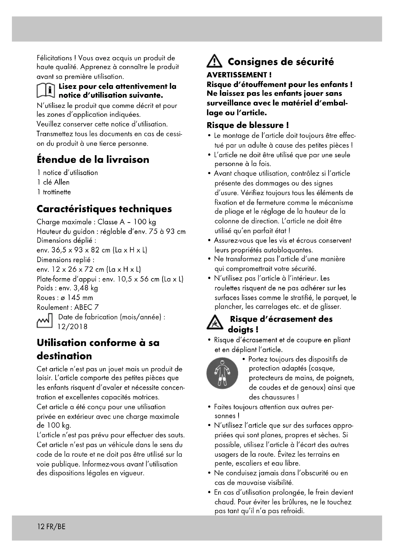 - Avant chaque utilisation, contrôlez si l’article présente des dommages ou des signes d’usure. Vérifiez toujours tous les éléments de fixation et de fermeture comme le mécanisme de pliage et le réglage de la hauteur de la colonne de direction. L’article ne doit être utilisé qu’en parfait état !