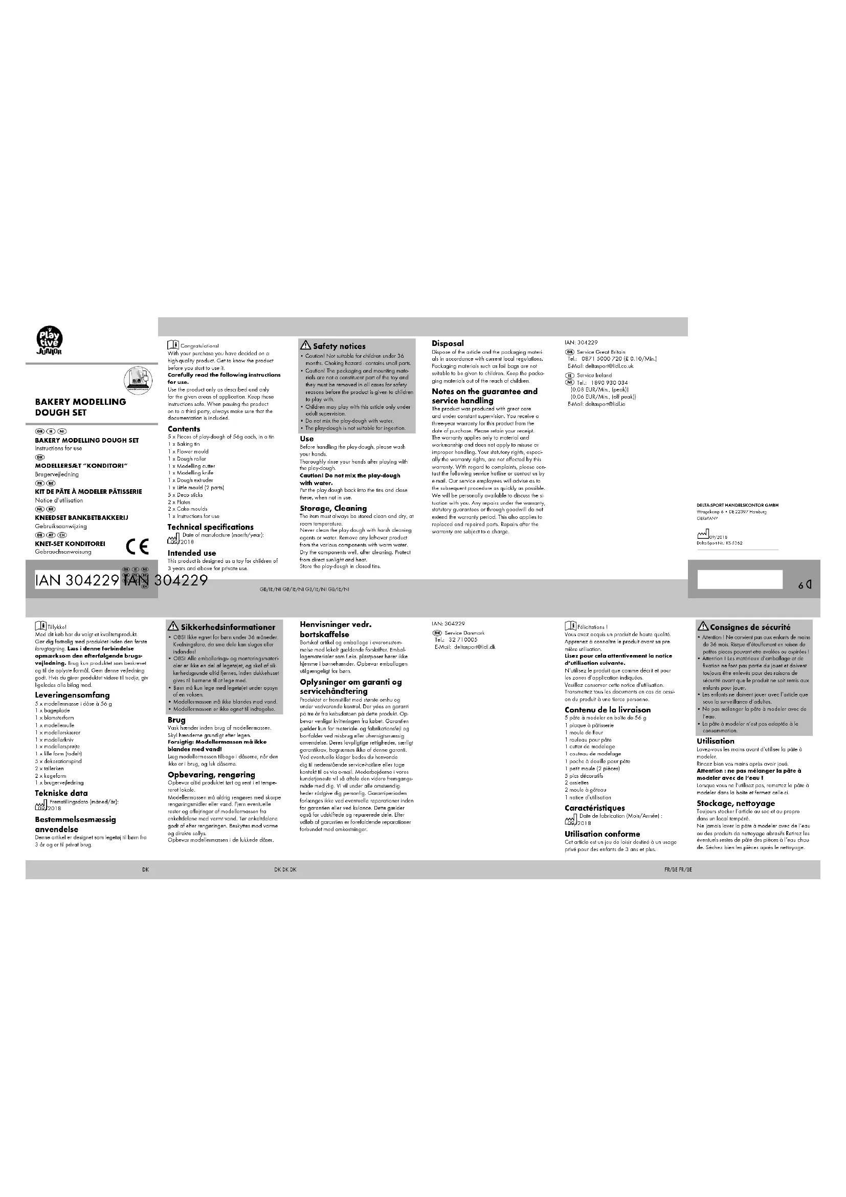 - Attention ! Ne convient pas aux enfants de moins de 36 mois. Risque d‘étouffement en raison de petites pieces pouvant etre avalées ou aspirées !• Attention ! Les matériaux d‘emballage et de fixation ne font pas partie du jouet et doivent toujours être enlevés pour des raisons de sécurité avant que le produit ne soit remis aux enfants pour jouer.• Les enfants ne doivent jouer avec l‘article que sous la surveillance d‘adultes.• Ne pas mélanger la pâte à modeler avec de l‘eau.• La pâte à modeler n‘est pas adaptée à la consommation. Utilisation Lavez-vous les mains avant d‘utiliser la pâte à modeler.Rincez bien vos mains après avoir joué.Attention : ne pas mélanger la pâte à modeler avec de l‘eau !Lorsque vous ne l‘utilisez pas, remettez la pâte à modeler dans la boîte et fermez celle-ci. Stockage, nettoyage Toujours stocker l‘article au sec et au propre dans un local tempéré.Ne jamais laver la pâte à modeler avec de l‘eau ou des produits de nettoyage abrasifs Retirez les éventuels restes de pâte des pièces à l‘eau chau-de. Séchez bien les pièces après le nettoyage. IAN 304229 IAN 304229