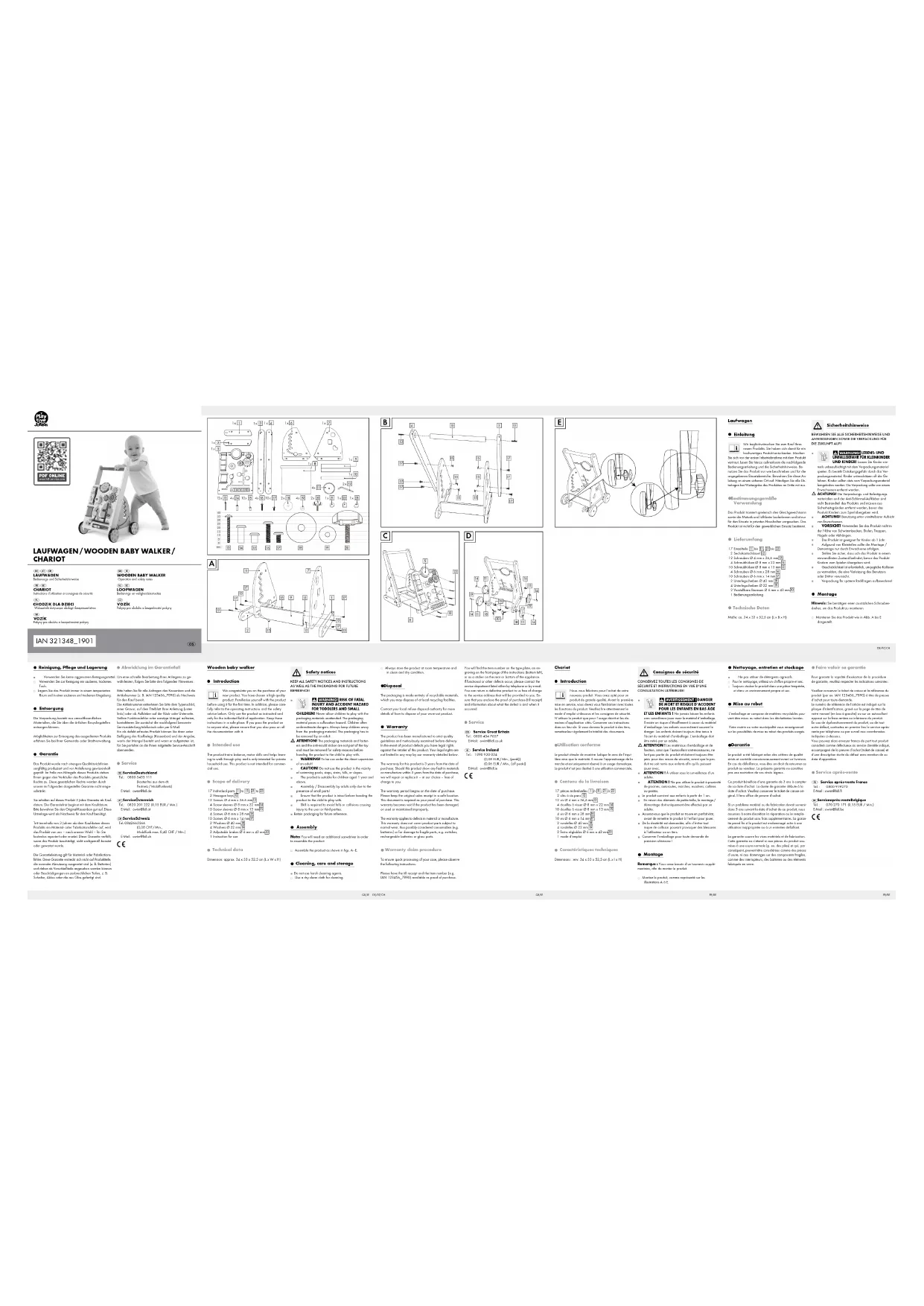 ET LES ENFANTS ! Ne jamais laisser les enfants sans surveillance jouer avec le matériel d‘emballage. Il existe un risque d‘étouffement à cause du matériel d‘emballage. Les enfants sous-estiment souvent le danger. Les enfants doivent toujours être tenus à l‘écart du matériel d‘emballage. L‘emballage doit être retiré par un adulte. ATTENTION ! Les matériaux d‘emballage et de fixation, ainsi que l‘autocollant anti-moisissures, ne font pas partie du produit et doivent toujours être jetés pour des raison de sécurité, avant que le pro- duit ne soit remis aux enfants afin qu‘ils puissent jouer avec. ATTENTION! À utiliser sous la surveillance d’un adulte. ATTENTION! Ne pas utiliser le produit à proximité de piscines, autoroutes, marches, escaliers, collines ou pentes. Le produit convient aux enfants à partir de 1 an. En raison des éléments de petite taille, le montage / démontage doit uniquement être effectué par un adulte. Assurez-vous que le produit se trouve en parfait état, avant de remettre le produit à l‘enfant pour jouer. De la dextérité est demandée, afin d‘éviter tout risque de collision pouvant provoquer des blessures à l‘utilisateur ou un tiers. Conserver l‘emballage pour toute demande de précision ultérieure ! Montage Remarque : Vous avez besoin d‘un tournevis supplé- mentaire, afin de monter le produit. Montez le produit, comme représenté sur les illustrations A à E. Wooden baby walker Introduction We congratulate you on the purchase of your new product. You have chosen a high quality product. Familiarise yourself with the product before using it for the first time. In addition, please care- fully refer to the operating instructions and the safety advice below. Only use the product as instructed and only for the indicated field of application. Keep these instructions in a safe place. If you pass the product on to anyone else, please ensure that you also pass on all the documentation with it. Intended use The product trains balance, motor skills and helps learn- ing to walk through play and is only intended for private household use. This product is not intended for commer- cial use. Scope of delivery 17 Individual parts