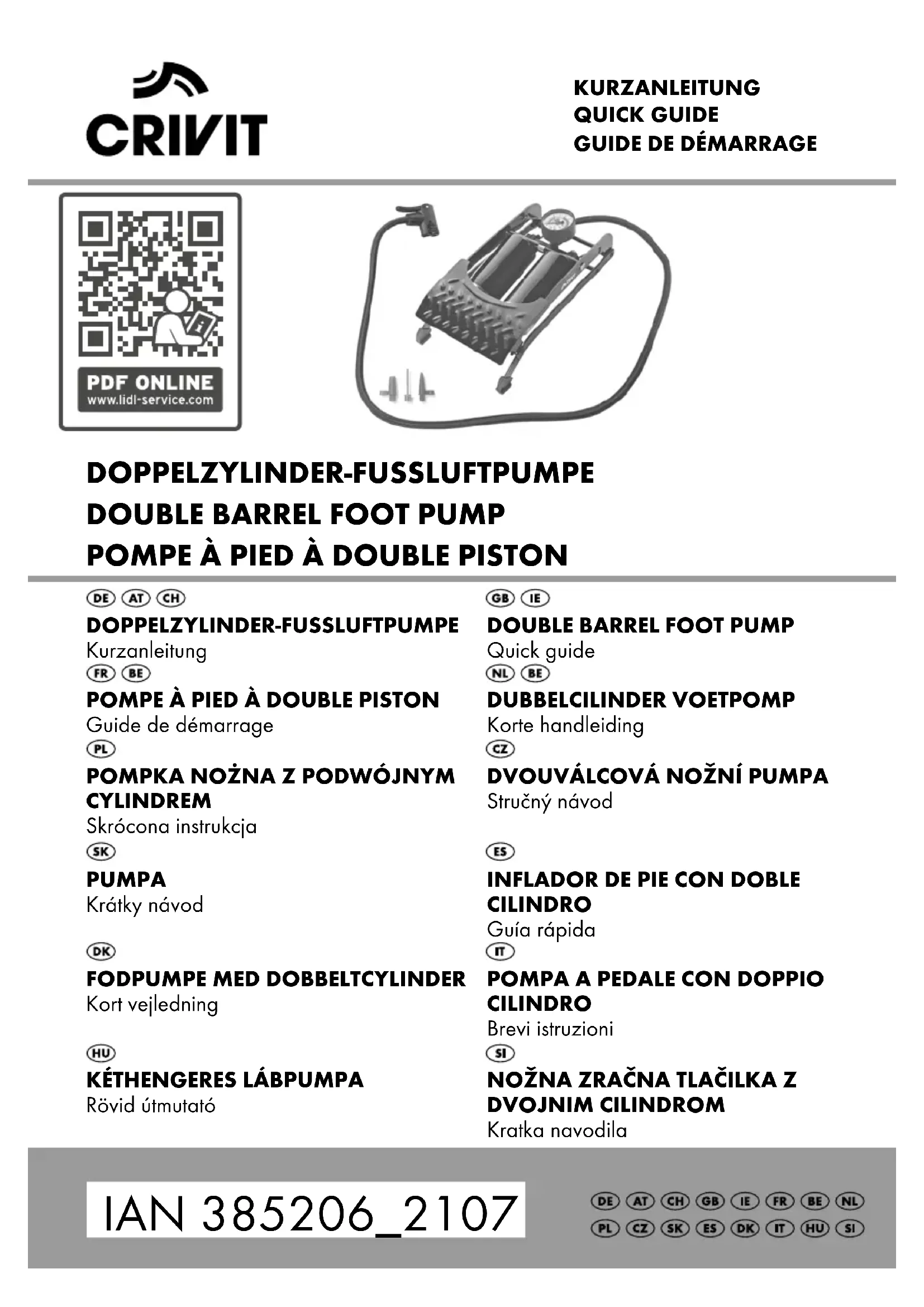 - Risque d’écrasement ! Uniquement pour une commande à pied. Non destiné à un usage à main. Mise en service Attention ! L’article est prétendu avec un ressort et se déploie rapidement à l’ouverture. Placez l’article au sol. Abaissez la pédale (1) d’une main et déverrouillez le support de fixa- tion (2) avec l’autre main (Fig. B). Remarque : Faites attention à ce que l’étrier de fixation soit bien positionné ! Rabattez l’étrier de fixation vers l’extérieur. Pour verrouiller la pompe, procédez dans l’ordre inverse. Utilisation L’article ne doit être utilisé que sur un sol de niveau, stable. Le tuyau de la pompe (3) ne doit pas être plié. Pour gonfler un objet, actionnez la pédale uniformément et pas trop rapidement. Ne sollicitez pas la pédale au centre, afin d’évi- ter un blocage. FR/BE9FR/BE Gonflage des pneus avec valve Sclaverand (Fig. I) Ouvrez la valve du pneu. Desserrez l’écrou de la valve. Poussez la petite ouverture (7) de la tête de pompe double dans la valve. Relevez le levier de serrage (4) pour verrouiller l’adapta- teur. Stockage, nettoyage Toujours stocker l’article au sec et au propre dans un local tempéré. Ne plongez jamais l’article dans de l’eau sinon il s’abîmera ! Important ! Laver uniquement avec un chiffon humide, puis sécher en frottant. Appliquez occasionnellement un peu d’huile sur les parties mobiles. Remarque : l’écran du manomètre affiche un re- père rouge (9) sous la forme d’une flèche. Avec ce repère rouge, vous pouvez régler la pression maximale souhaitée comme repère visuel. Tournez le boîtier du manomètre vers la gauche ou vers la droite (Fig. C). Veuillez noter que l’affichage réglé sert uniquement à l’orientation et n’influence pas le pompage ! Choix de l’ouverture (fig. D) La pompe à deux embouts dispose de deux ouvertures. La petite ouverture avec l’inscription Presta ou avec le dessin d’une valve étroite convient aux valves Sclaverand et Dunlop. La grande ouverture avec l’inscription Schrader ou avec le dessin d’une valve large convient aux valves Schrader. Choisissez l’ouverture appro- priée avant de commencer à gonfler. Gonflage de ballons (Fig. E) Insérez l’adaptateur pour ballons (6) dans la grande ouverture (8) de la tête de pompe double. Relevez le levier de serrage (4) pour verrouiller l’adaptateur. Insérez ensuite l’adaptateur dans le ballon. Gonflage d’articles gonflables (Fig. F) Ouvrez la valve de l’article gonflable. Insérez l’adaptateur approprié pour articles gonflables (5) dans la grande ouverture (8) de la tête de pompe double. Relevez le levier de serrage (4) pour verrouiller l’adaptateur. Insérez ensuite l’adaptateur dans la valve de l’article gonflable. Gonflage des pneus avec valve flash (Fig. G) Ouvrez la valve du pneu. Poussez la petite ouverture (7) de la tête de pompe double dans la valve. Relevez le levier de serrage (4) pour verrouiller l’adaptateur. Gonflage des pneus avec valves Schrader (Fig. H) Ouvrez la valve du pneu. Poussez la grande ouverture (8) de la tête de pompe double dans la valve. Relevez le levier de serrage (4) pour verrouiller l’adaptateur.10 Bij dit document gaat het om een verkorte gedrukte editie van de volledige gebruiksaan- wijzing. Door de QR-code te scannen, geraakt u direct op de Lidl servicepagina (www.lidl-ser- vice.com) en kunt u door het artikelnummer (IAN) 385206_2107 in te voeren de volledige gebruiksaanwijzing inkijken en downloaden. WAARSCHUWING! Neem de volledige gebruiksaanwijzing en de veiligheidstips in acht om letsel- en materiële schade te vermijden. De korte handleiding vormt een vast bestanddeel van dit artikel. Maak u vóór het gebruik van het artikels vertrouwd met alle gebruiks- en veilig- heidstips. Bewaar de korte handleiding goed en overhandig alle documenten mee aan derden als het artikel doorgegeven wordt. Leveringsomvang (afb. A) 1 x dubbelcilinder voetpomp 2 x adapter voor opblaasbare artikelen (5) 1 x adapter voor ballen (6) 1 x korte handleiding Technische gegevens Nominale druk: 5 bar/73 psi Afmetingen: ca. 290 x 150 x 95 mm (l x b x h) Productiedatum (maand/jaar): 01/2022 Beoogd gebruik Dit artikel is geschikt voor particulier gebruik voor het oppompen van alle gangbare fietsban- den met schrader-, blitz- en sclaverandventielen, en voor het oppompen van ballen, luchtbedden en soortgelijke opblaasbare artikelen. Veiligheidstips Kans op lichamelijk letsel!