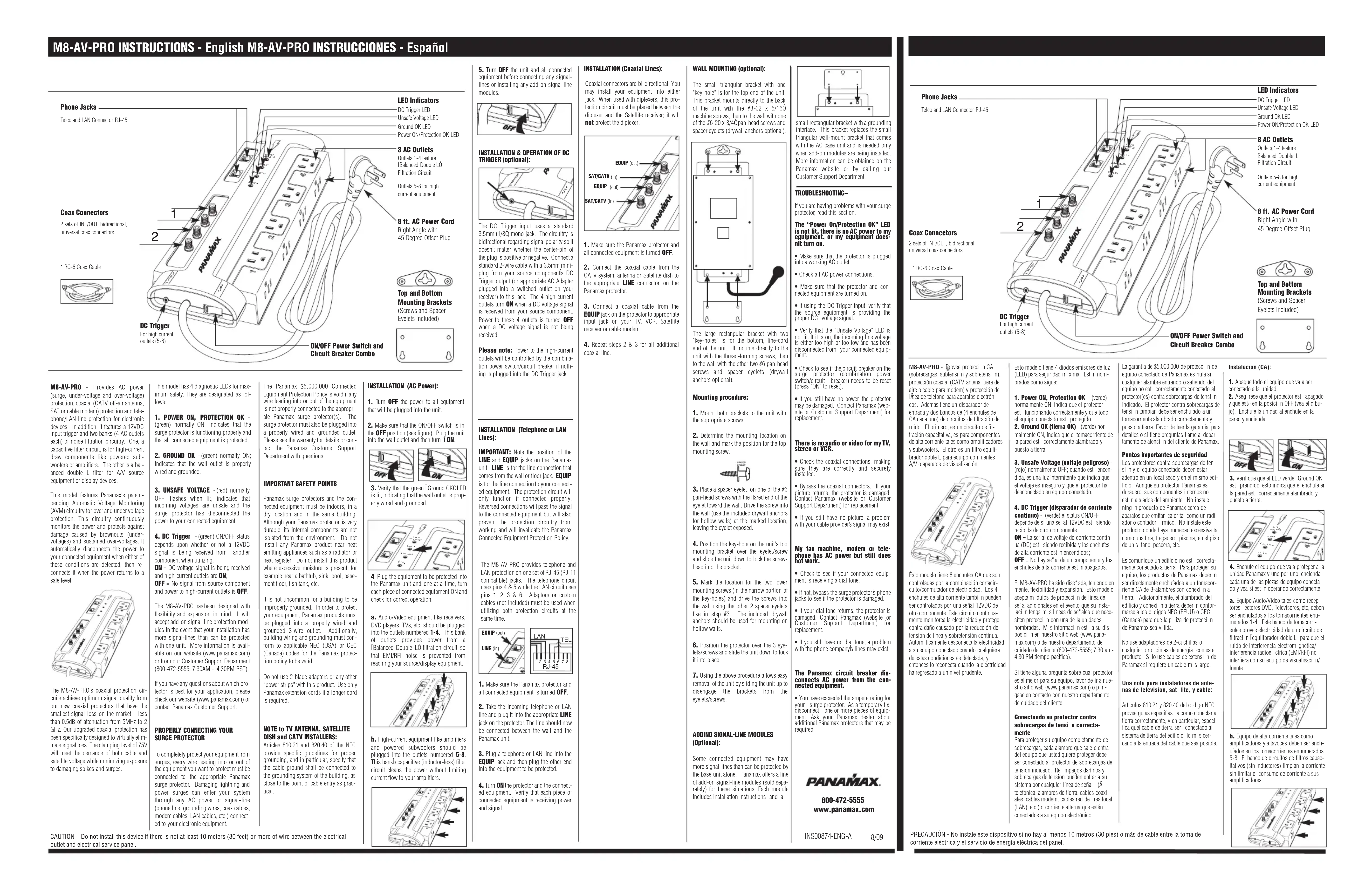 position de MARCHE/ARRÊT (ON/OFF) est déterminée selon s’il y a présence ou non d’un signal de 12 V de courant continu provenant d’une autre composante. Sous tension (ON) = un signal de courant continu est reçu et les prises à haute intensité sont sous tension; Hors ttension (OFF) = aucun signal provenant d’une composante source et le courant vers les prises à haute intensité est hors tension. Par sa conception, le M8-AV-PRO prévoit la flexibilité et l’expansion. Le modèles accept les modules d’appoint pour augmenter la capacité de protection des lignes de signaux dans l’éventualité qu’un limiteur ne soit pas suffisant pour protéger toute votre installa- tion. Pour plus d’information, veuillez visiter notre site Web (www.panamax.com) ou com- muniquer avec le Service à la clientèle au 800-472-5555 entre 7h30 et 16h30 HNP). Si vous avez besoin d’aide dans la sélection du produit qui convient le mieux à votre application, veuillez consulter notre site Web (www.panamax.com) ou communiquez avec le Service à la clientèle. Raccordement correct du limiteur de surtension Pour assurer la protection complète de vos appareils contre les surtensions, chaque fil entrant ou sortant des appareils à protéger doit être raccordé à un limiteur de surtension Panamax convenable à ces appareils. Les effets endommageant de la foudre et des surtensions peuvent atteindre votre système via toutes les entrées de courant alternatif et toutes les lignes de signaux (lignes télé- phoniques, fils de mise à la terre, câbles coaxiaux, câbles modem, câbles LAN, etc.) raccordées à votre équipement électrique. Avis de sécurité important Les limiteurs de surtension Panamax ainsi que les appareils qui lui sont raccordés doivent être à l’intérieur, dans un emplace- ment sec et dans le même bâtiment. Quoique votre limiteur Panamax est très résistant, les composants internes ne sont pas à l’épreuve de l’environnement. Les produits Panamax ne doivent pas être installés en proximité d’appareils qui émet- tent de la chaleur tels que des radiateurs ou les registres d’air chaud. Ce produit ne doit pas être installé dans un endroit humide tel que proche d’une baignoire, un lavabo, une piscine, un plancher de sous- sol, un aquarium etc. Il arrive fréquemment que le câblage d’un bâtiment ne soit pas correctement mis à la terre. Afin de bien protéger vos appareils, les produits Panamax doivent être branchés dans des prises de courant à 3 broches correctement câblées et mises à la terre. De plus, pour que la garantie Panamax soit valide le câblage et la mise à la terre du bâtiment doivent être conformes aux normes NEC (É.U.) ou CEC (Canada). N’utilisez pas d’adaptateurs à deux broches ou autres limiteurs avec ce produit. S’il est nécessaire d’utiliser une rallonge élec- trique, utilisez uniquement celle de marque Panamax. M8-AV-PRO – Protège les appareils électroniques à tension alternative, les câbles coaxiaux (Câblodistribution, antenne de télévision standard ou modems câble) et les lignes téléphoniques contre les variations, la sous-tension et la surten- sion. De plus, le limiteur est doté d’une entrée de déclenchement de 12 V de courant continu et de 2 blocs de prises (4 prises CA chacun) pour le circuit de filtra- tion du bruit. Dont un circuit capacitif avec filtre pour les appareils à haute ten- sion tels que les caissons de basse ampli- fiés et les amplificateurs. L’autre, un filtre symétrique à double L pour l’équipement audio-vidéo ou des appareils d’affichage. Ce appareil est dotés de 8 prises CA com- mandées par un combiné interrupteur marche/arrêt et disjoncteur. Les 4 prises à haute intensité peuvent être également com- mandées par un signal 12 V de courant continu provenant d’un autre composant. Ces circuits surveillent le courant et protè- gent les appareils contre les dommages causés par les baisses de tension et les surtensions prolongées. Le limiteur coupe automatiquement le courant vers vos appareils branchés lorsqu’une de ces situa- tions est détectée et ce jusqu’à ce que le courant redevienne normal. Ce modèles de limiteur ont 4 témoins de diagnostic DEL pour une sécurité accrue. L’assignation de ces témoins est la suivante: