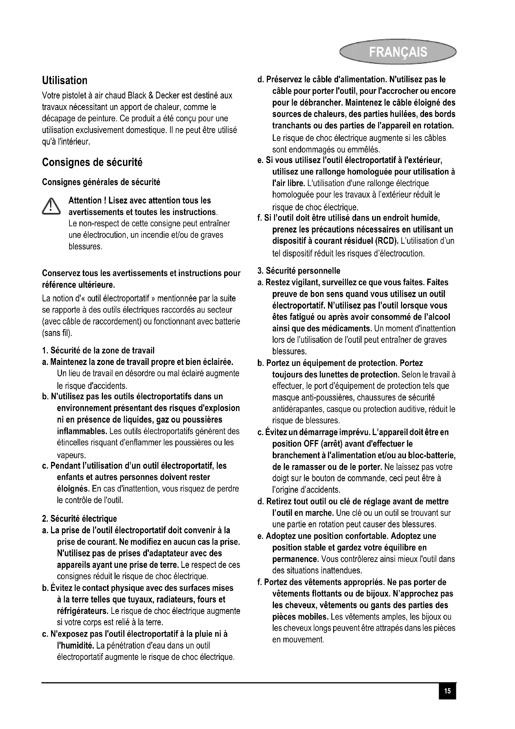 itte besuchen Sie unsere Webseite www.blackanddecker.de, um Ihr neues Black & Decker- Produkt zu registrieren. Dort erhalten Sie auch Informationen über neue Produkte und Sonderangebote. Weitere Informationen über die Marke Black & Decker und unsere Produkte finden Sie unter www.blackanddecker.de.15 FRANÇAIS Français Utilisation Votre pistolet à air chaud Black & Decker est destiné aux travaux nécessitant un apport de chaleur, comme le décapage de peinture. Ce produit a été conçu pour une utilisation exclusivement domestique. Il ne peut être utilisé qu'à l'intérieur. Consignes de sécurité Consignes générales de sécurité Conservez tous les avertissements et instructions pour référence ultérieure. La notion d'« outil électroportatif » mentionnée par la suite se rapporte à des outils électriques raccordés au secteur (avec câble de raccordement) ou fonctionnant avec batterie (sans fil).