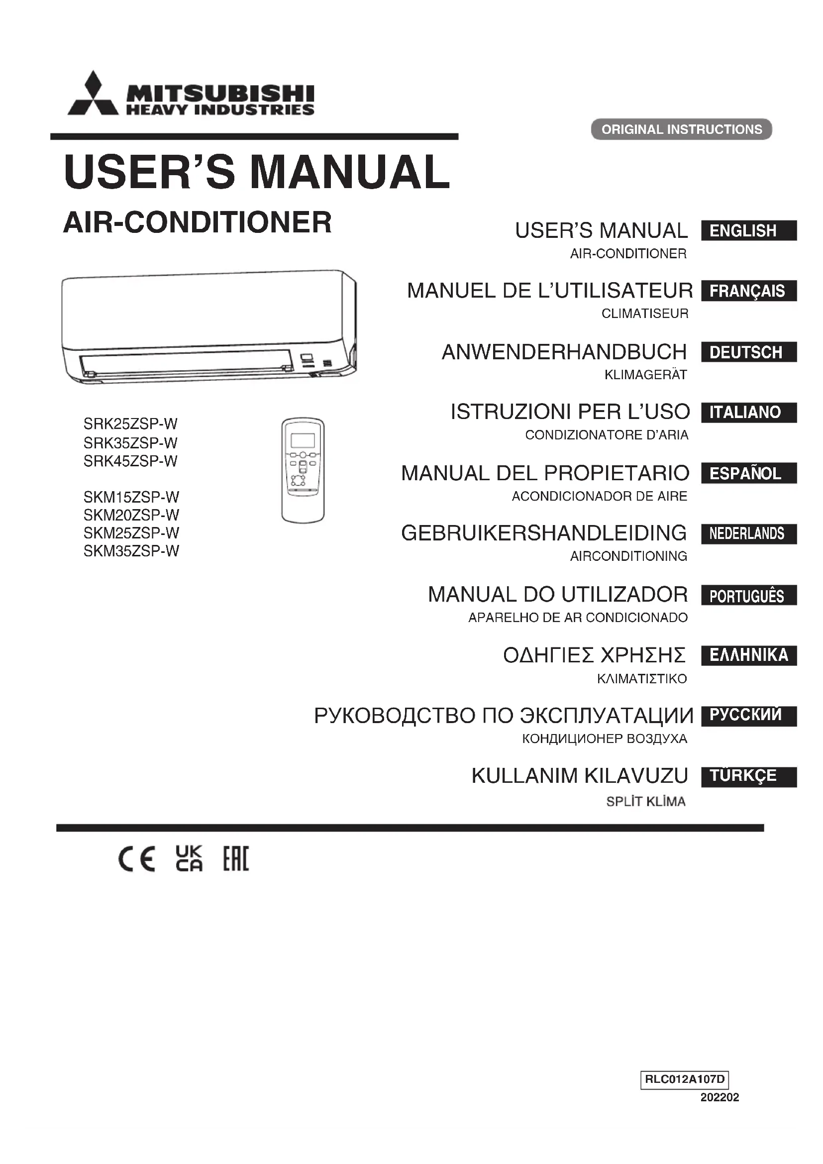 - MITSUBISHI HEAVY INDUSTRIES THERMAL SYSTEMS, LTD. 2-3, Marunouchi 3-chome, Chiyoda-ku, Tokyo, 100-8332, Japan declare under our sole responsibility that the apparatus referred to in this declaration conforms with the following directives. Relevant EU Directives : Machinery 2006/42/EC Applied Standards / Regulations : EN 60335-1 EN 60335-2-40 Conformity model list Authorised Representative in the EU : MHIAE SERVICES B.V. Herikerbergweg 238, Luna ArenA, 1101 CM Amsterdam, Netherlands P.O.Box 23393 1100 DW Amsterdam, Netherlands [Indoor Unit] [Outdoor Unit] Category Model SRK Series SRK25ZSP-W SKM Series SRK35ZSP-W SRK45ZSP-W SKM20ZSP-W SKM15ZSP-W SKM25ZSP-W SKM35ZSP-W Category Model SRC Series SRC25ZSP-W SCM Series SRC35ZSP-W SRC45ZSP-W SCM30ZS-W SCM40ZS-W SCM41ZS-W SCM45ZS-W SCM50ZS-W SCM60ZS-W SCM71ZS-W SCM80ZS-W SCM100ZS-W EN 60335-1 EN 60335-2-40 Category Model SRK Series SRK25ZSP-W SKM Series SRK35ZSP-W SRK45ZSP-W SKM20ZSP-W SKM15ZSP-W SKM25ZSP-W SKM35ZSP-W Category Model SRC Series SRC25ZSP-W SCM Series SRC35ZSP-W SRC45ZSP-W SCM30ZS-W SCM40ZS-W SCM41ZS-W SCM45ZS-W SCM50ZS-W SCM60ZS-W SCM71ZS-W SCM80ZS-W SCM100ZS-W RLC012A107D_Cover.indd 2RLC012A107D_Cover.indd 2 26-Jan-22 14:39:0126-Jan-22 14:39:01FR-1 Nous vous remercions d’avoir choisi un climatiseur MITSUBISHI HEAVY INDUSTRIES THERMAL SYSTEMS, LTD. Pour obtenir des performances optimales et durables, veuillez lire attentivement et respecter les instructions du présent manuel d’utilisateur avant d'utiliser votre climatiseur. Reportez-vous au manuel si vous avez des questions ou en cas de dysfonctionnement. Votre unité de climatisation peut comporter ce symbole, qui signifie que les déchets d’équipements électriques et électroniques (DEEE selon la directive 2012/19/UE) ne doivent pas être jetés aux ordures ménagères générales.Les climatiseurs doivent être réusinés dans un établissement autorisé, en vue de leurs réutilisation, recyclage et récupération, et non pas être éliminés dans une décharge municipale. Pour de plus amples renseignements à ce sujet, veuillez communiquer avec l’installateur ou l’autorité municipale. Ce symbole, imprimé sur les piles insérées dans votre appareil de climatisa- tion, est une information destinée à l’utilisateur final, selon la Directive 2006/66/ CE Article 20 Annexe II de l’UE. Les piles usées ne doivent pas être jetées avec les déchets domestiques. Si un symbole chimique est imprimé à côté du symbole indiqué ci-dessus, cela signifie que les piles contiennent une certaine concentration de métal lourd. Ceci est indiqué de la façon suivante: Hg: mercure (0,0005 %), Cd: cadmium (0,002 %), Pb: plomb (0,004 %) Veuillez déposer les piles à l’endroit préconisé dans votre déchetterie locale ou dans un centre de recyclage. Le niveau d’émission sonore dû à la pression des appareils extérieur et intérieur est inférieur à 70 dB(A). FRANÇAIS Consignes de sécurité p. 2