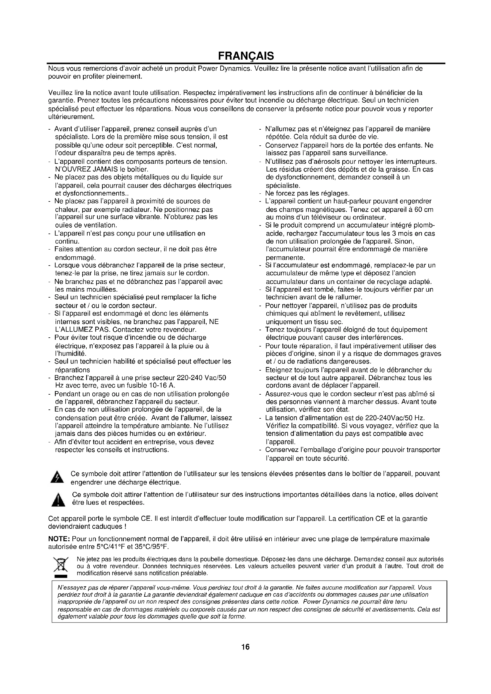 Atención: La distancia BT es de aprox. 10 metros sin barrera.16 FRANÇAIS Nous vous remercions d’avoir acheté un produit Power Dynamics. Veuillez lire la présente notice avant l’utilisation afin de pouvoir en profiter pleinement. Veuillez lire la notice avant toute utilisation. Respectez impérativement les instructions afin de continuer à bénéficier de la garantie. Prenez toutes les précautions nécessaires pour éviter tout incendie ou décharge électrique. Seul un technicien spécialisé peut effectuer les réparations. Nous vous conseillons de conserver la présente notice pour pouvoir vous y reporter ultérieurement. - Avant d’utiliser l’appareil, prenez conseil auprès d’un spécialiste. Lors de la première mise sous tension, il est possible qu’une odeur soit perceptible. C’est normal, l’odeur disparaîtra peu de temps après. - L’appareil contient des composants porteurs de tension. N’OUVREZ JAMAIS le boîtier. - Ne placez pas des objets métalliques ou du liquide sur l’appareil, cela pourrait causer des décharges électriques et dysfonctionnements.. - Ne placez pas l’appareil à proximité de sources de chaleur, par exemple radiateur. Ne positionnez pas l’appareil sur une surface vibrante. N’obturez pas les ouïes de ventilation. - L’appareil n’est pas conçu pour une utilisation en continu. - Faites attention au cordon secteur, il ne doit pas être endommagé. - Lorsque vous débranchez l’appareil de la prise secteur, tenez-le par la prise, ne tirez jamais sur le cordon. - Ne branchez pas et ne débranchez pas l’appareil avec les mains mouillées. - Seul un technicien spécialisé peut remplacer la fiche secteur et / ou le cordon secteur. - Si l’appareil est endommagé et donc les éléments internes sont visibles, ne branchez pas l’appareil, NE L’ALLUMEZ PAS. Contactez votre revendeur. - Pour éviter tout risque d’incendie ou de décharge électrique, n’exposez pas l’appareil à la pluie ou à l’humidité. - Seul un technicien habilité et spécialisé peut effectuer les réparations - Branchez l’appareil à une prise secteur 220-240 Vac/50 Hz avec terre, avec un fusible 10-16 A. - Pendant un orage ou en cas de non utilisation prolongée de l’appareil, débranchez l’appareil du secteur. - En cas de non utilisation prolongée de l’appareil, de la condensation peut être créée. Avant de l’allumer, laissez l’appareil atteindre la température ambiante. Ne l’utilisez jamais dans des pièces humides ou en extérieur. - Afin d’éviter tout accident en entreprise, vous devez respecter les conseils et instructions. - N’allumez pas et n’éteignez pas l’appareil de manière répétée. Cela réduit sa durée de vie. - Conservez l’appareil hors de la portée des enfants. Ne laissez pas l’appareil sans surveillance. - N’utilisez pas d’aérosols pour nettoyer les interrupteurs. Les résidus créent des dépôts et de la graisse. En cas de dysfonctionnement, demandez conseil à un spécialiste. - Ne forcez pas les réglages. - L’appareil contient un haut-parleur pouvant engendrer des champs magnétiques. Tenez cet appareil à 60 cm au moins d’un téléviseur ou ordinateur. - Si le produit comprend un accumulateur intégré plomb- acide, rechargez l'accumulateur tous les 3 mois en cas de non utilisation prolongée de l'appareil. Sinon, l'accumulateur pourrait être endommagé de manière permanente. - Si l’accumulateur est endommagé, remplacez-le par un accumulateur de même type et déposez l’ancien accumulateur dans un container de recyclage adapté. - Si l’appareil est tombé, faites-le toujours vérifier par un technicien avant de le rallumer. - Pour nettoyer l’appareil, n’utilisez pas de produits chimiques qui abîment le revêtement, utilisez uniquement un tissu sec. - Tenez toujours l’appareil éloigné de tout équipement électrique pouvant causer des interférences. - Pour toute réparation, il faut impérativement utiliser des pièces d’origine, sinon il y a risque de dommages graves et / ou de radiations dangereuses. - Eteignez toujours l’appareil avant de le débrancher du secteur et de tout autre appareil. Débranchez tous les cordons avant de déplacer l’appareil. - Assurez-vous que le cordon secteur n’est pas abîmé si des personnes viennent à marcher dessus. Avant toute utilisation, vérifiez son état. - La tension d’alimentation est de 220-240Vac/50 Hz. Vérifiez la compatibilité. Si vous voyagez, vérifiez que la tension d’alimentation du pays est compatible avec l’appareil. - Conservez l’emballage d’origine pour pouvoir transporter l’appareil en toute sécurité. Ce symbole doit attirer l’attention de l’utilisateur sur les tensions élevées présentes dans le boîtier de l’appareil, pouvant engendrer une décharge électrique. Ce symbole doit attirer l’attention de l’utilisateur sur des instructions importantes détaillées dans la notice, elles doivent être lues et respectées. Cet appareil porte le symbole CE. Il est interdit d’effectuer toute modification sur l’appareil. La certification CE et la garantie deviendraient caduques ! NOTE: Pour un fonctionnement normal de l’appareil, il doit être utilisé en intérieur avec une plage de température maximale autorisée entre 5°C/41°F et 35°C/95°F. Ne jetez pas les produits électriques dans la poubelle domestique. Déposez-les dans une décharge. Demandez conseil aux autorisés ou à votre revendeur. Données techniques réservées. Les valeurs actuelles peuvent varier d’un produit à l’autre. Tout droit de modification réservé sans notification préalable. N’essayez pas de réparer l’appareil vous-même. Vous perdriez tout droit à la garantie. Ne faites aucune modification sur l’appareil. Vous perdriez tout droit à la garantie La garantie deviendrait également caduque en cas d’accidents ou dommages causes par une utilisation inappropriée de l’apparei