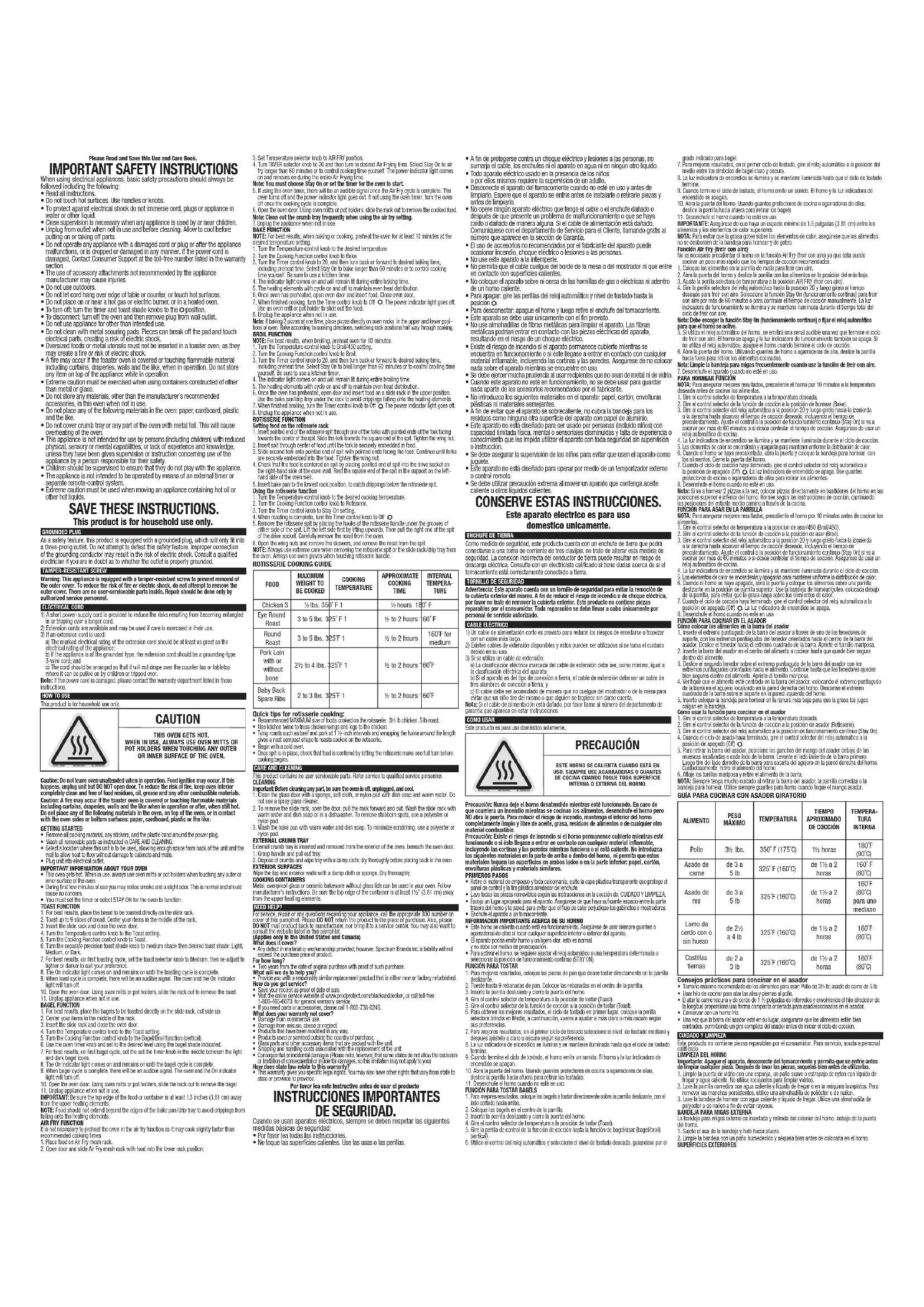- Les modalités de la présente garantie donnent des droits légaux spécifiques. L’utilisateur peut également se prévaloir d’autres droits selon l’état ou la province qu’il habite.Model/Modelo/ Modèle: TO4315SS-LA 1. Door handle 2. Easy-view glass door† 3. Bake pan (Part no. TO4314-05)† 4. Slide rack (Part# TO4314-11)† 5. Air Fry mesh cooking rack (Part# TO4315-01) 6. On indicator light† 7. Temperature control knob (Part no. TO4314-01)† 8. Cooking Function control knob (Part no. TO4314-02)† 9. Timer control knob (Part no. TO4314-03)† 10. Separate precision toast shade knob (Part no. TO4314-04)† 11. Slide-out crumb tray (Part no. TO4314-10)† 12. Rotisserie handle (Part no. TO4314-09)† 13. Rotisserie spit (Part no. TO4314-06)† 14. Wing nuts (Part no. TO4314-08)† 15. Forks (Part no. TO4314-07)Note: † indicates consumer replaceable/removable parts.ROTISSERIE COUNTERTOP OVEN WITH AIR FRYProduct may vary slightly from what is illustrated.El producto puede variar ligeramente del que aparece ilustrado. 1. Asa de la puerta 2. Puerta de vidrio transparente† 3. Bandeja para hornear (Pieza no. TO4314-05)† 4. Parrilla deslizante (Pieza no. TO4314-11)† 5. Parrilla de malla para freír con aire (Pieza no. TO4315-01) 6. Luz indicadora de encendido† 7. Control selector de temperatura (Pieza no. TO4314-01)† 8. Control selector de la función de cocción (Pieza no. TO4314-02)† 9. Control selector del reloj automático (Pieza no. TO4314-03)† 10. Control selector del grado de tostado preciso (Pieza no. TO4314-04)† 11. Bandeja de residuos deslizante (Pieza no. TO4314-10)† 12. Mango del asador (Pieza no. TO4314-09)† 13. Barra del asador (Pieza no. TO4314-06)† 14. Tornillos mariposa (Pieza no.TO4314-08)† 15. Tenedores de soporte (Pieza no. TO4314-07)Nota: † indica piezas reemplazables / removibles por el consumidor. 1. Poignée de la porte 2. Porte transparente en verre† 3. Plaque de cuisson (pièce n° TO4314-05)† 4. Grille coulissante (pièce n° TO4314-11)† 5. Grille de cuisson à mailles pour friture à l’air (pièce n° TO4315-01) 6. Témoin de fonctionnement† 7. Sélecteur de température (pièce n° TO4314-01)† 8. Sélecteur de fonction de cuisson (pièce n° TO4314-02)† 9. Bouton de la minuterie (pièce n°TO4314-03)† 10. Bouton de sélection du degré de grillage (pièce n° TO4314-04)† 11. Plateau à miettes coulissant (pièce n° TO4314-10)† 12. Poignée de la rôtissoire (pièce n° TO4314-09)† 13. Broche de rôtissoire (pièce n° TO4314-06)† 14. Écrous à oreilles (pièce n° TO4314-08)† 15. Fourchettes (pièce n° TO4314-07) Remarque : Le symbole † indique une pièce amovible/remplaçable par l’utilisateur.FOUR POUR LE COMPTOIR AVEC FRITURE À L’AIR ET RÔTISSOIRELe produit peut différer légèrement de celui qui est illustré.HORNO ASADOR DE MOSTRADOR CON FREIDORA DE AIRE CALIENTEImportante: La superficie superior del horno se calienta; asegúrese de que el horno se haya enfriado bien antes de limpiarlo. Limpie la parte superior y demás superficies exteriores con un paño o con una esponja humedecida. Seque bien con un paño suave o con papel de toalla.RECIPIENTES PARA COCINAREste aparato le permite utilizar recipientes de metal, de vidrio resistente al calor o de cerámica sin tapas de vidrio. Siga las indicaciones del fabricante. Asegúrese de que haya un espacio mínimo de 1½” (3.81 cm) entre el borde superior del recipiente y los elementos calefactores. NECESITA AYUDA?Para servicio, reparaciones o preguntas relacionadas al producto, por favor llame al número del centro de servicio que se indica para el país donde usted compró su producto. NO devuélva el producto al fabricante. Llame o lleve el producto a un centro de servicio autorizado.DOS AÑOS DE GARANTÍA LIMITADA(No aplica en México, Estados Unidos y Canada)¿Qué cubre la garantía?• La garantía cubre cualquier defecto de materiales o de mano de obra que no haya sido generado por el uso incorrecto del producto.¿Por cuánto tiempo es válida la garantía?• Por dos años a partir de la fecha original de compra mientras que tenga una prueba de la compra.¿Cómo se obtiene el servicio necesario?• Conserve el recibo original como comprobante de la fecha de compra, comuníquese con el centro de servicio de su país y haga efectiva su garantía si cumple lo indicado en el manual de instrucciones. ¿Cómo se puede obtener servicio?• Conserve el recibo original de compra. • Por favor llame al número del centro de servicio autorizado. ¿Qué aspectos no cubre esta garantía?• Los productos que han sido utilizados en condiciones distintas a las normales. • Los daños ocasionados por el mal uso, el abuso o negligencia. • Los productos que han sido alterados de alguna manera. • Los daños ocasionados por el uso comercial del producto. • Los productos utilizados o reparados fuera del país original de compra. • Las piezas de vidrio y demás accesorios empacados con el aparato. • Los gastos de tramitación y embarque asociados al reemplazo del producto. • Los daños y perjuicios indirectos o incidentales. ¿Qué relación tiene la ley estatal con esta garantía?• Esta garantía le otorga derechos legales específicos y el consumidor podría tener otros derechos que varían de una región a otra.Póliza de GarantíaVálida sólo para MéxicoDuración Spectrum Brands de México SA de CV garantiza este producto por 2 años a partir de la fecha original de compra.¿Qué cubre esta garantía?Esta Garantía cubre cualquier defecto que presenten las piezas, componentes y la mano de obra contenidas en este producto.Requisitos para hacer válida la garantíaPara reclamar su Garantía deberá presentar al Centro de Servicio Autorizado la póliza sellada por el establecimiento en donde adquirió el producto. Si no la tiene, podrá presentar el comprobante de compra original.¿Donde hago válida la garantía?Llame sin costo 