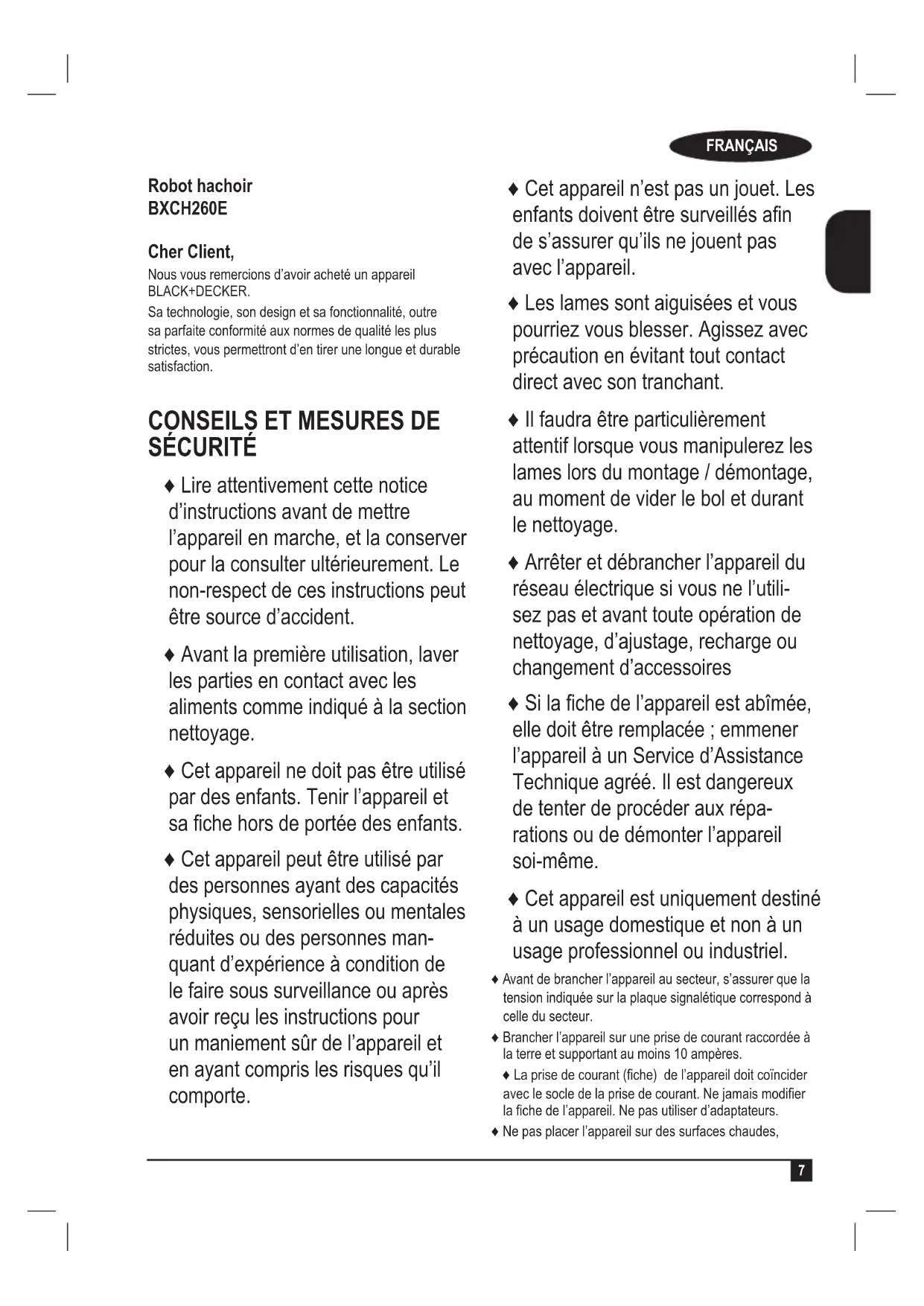 Robot hachoir BXCH260E Cher Client, Nous vous remercions d’avoir acheté un appareil BLACK+DECKER. Sa technologie, son design et sa fonctionnalité, outre sa parfaite conformité aux normes de qualité les plus strictes, vous permettront d’en tirer une longue et durable satisfaction.
