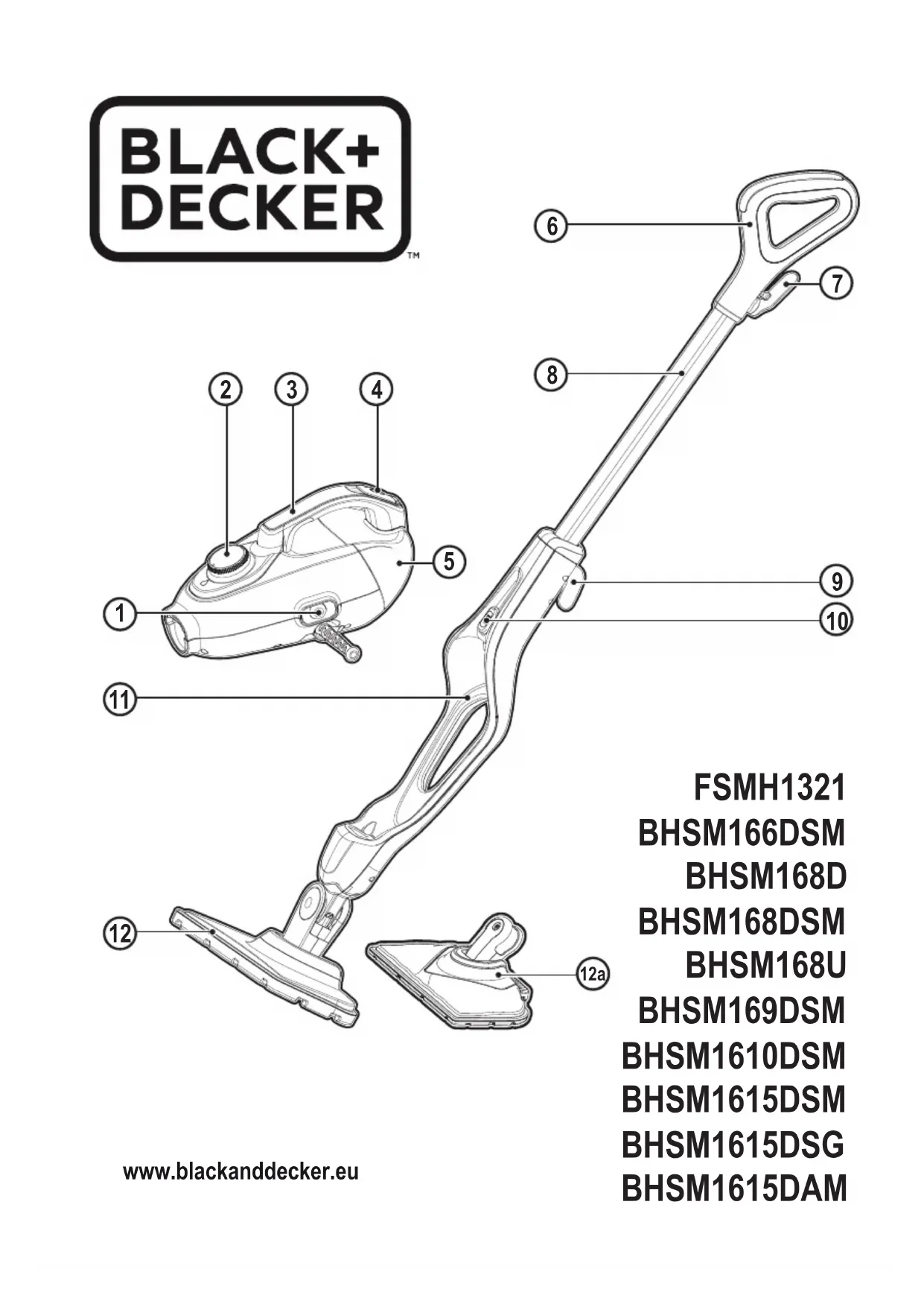 FSMH1321,BHSM166DSM, BHSM168D, BHSM168DSM, BHSM168U, BHSM169DSM, BHSM1610DSM, BHSM1615DSM, BHSM1615DSG, BHSM1615DAM a été conçu pour désinfecter et laver les parquetsenboisdurvitriés,lesparquetsstratiésvitriés, les sols en linoléum, en vinyle, en carrelage, en pierre et en marbre. Cet appareil est exclusivement destiné à une utilisationdomestique,àl’intérieur. Consignes de sécurité Avertissement ! Veillez à lire tous les avertissements sur la sécurité et toutes les instruc- tions. Le non-respect des aver- tissements et des instructions listés ci-dessous peut entraîner des décharges électriques, des incendies et/ou de graves blessures. Avertissement !L'utilisation d'appareilsalimentéssur secteur implique le respect de certaines précautions de sécu- rité élémentaires, dont celles quisuivent,anderéduireles risquesd'incendie,dedécharge électrique, de blessures et de dégâts matériels. u Cemanueldécritlamanièred’utiliser cet appareil. u L'utilisationd'unaccessoireou d'unéquipementautrequeceux recommandés dans ce manuel et l'utilisationdecetappareilàd'autres nsquecellesrecommandéesdansce manueld'utilisationpeuvententraîner un risque de blessures. Pegen der Bodentücher Pegehinweise - Die Tücher können bei 60°C gewaschen werden. Keinen Weichspüler verwenden. Vor der erneuten Verwendung vollständig trocknen lassen. Achtung!BefolgenSiediePegehinweiseaufdem Bodentuch. Austauschen des Netzsteckers (nur Großbritannien und Irland) Wenn ein neuer Netzstecker angebracht werden muss: u Entsorgen Sie den alten Stecker auf sachgerechte Weise.u Verbinden Sie die braune Leitung mit dem spannungsführenden Anschluss des Steckers. u Verbinden Sie die blaue Leitung mit dem neutralen Anschluss. u Verbinden Sie die grün/gelbe Leitung mit dem Masseanschluss. Warnung! Befolgen Sie die Montageanweisungen, die mit hochwertigen Steckern mitgeliefert werden. Empfohlene Sicherung: 13A. Umweltschutz Getrennte Entsorgung. Produkte und Akkus mit diesem Symbol dürfen nicht mit dem normalen Hausmüll entsorgt werden. Produkte und Akkus enthalten Materialien, die wiederverwertet werden können, um den Bedarf an Rohstoffen zu verringern. Bitte recyceln Sie elektrische Produkte und Akkus gemäß den örtlichen Bestimmungen. WeitereInformationenndenSieauf www.2helpU.com Garantie Black & Decker vertraut auf die Qualität der eigenen Geräte und bietet dem Käufer eine außergewöhnliche Garantie von 24 Monaten ab Kaufdatum. Diese Garantie versteht sich unbeschadet der gesetzlichen Gewährleistungsansprüche und schränkt diese keinesfalls ein. Diese Garantie gilt innerhalb der Staatsgebiete der Mitgliedstaaten der Europäischen Union und der Europäischen Freihandelszone. Zur Inanspruchnahme dieser Garantie muss sie den allgemeinen Geschäftsbedingungen von Black + Decker entsprechen und dem Verkäufer bzw. der Vertragswerkstatt ist ein Kaufnachweis vorzulegen. Die Bedingungen für die 2-jährige Garantie von Black&Decker und den Standort Ihrer nächstgelegenenVertragswerkstattndenSieimInternet unter www.2helpU.com oder indem Sie sich an die lokale Black&Decker-Niederlassung wenden, deren Adresse Sie in dieserAnleitungnden. Ihr neues Black & Decker Produkt können Sie auf unserer Website unter www.blackanddecker.de registrieren. Dort erhalten Sie auch Informationen über neue Produkte und Sonderangebote.27 (Traduction des instructions initiales) FRANÇAIS u Conservez ce manuel pour pouvoir vous y référer dans le futur. Utiliser votre appareil u Ne dirigez jamais la vapeur vers des personnes, des animaux, des appareils électriques ou des prises de courant. u N'exposezpasl'appareilàl'eau. u Neplongezpasl’appareildansl’eau. u Nelaissezpasl'appareilsans surveillance. u Nelaissezpasl'appareilbranché lorsqu'iln'estpasutilisé. u Ne tirez jamais sur le câble électrique pourdébrancherl'appareil.Maintenez lecâbleélectriqueàl'écartdetoute source de chaleur, de zones grasses et de bords tranchants. u Veillez à ne pas manipuler le nettoyeur vapeur si vous avez les mains mouillées. u Ne tirez pas sur le câble électrique etneportezpasl'appareilparson câbleélectrique,n'utilisezpaslecâble électrique comme poignée, veillez à ne pas refermer de porte sur le câble et à ne pas faire passer le câble dans des angles saillants ou des surfaces chaudes. u N'utilisezpasl'appareildansdes espaces clos en présence de vapeurs dediluantpourpeintureàl'huile,de certaines substances fongicides, de poussièresinammablesoud'autres vapeurs explosives ou toxiques. u Vériezletypedevossolsauprèsdu fabricant. u N'utilisezpasl'appareilsurducuir,des meubles ou des sols cirés, des tissus synthétiques,duveloursoud'autres matières délicates sensibles à la vapeur. Avertissement !N’utilisezpas l'appareilsurduparquetnon vitriéouduparquetstratiénon vitriés.Surlessurfacestraitées avec de la cire ou sur certains sols non cirés, la chaleur et les vapeurs peuvent faire dispa- raître la brillance. Il est toujours recommandé de faire un test sur une zone isolée de la surface à nettoyer avant de commencer. Nous vous recommandons éga- lementdevérierlesconsignes d’utilisationetd'entretiendu fabricant de votre sol. u N'ajoutezjamaisdeproduits détartrants, aromatiques, à base d'alcooloudedétergentsdansle nettoyeur à vapeur, car cela pourrait l'endommagerourendresonutilisation dangereuse. u Si le disjoncteur se déclenche pendant l’utilisationdelafonctionVapeur, cessezimmédiatementd'utiliserle produit et contactez le service client. (Soyez prudent face au risque de décharge électrique). uL’appareildiffusedelavapeur extrêmement chaude pour désinfecter la zone où il est utilisé.28 (Traduction des instructions initiales) FRANÇAIS Celasigniequelatêtequidiffuse lavapeur,leslavettesetl'accessoire pour tapis et moquette deviennent très chaudspendantl'utilisation. Attention ! Portez toujours des chaussures adaptées pour utiliser le balai vapeur ainsi que pour changer les acces
