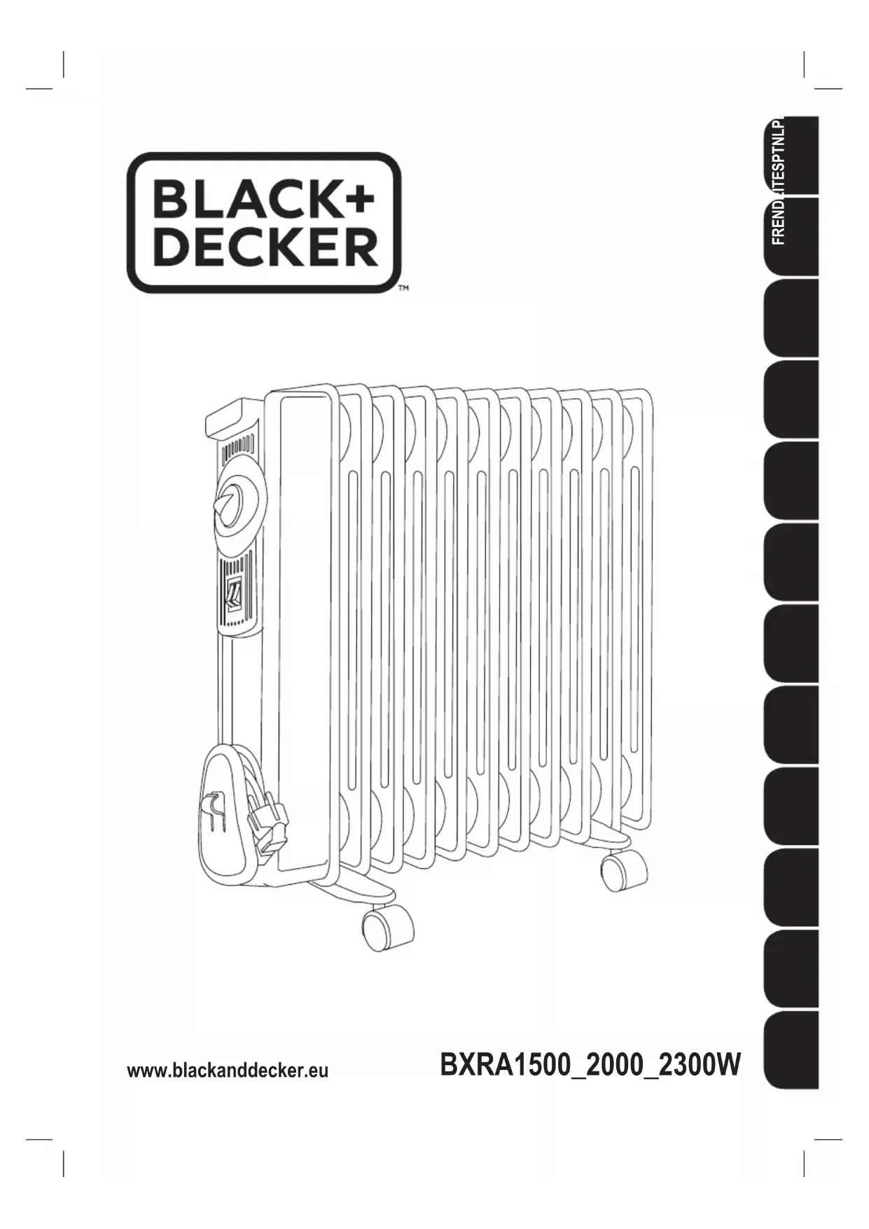 Français Radiateur à huile BXRA1500E BXRA2000E BXRA2300E Cher client, Nous vous remercions d’avoir acheter un appareil BLACK+DECKER. Sa technologie, son design et sa fonctionnalité, s’ajoutant au fait qu’elle répond amplement aux normes de qualité les plus strictes, vous permettront d’en tirer une longue et durable satisfaction. DESCRIPTION A Poignée de transport B Voyant lumineux C Thermostat D Bouton marche/arrêt et sélection de puissance E Éléments du radiateur F Câble G Compartiment câble H Roues I Écrous : xation roues J Support : Support : ensemble xation roues -Lisez attentivement ces instructions avant d’utiliser votre appareil et conservez-les pour pouvoir les consulter ultérieurement. La non observation et application de ces instructions peuvent entraîner un accident.