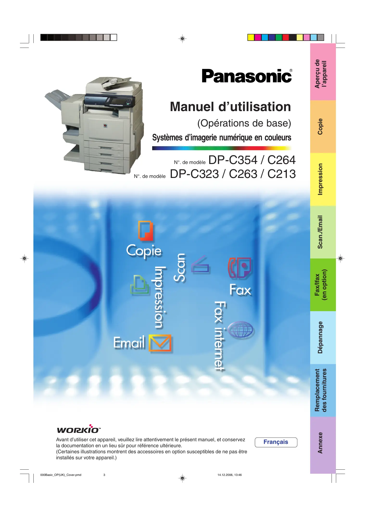 Aperçu de l’appareil Systèmes d’imagerie numérique en couleurs DP-C354 / C264 DP-C323 / C263 / C213 N°. de modèle Avant d’utiliser cet appareil, veuillez lire attentivement le présent manuel, et conservez la documentation en un lieu sûr pour référence ultérieure. (Certaines illustrations montrent des accessoires en option susceptibles de ne pas être installés sur votre appareil.) 000Basic_OP(UK)_Cover.pmd