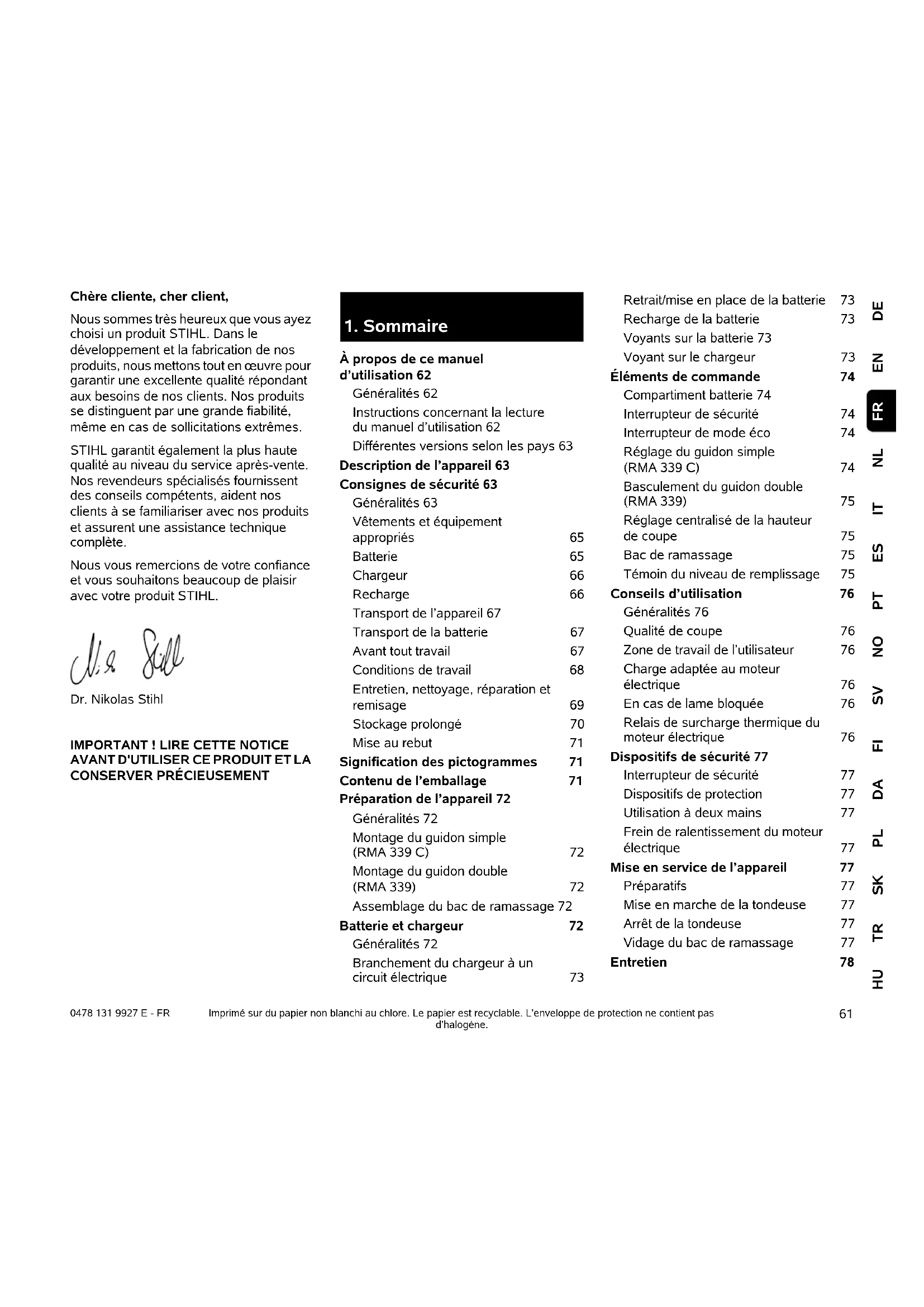 DEENNLITESPTNOSVFIDAPLSKTRHU FR 0478 131 9927 E - FR Chère cliente, cher client, Nous sommes très heureux que vous ayez choisi un produit STIHL. Dans le développement et la fabrication de nos produits, nous mettons tout en œuvre pour garantir une excellente qualité répondant aux besoins de nos clients. Nos produits se distinguent par une grande fiabilité, même en cas de sollicitations extrêmes. STIHL garantit également la plus haute qualité au niveau du service après-vente. Nos revendeurs spécialisés fournissent des conseils compétents, aident nos clients à se familiariser avec nos produits et assurent une assistance technique complète. Nous vous remercions de votre confiance et vous souhaitons beaucoup de plaisir avec votre produit STIHL. Dr. Nikolas Stihl