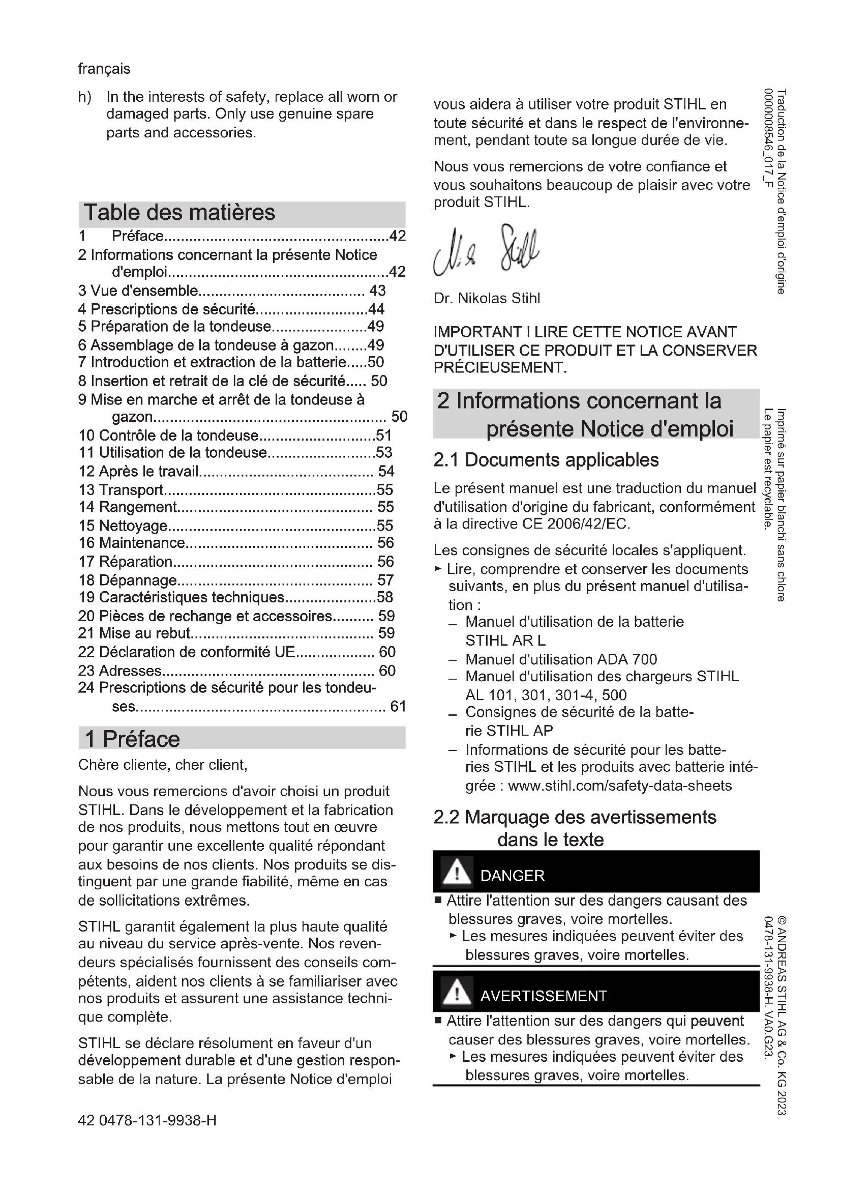 - 24 Prescriptions de sécurité pour les tondeu‐ ses 1 Préface Chère cliente, cher client, Nous vous remercions d'avoir choisi un produit STIHL. Dans le développement et la fabrication de nos produits, nous mettons tout en œuvre pour garantir une excellente qualité répondant aux besoins de nos clients. Nos produits se dis‐ tinguent par une grande fiabilité, même en cas de sollicitations extrêmes. STIHL garantit également la plus haute qualité au niveau du service après-vente. Nos reven‐ deurs spécialisés fournissent des conseils com‐ pétents, aident nos clients à se familiariser avec nos produits et assurent une assistance techni‐ que complète. STIHL se déclare résolument en faveur d'un développement durable et d'une gestion respon‐ sable de la nature. La présente Notice d'emploi vous aidera à utiliser votre produit STIHL en toute sécurité et dans le respect de l'environne‐ ment, pendant toute sa longue durée de vie. Nous vous remercions de votre confiance et vous souhaitons beaucoup de plaisir avec votre produit STIHL. Dr. Nikolas Stihl p. 61
