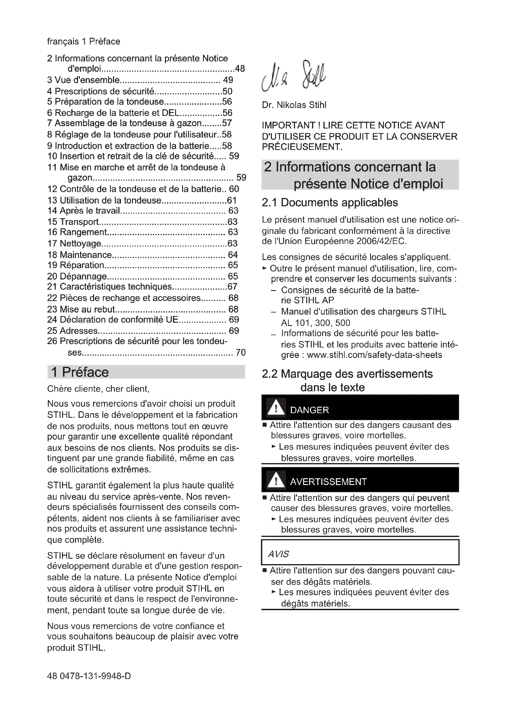 - 26 Prescriptions de sécurité pour les tondeu‐ ses 1 Préface Chère cliente, cher client, Nous vous remercions d'avoir choisi un produit STIHL. Dans le développement et la fabrication de nos produits, nous mettons tout en œuvre pour garantir une excellente qualité répondant aux besoins de nos clients. Nos produits se dis‐ tinguent par une grande fiabilité, même en cas de sollicitations extrêmes. STIHL garantit également la plus haute qualité au niveau du service après-vente. Nos reven‐ deurs spécialisés fournissent des conseils com‐ pétents, aident nos clients à se familiariser avec nos produits et assurent une assistance techni‐ que complète. STIHL se déclare résolument en faveur d'un développement durable et d'une gestion respon‐ sable de la nature. La présente Notice d'emploi vous aidera à utiliser votre produit STIHL en toute sécurité et dans le respect de l'environne‐ ment, pendant toute sa longue durée de vie. Nous vous remercions de votre confiance et vous souhaitons beaucoup de plaisir avec votre produit STIHL. Dr. Nikolas Stihl p. 70