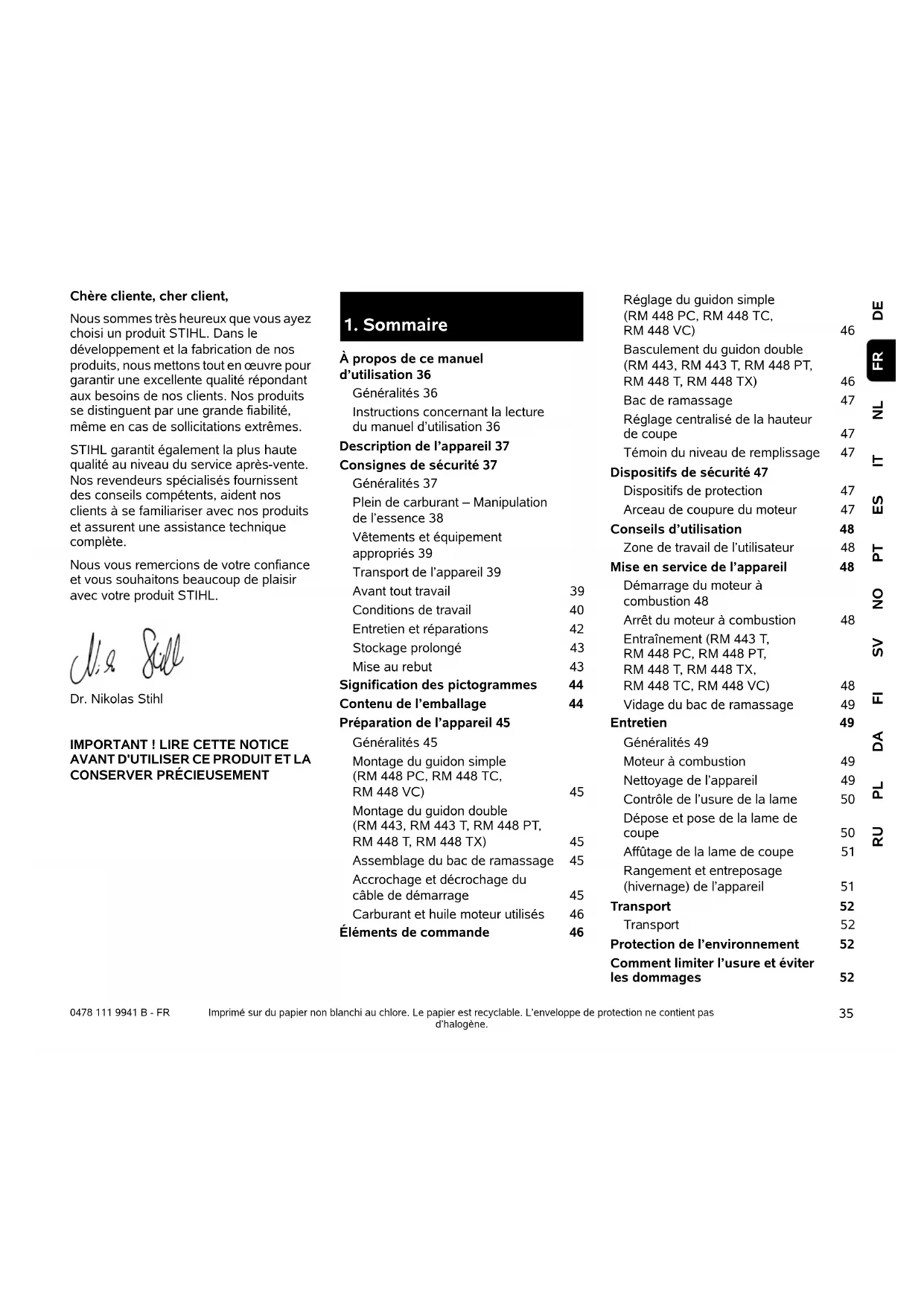 DENLITESPTNOSVFIDAPLRU FR 0478 111 9941 B - FR Chère cliente, cher client, Nous sommes très heureux que vous ayez choisi un produit STIHL. Dans le développement et la fabrication de nos produits, nous mettons tout en œuvre pour garantir une excellente qualité répondant aux besoins de nos clients. Nos produits se distinguent par une grande fiabilité, même en cas de sollicitations extrêmes. STIHL garantit également la plus haute qualité au niveau du service après-vente. Nos revendeurs spécialisés fournissent des conseils compétents, aident nos clients à se familiariser avec nos produits et assurent une assistance technique complète. Nous vous remercions de votre confiance et vous souhaitons beaucoup de plaisir avec votre produit STIHL. Dr. Nikolas Stihl