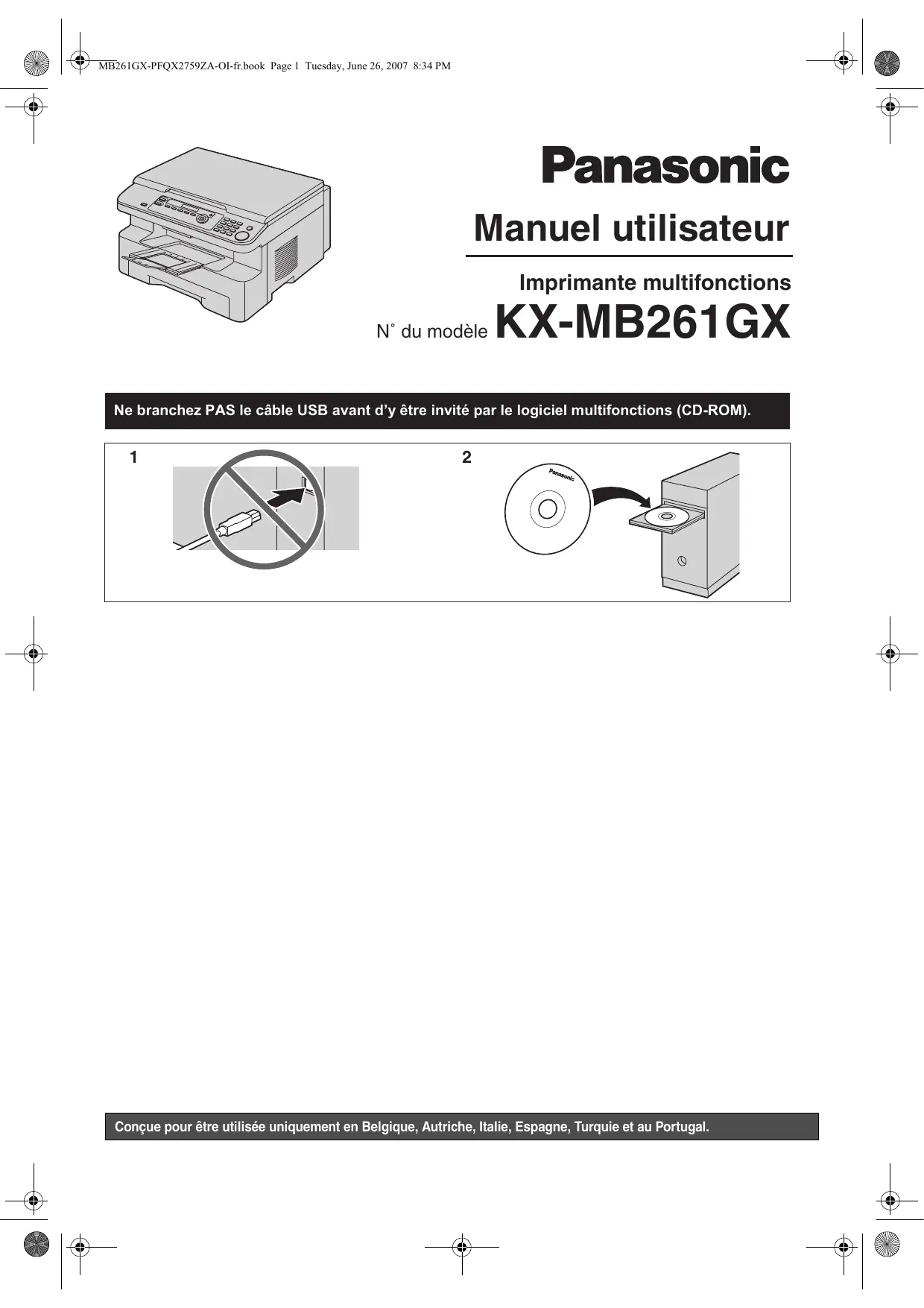 MB261GX-PFQX2759ZA-OI-fr.book Page 1 Tuesday, June 26, 2007 8:34 PM Manuel utilisateur Imprimante multifonctions N˚ du modèle KX-MB261GX Ne branchez PAS le câble USB avant d’y être invité par le logiciel multifonctions (CD-ROM).