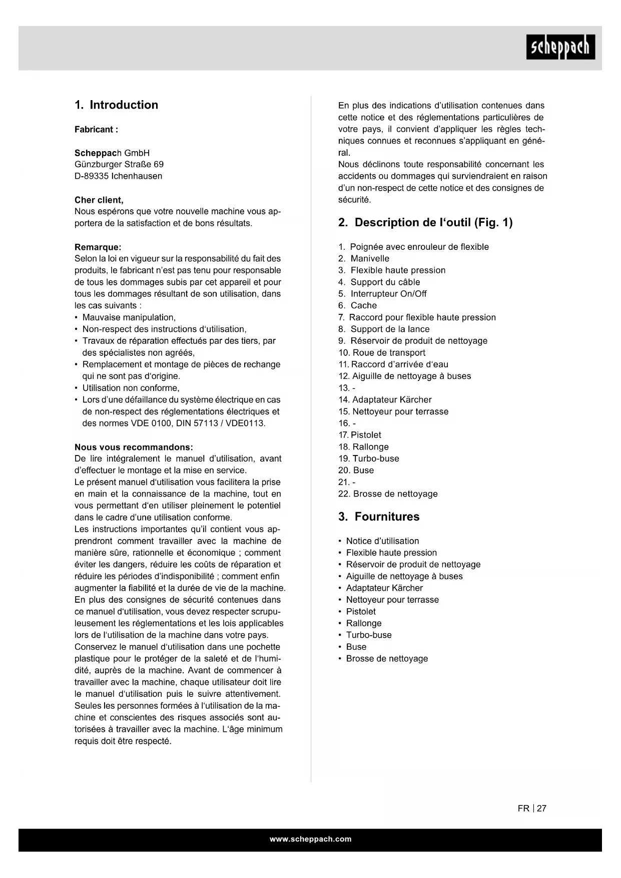 Fabricant : Scheppach GmbH Günzburger Straße 69 D-89335 Ichenhausen Cher client, Nous espérons que votre nouvelle machine vous ap- portera de la satisfaction et de bons résultats. Remarque: Selon la loi en vigueur sur la responsabilité du fait des produits, le fabricant n’est pas tenu pour responsable de tous les dommages subis par cet appareil et pour tous les dommages résultant de son utilisation, dans les cas suivants :