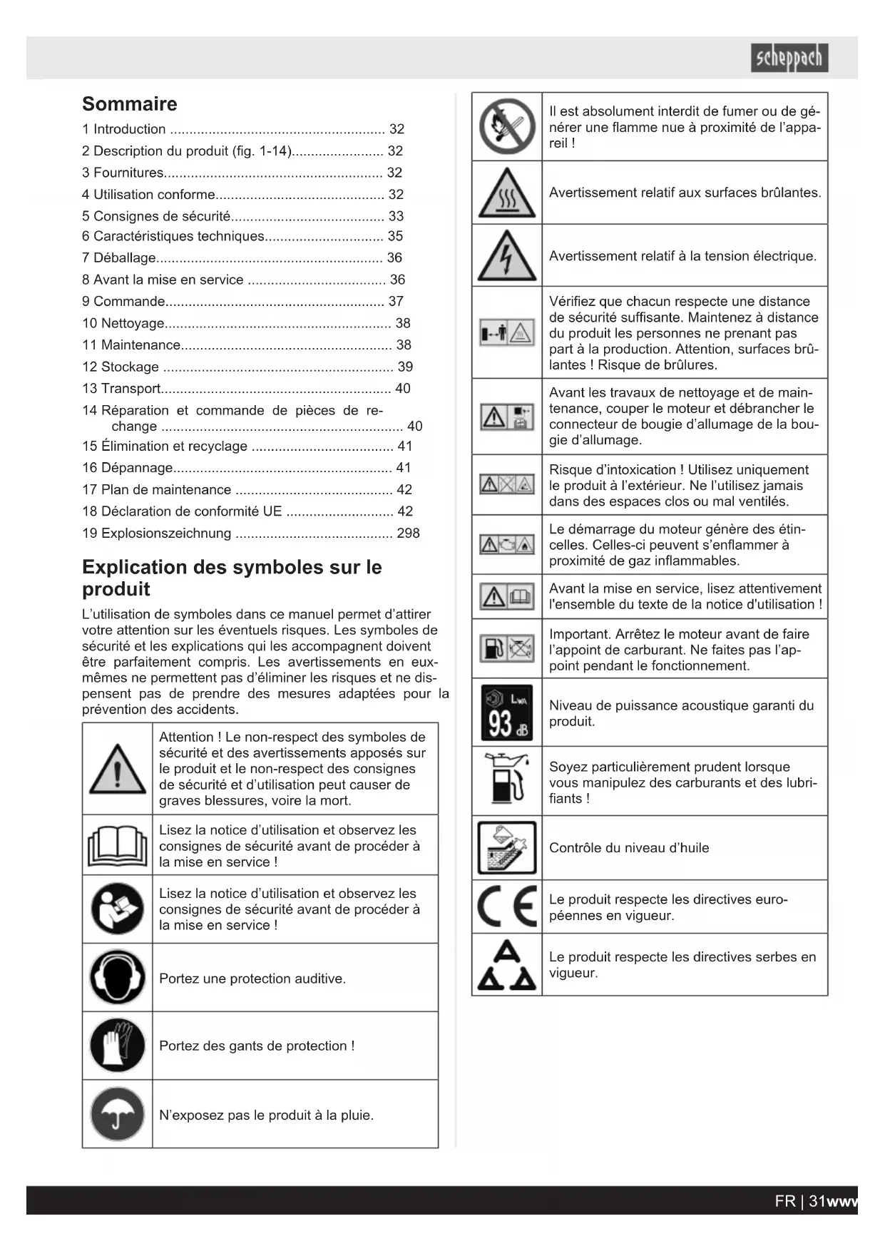 - 19 Explosionszeichnung Explication des symboles sur le produit L’utilisation de symboles dans ce manuel permet d’attirer votre attention sur les éventuels risques. Les symboles de sécurité et les explications qui les accompagnent doivent être parfaitement compris. Les avertissements en eux- mêmes ne permettent pas d’éliminer les risques et ne dis- pensent pas de prendre des mesures adaptées pour la prévention des accidents. Attention! Le non-respect des symboles de sécurité et des avertissements apposés sur le produit et le non-respect des consignes de sécurité et d’utilisation peut causer de graves blessures, voire la mort. Lisez la notice d’utilisation et observez les consignes de sécurité avant de procéder à la mise en service! Lisez la notice d’utilisation et observez les consignes de sécurité avant de procéder à la mise en service! Portez une protection auditive. Portez des gants de protection! N’exposez pas le produit à la pluie. Il est absolument interdit de fumer ou de gé- nérer une flamme nue à proximité de l’appa- reil! Avertissement relatif aux surfaces brûlantes. Avertissement relatif à la tension électrique. Vérifiez que chacun respecte une distance de sécurité suffisante. Maintenez à distance du produit les personnes ne prenant pas part à la production. Attention, surfaces brû- lantes! Risque de brûlures. Avant les travaux de nettoyage et de main- tenance, couper le moteur et débrancher le connecteur de bougie d’allumage de la bou- gie d’allumage. Risque d’intoxication! Utilisez uniquement le produit à l’extérieur. Ne l’utilisez jamais dans des espaces clos ou mal ventilés. Le démarrage du moteur génère des étin- celles. Celles-ci peuvent s’enflammer à proximité de gaz inflammables. Avant la mise en service, lisez attentivement l'ensemble du texte de la notice d'utilisation! Important. Arrêtez le moteur avant de faire l’appoint de carburant. Ne faites pas l’ap- point pendant le fonctionnement. Niveau de puissance acoustique garanti du produit. Soyez particulièrement prudent lorsque vous manipulez des carburants et des lubri- fiants! Contrôle du niveau d’huile Le produit respecte les directives euro- péennes en vigueur. Le produit respecte les directives serbes en vigueur. FR | 31www.scheppach.com1 Introduction Fabricant: Scheppach GmbH Günzburger Straße 69 D-89335 Ichenhausen Cher client, Nous espérons que votre nouveau produit vous apportera satisfaction et de bons résultats. Remarque: Conformément à la loi en vigueur sur la responsabilité du fait des produits, le fabricant de ce produit n'est pas res- ponsable des dommages survenus sur ce produit dans les cas suivants: p. 298