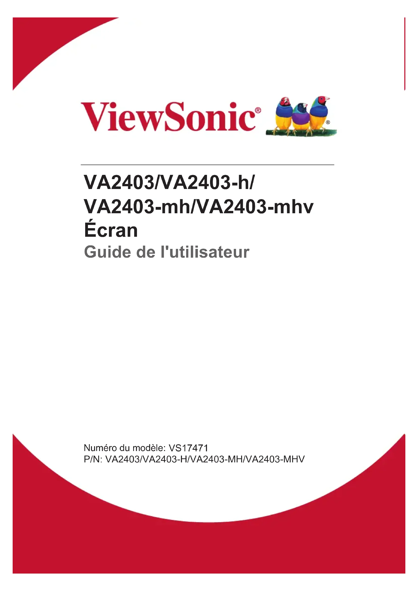 VA2403/VA2403-h/ VA2403-mh/VA2403-mhv Écran Guide de l'utilisateur Numéro du modèle: VS17471 P/N: VA2403/VA2403-H/VA2403-MH/VA2403-MHVMerci d’avoir choisi ViewSonic Avec plus de 30 années d’expérience en tant que fournisseur mondial majeur en solutions visuelles, ViewSonic se consacre à dépasser les attentes du monde pour les évolutions technologiques, l’innovation et la simplicité. Chez ViewSonic, nous croyons que nos produits ont le potentiel d’avoir un impact positif sur le monde, et sommes confiants que le produit ViewSonic que vous avez choisi vous sera utile. Encore une fois, merci d’avoir choisi ViewSonic !iii Table des Matičres