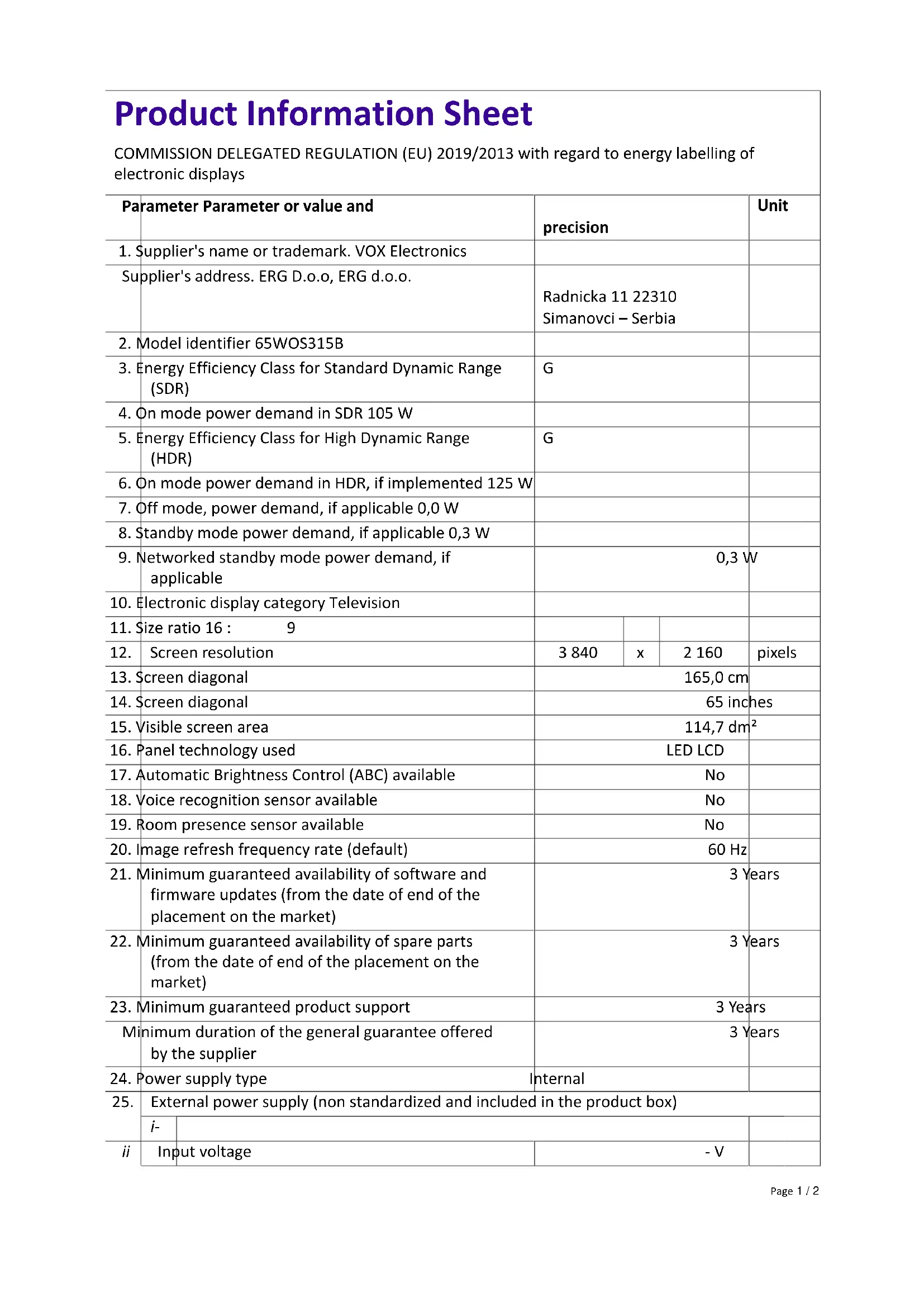 Retrouvez gratuitement la notice de l'appareil 65WOS315B VOX au format PDF.