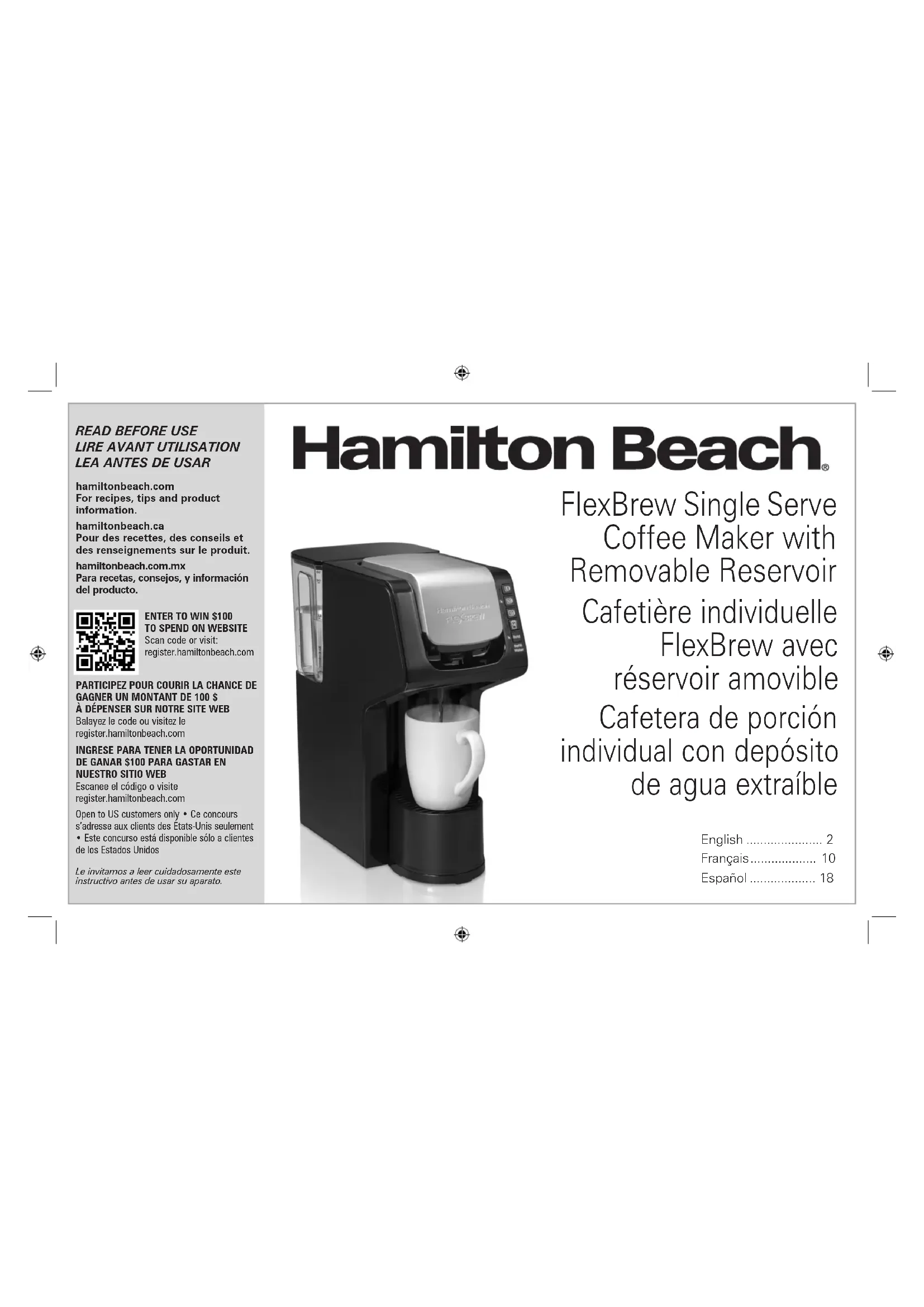 Escanee el código o visite register.hamiltonbeach.com Open to US customers only • Ce concours s’adresse aux clients des États-Unis seulement