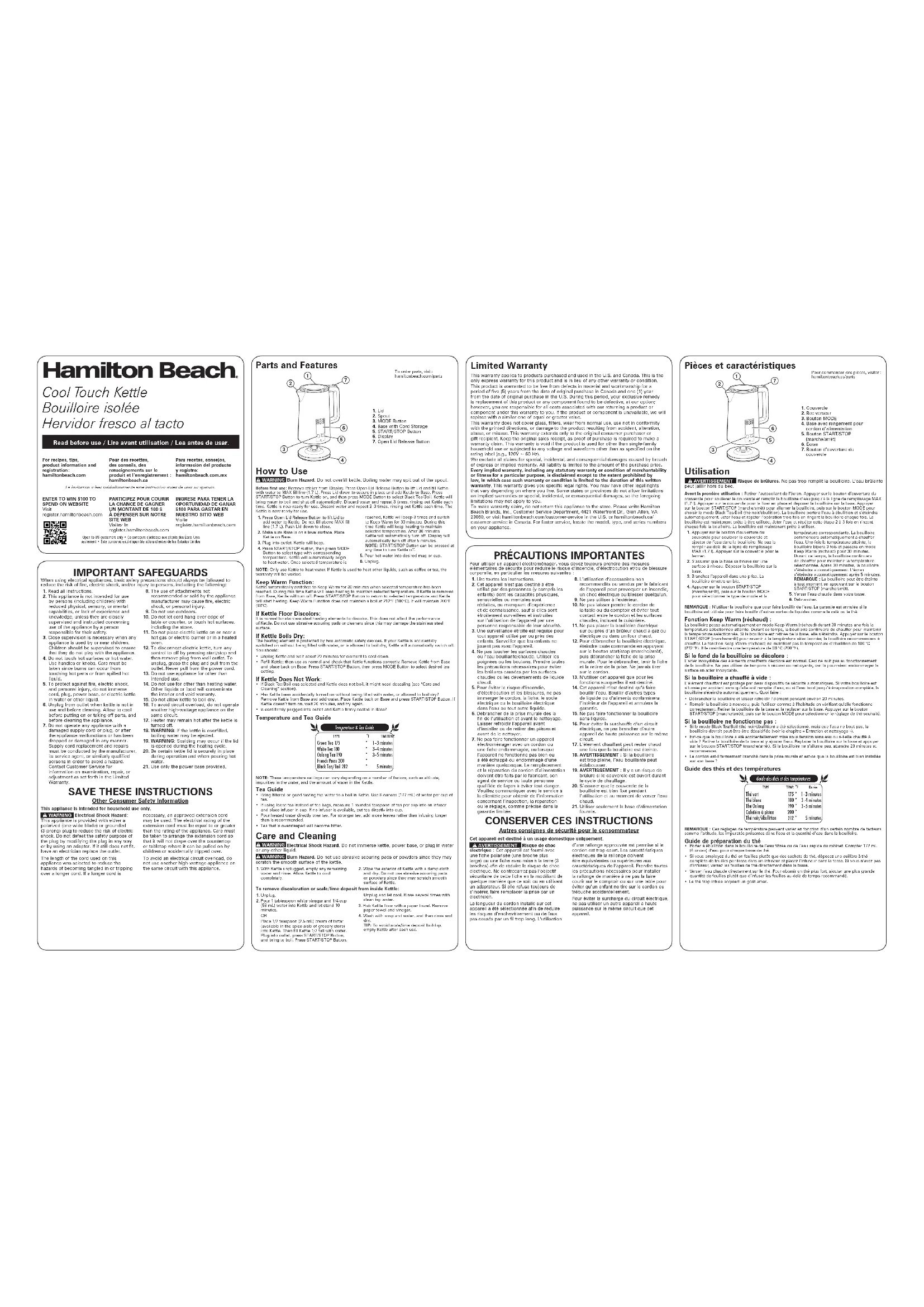 - Verser l’eau chaude directement sur le thé. Pour obtenir un thé plus fort, ajouter une plus grande quantité de feuilles plutôt que d’infuser les feuilles au-delà de temps recommandé.• Le thé trop infusé acquiert un goût amer. Pièces et caractéristiques Pour commander des pièces, visiter :hamiltonbeach.ca/parts1. Couvercle 2. Bec verseur3. Bouton MODE4. Base avec rangement pour cordon d’alimentation5. Bouton START/STOP (marche/arrêt)6. Écran7. Bouton d’ouverture du couvercle840362500 | A2 - 23.33 x 16.5 in 03/22Modelo: Tipo Características eléctricas:41033 K71 120 V ~ 60 Hz 1500 WLos modelos incluídos en el instructivo de Uso y Cuidado pueden ir seguidos o no por un sufijo correspondiente a una o varias letras del alfabeto y sus combinaciones, separadas o no por un espacio, coma, diagonal, o guión. Como ejemplos los sufijos pueden ser: “Y” y/o “MX” y/o “MXY” y/o “Z”.Grupo HB PS, S.A. de C.V.Monte Elbruz No. 124 - 401Col. Polanco V Sección, Miguel HidalgoCiudad de México, C.P. 11560GARANTÍA PARA PRODUCTOS COMPRADOS EN MÉXICOPRODUCTO: MARCA: MODELO:Grupo HB PS, S.A. de C.V. cuenta con una Red de Centros de Servicio Autorizada, por favor consulte en la lista anexa el nombre y dirección de los establecimientos en la República Mexicana en donde usted podrá hacer efectiva la garantía, obtener partes, componentes, consumibles y accesorios; así como también obtener servicio para productos fuera de garantía. Para mayor información llame al: Centro de Atención al Consumidor: 800 71 16 100 Grupo HB PS, S.A. de C.V. le otorga a partir de la fecha de compra:GARANTÍA DE 1 AÑO.COBERTURA