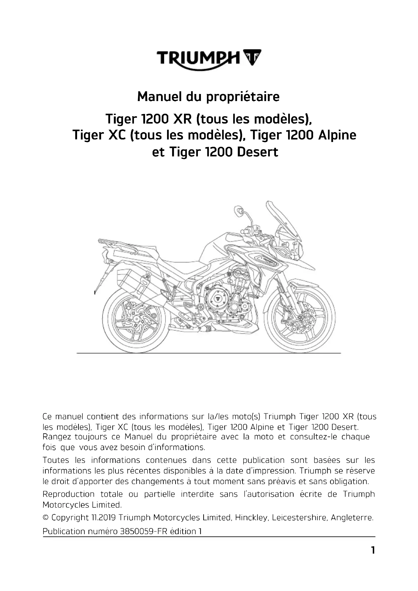 Manuel du propriétaire Tiger 1200 XR (tous les modèles), Tiger XC (tous les modèles), Tiger 1200 Alpine et Tiger 1200 Desert Ce manuel contient des informations sur la/les moto(s) Triumph Tiger 1200 XR (tous les modèles), Tiger XC (tous les modèles), Tiger 1200 Alpine et Tiger 1200 Desert. Rangez toujours ce Manuel du propriétaire avec la moto et consultez-le chaque fois que vous avez besoin d’informations. Toutes les informations contenues dans cette publication sont basées sur les informations les plus récentes disponibles à la date d’impression. Triumph se réserve le droit d’apporter des changements à tout moment sans préavis et sans obligation. Reproduction totale ou partielle interdite sans l’autorisation écrite de Triumph Motorcycles Limited. © Copyright 11.2019 Triumph Motorcycles Limited, Hinckley, Leicestershire, Angleterre. Publication numéro 3850059-FR édition 1