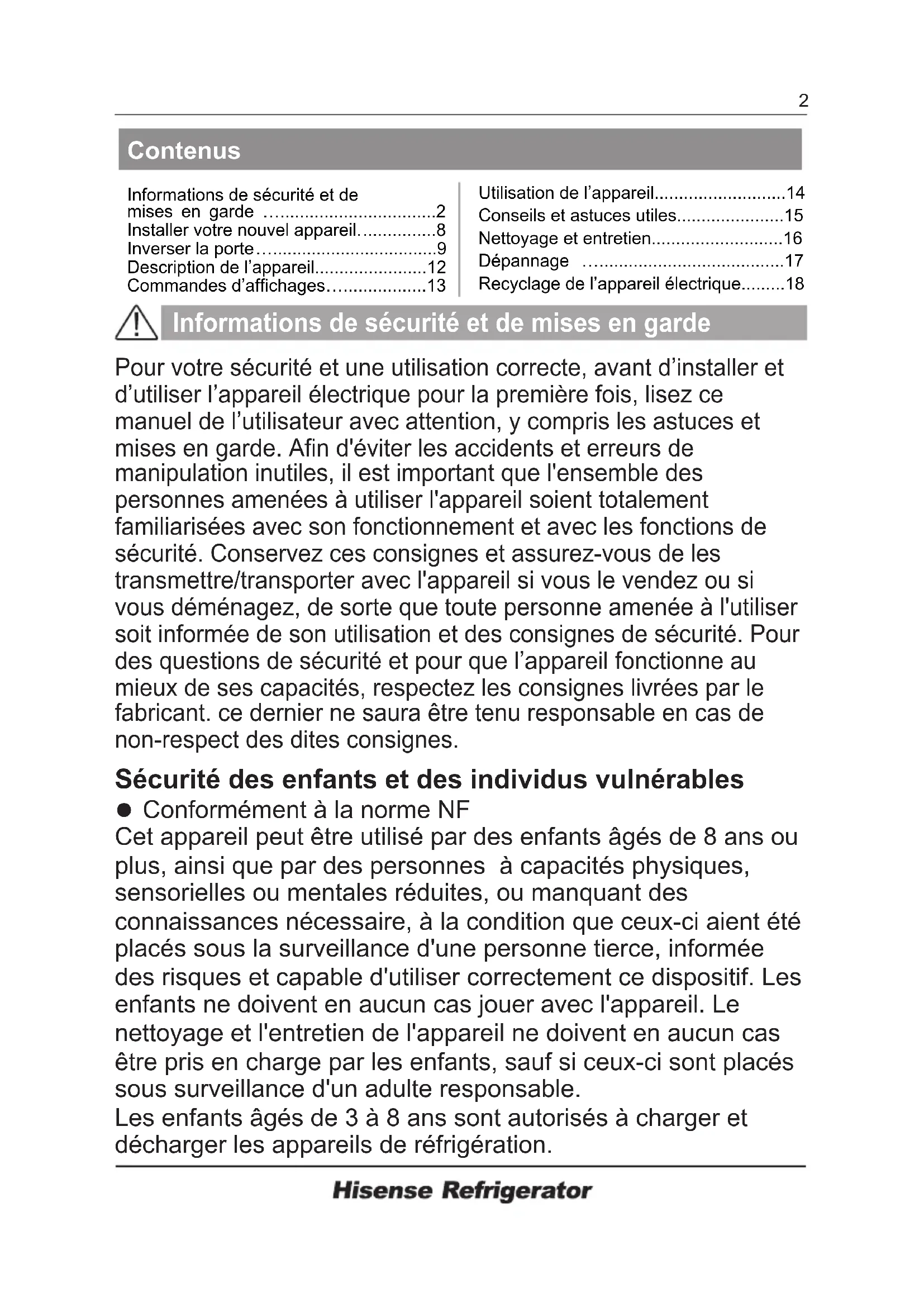 Conformément à la norme NF Cet appareil peut être utilisé par des enfants âgés de 8 ans ou plus, ainsi que par des personnes à capacités physiques, sensorielles ou mentales réduites, ou manquant des connaissances nécessaire, à la condition que ceux-ci aient été placés sous la surveillance d'une personne tierce, informée des risques et capable d'utiliser correctement ce dispositif. Les enfants ne doivent en aucun cas jouer avec l'appareil. Le nettoyage et l'entretien de l'appareil ne doivent en aucun cas être pris en charge par les enfants, sauf si ceux-ci sont placés sous surveillance d'un adulte responsable. Les enfants âgés de 3 à 8 ans sont autorisés à charger et décharger les appareils de réfrigération. Contenus Informations de sécurité et de mises en garde …................................2 Installer votre nouvel appareil.