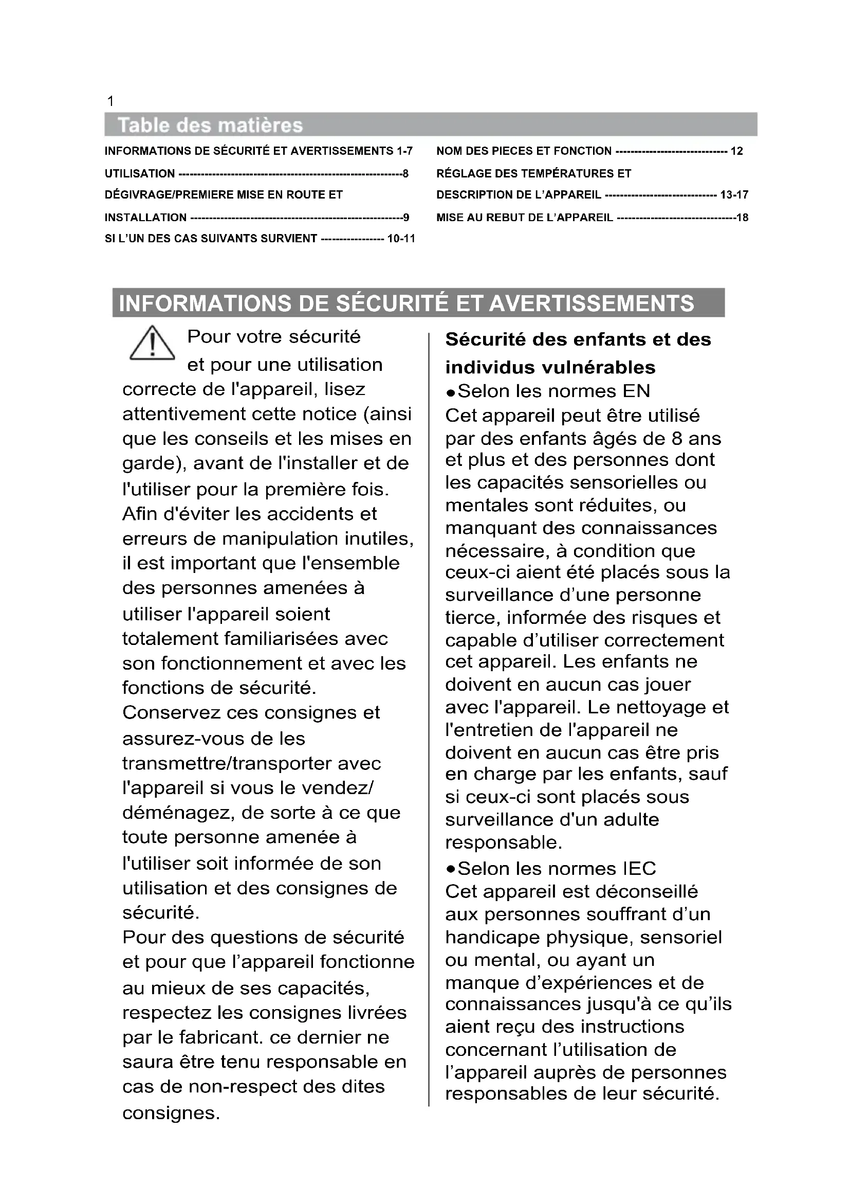 correcte de l'appareil, lisez attentivement cette notice (ainsi que les conseils et les mises en garde), avant de l'installer et de l'utiliser pour la première fois. Afin d'éviter les accidents et erreurs de manipulation inutiles, il est important que l'ensemble des personnes amenées à utiliser l'appareil soient totally familiarisées avec son fonctionnement et avec les fonctions de sécurité.