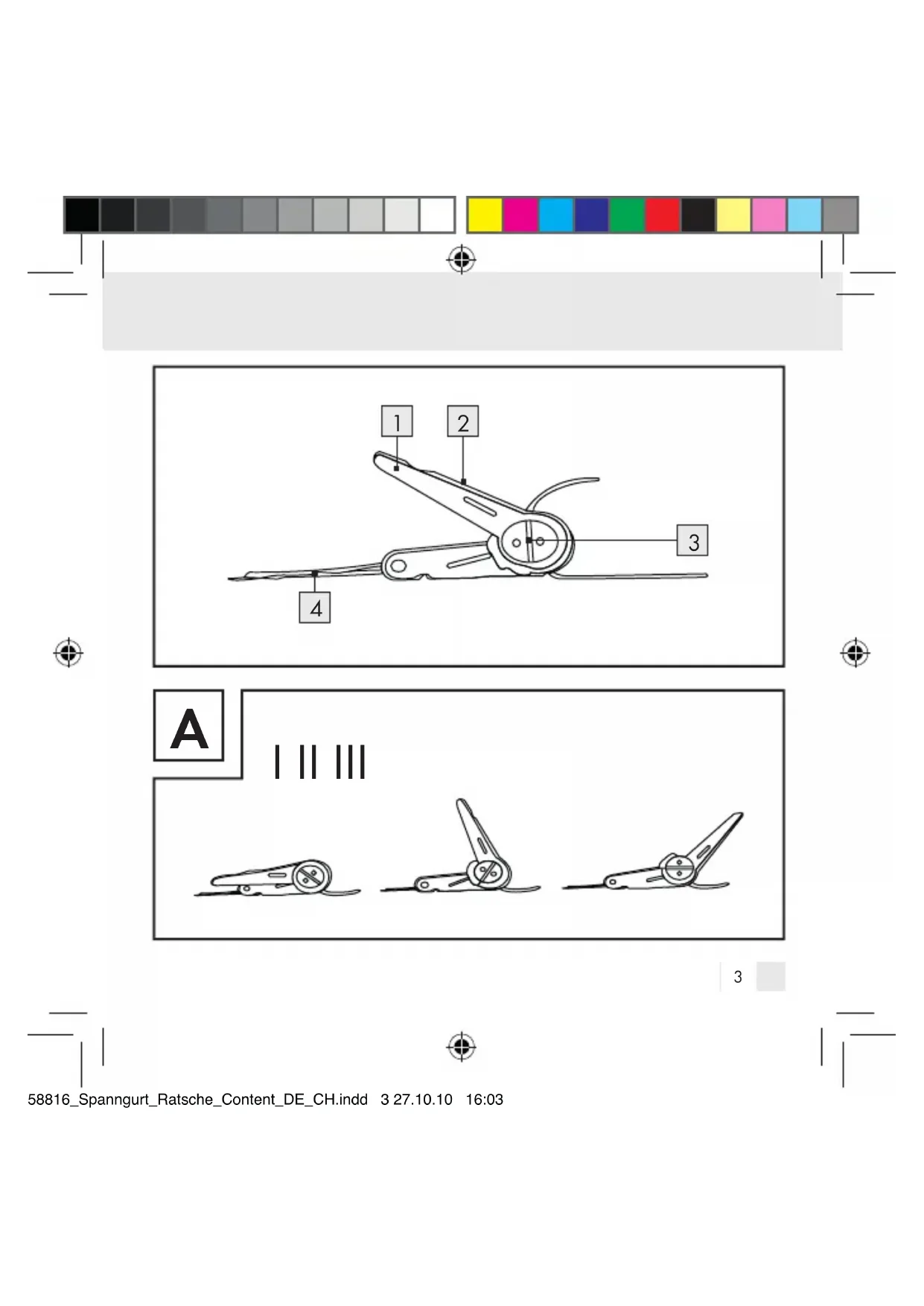 jusqu’à ce qu’elle soit fermement appliquée contre la charge. 58816_Spanngurt_Ratsche_Content_DE_CH.indd 35 27.10.10 16:0436 FR/CH Utilisation j Tendre la sangle d’arrimage en faisant aller et venir la poignée du cliquet