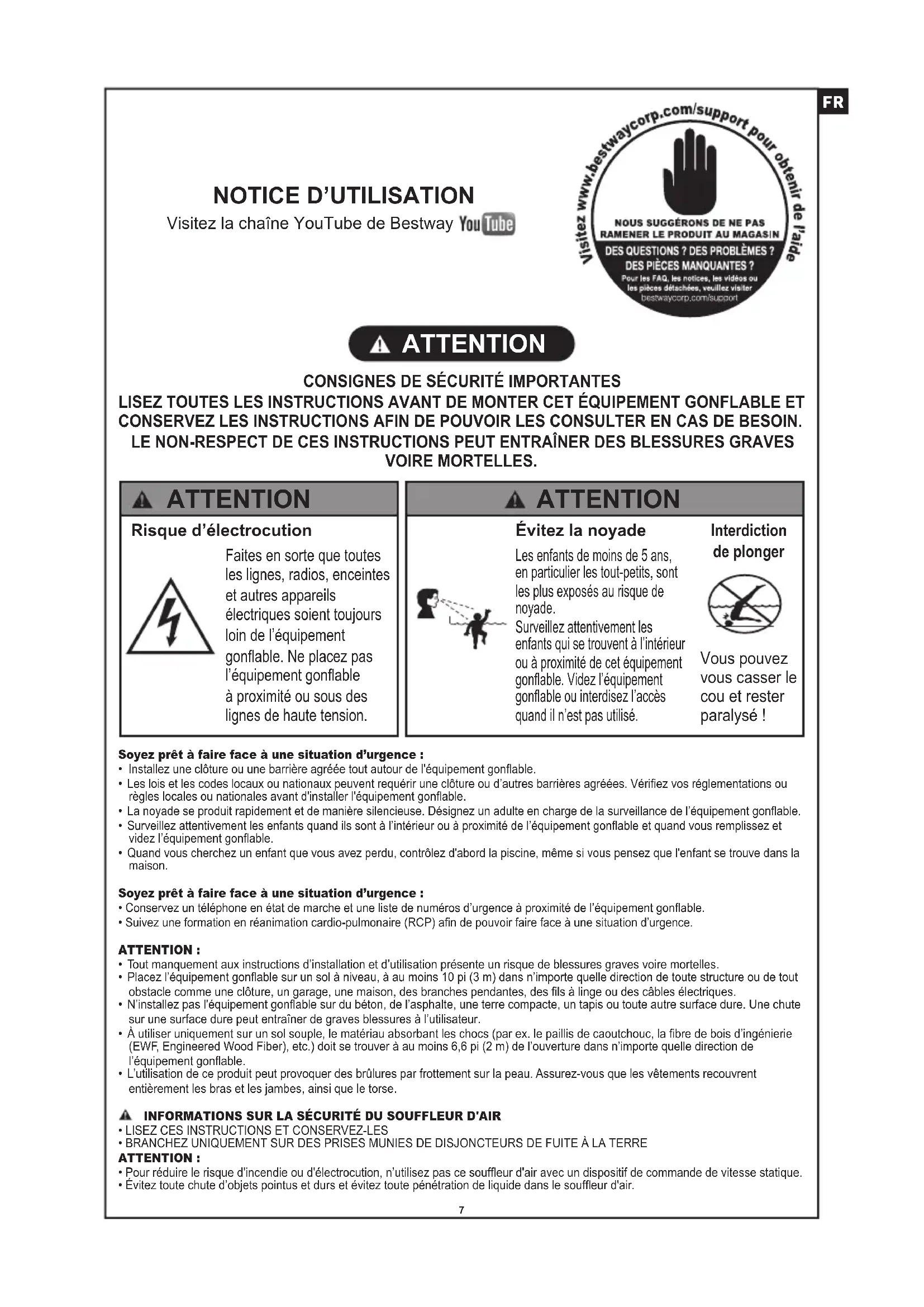 ATTENTION Risque d’électrocution Faites en sorte que toutes les lignes, radios, enceintes et autres appareils électriques soient toujours loin de l’équipement gonable. Ne placez pas l’équipement gonable à proximité ou sous des lignes de haute tension. ATTENTION Évitez la noyade Les enfants de moins de 5 ans, en particulier les tout-petits, sont les plus exposés au risque de noyade. Surveillez attentivement les enfants qui se trouvent à l’intérieur ou à proximité de cet équipement gonflable. Videz l’équipement gonflable ou interdisez l’accès quand il n’est pas utilisé. Interdiction de plonger Vous pouvez vous casser le cou et rester paralysé !303021296678_53384_14x21cm_美规城堡说明书