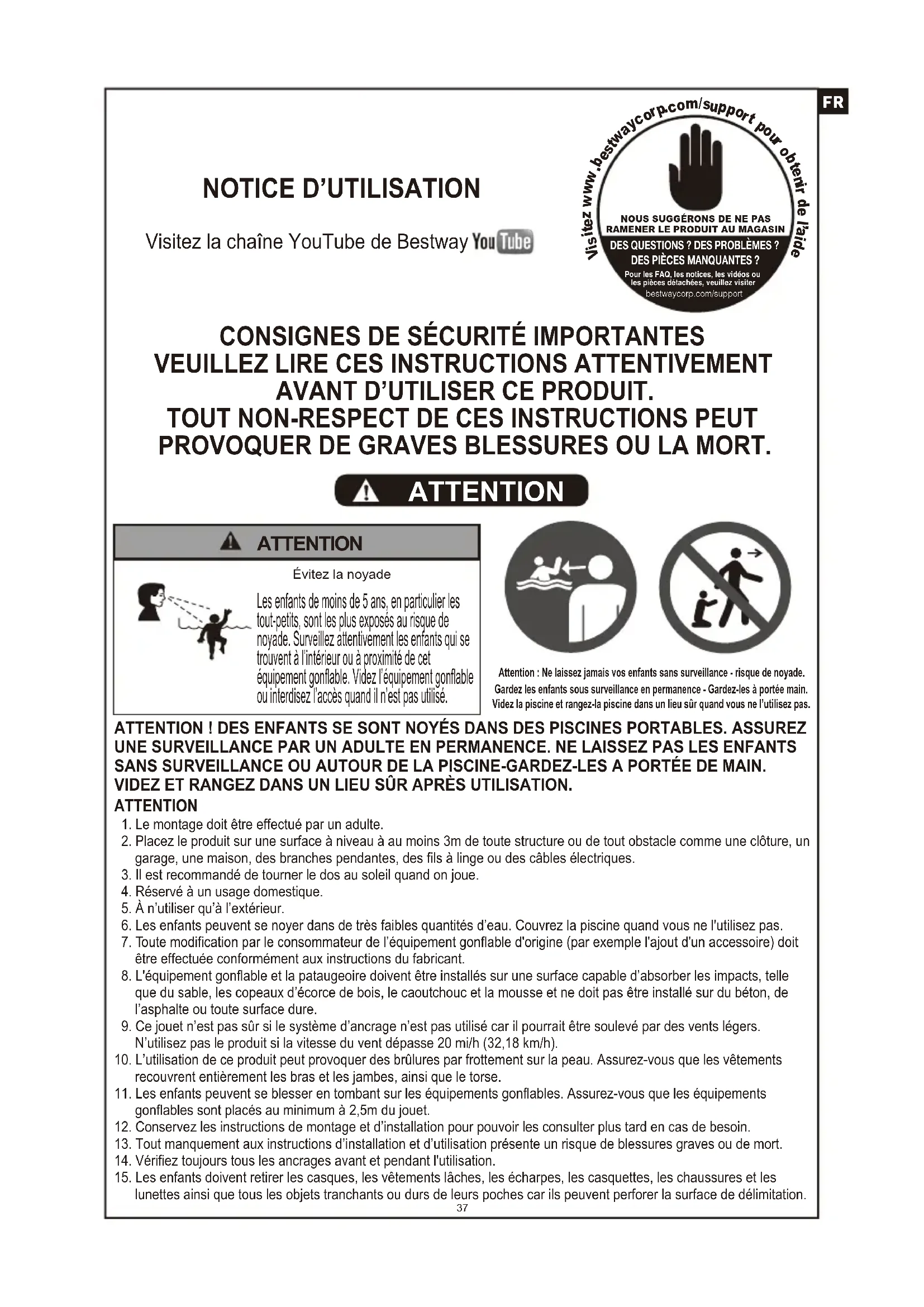 NOUS SUGGÉRONS DE NE PASRAMENER LE PRODUIT AU MAGASINDES QUESTIONS ? DES PROBLÈMES ?DES PIÈCES MANQUANTES ?Pour les FAQ, les notices, les vidéos oules pièces détachées, veuillez visiterbestwaycorp.com/support Visitez la chaîne YouTube de Bestway