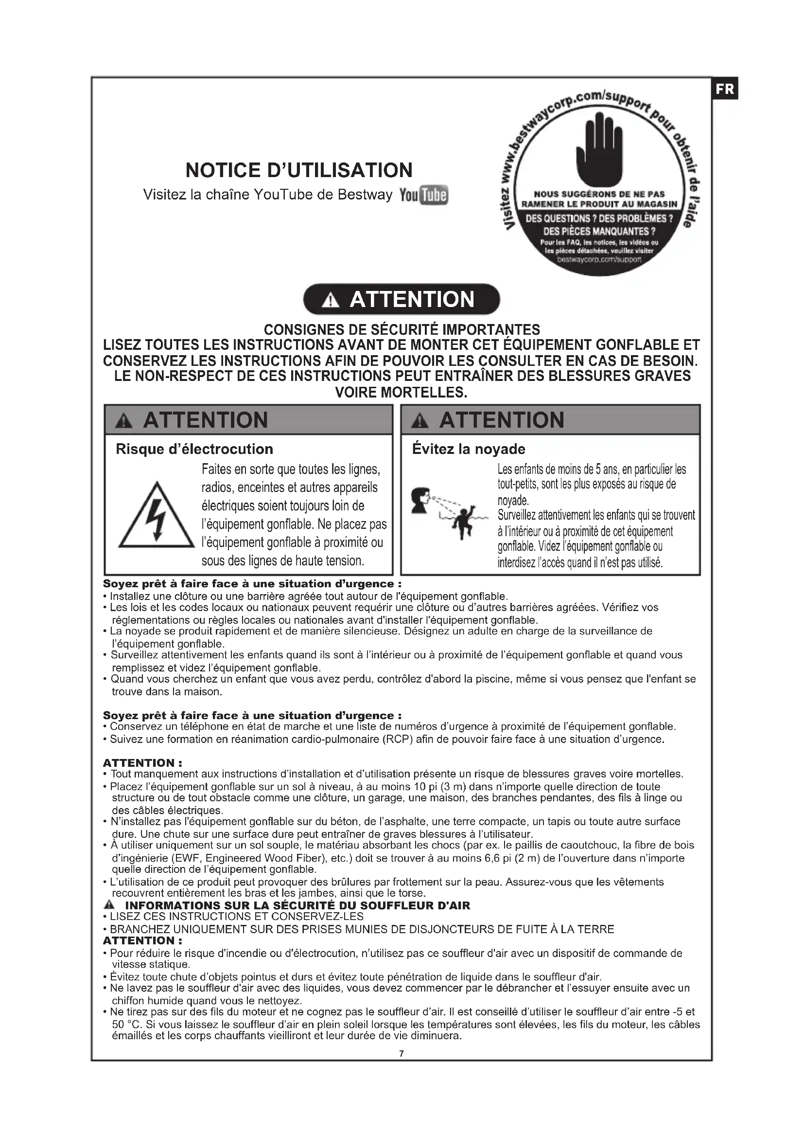 ATTENTION ATTENTION Risque d’électrocution Faites en sorte que toutes les lignes, radios, enceintes et autres appareils électriques soient toujours loin de l’équipement gonable. Ne placez pas l’équipement gonable à proximité ou sous des lignes de haute tension. ATTENTION Évitez la noyade Les enfants de moins de 5 ans, en particulier les tout-petits, sont les plus exposés au risque de noyade. Surveillez attentivement les enfants qui se trouvent à l’intérieur ou à proximité de cet équipement gonflable. Videz l’équipement gonflable ou interdisez l’accès quand il n’est pas utilisé. Soyez prêt à faire face à une situation d’urgence :