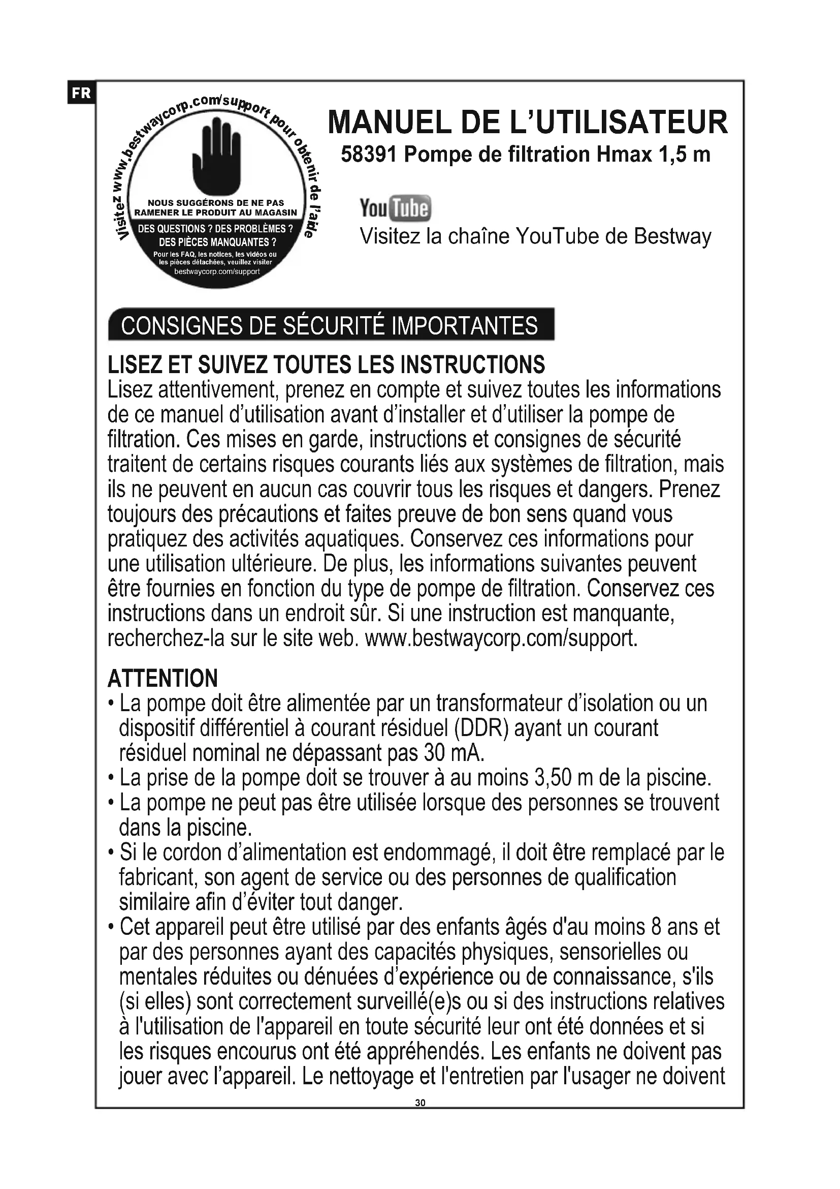 Lisez attentivement, prenez en compte et suivez toutes les informations de ce manuel d’utilisation avant d’installer et d’utiliser la pompe de filtration. Ces mises en garde, instructions et consignes de sécurité traitent de certains risques courants liés aux systèmes de filtration, mais ils ne peuvent en aucun cas couvrir tous les risques et dangers. Prenez toujours des précautions et faites preuve de bon sens quand vous pratiquez des activités aquatiques. Conservez ces informations pour une utilisation ultérieure. De plus, les informations suivantes peuvent être fournies en fonction du type de pompe de filtration. Conservez ces instructions dans un endroit sûr. Si une instruction est manquante, recherchez-la sur le site web. www.bestwaycorp.com/support. ATTENTION