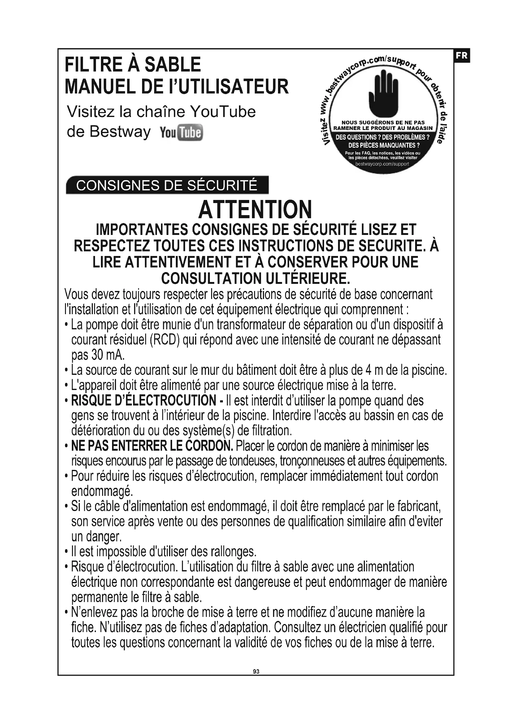 DES QUESTIONS ? DES PROBLÈMES ? DES PIÈCES MANQUANTES ? Pour les FAQ, les notices, les vidéos ou les pièces détachées, veuillez visiter bestwaycorp.com/support94 ATTENTION IMPORTANTES CONSIGNES DE SÉCURITÉ LISEZ ET