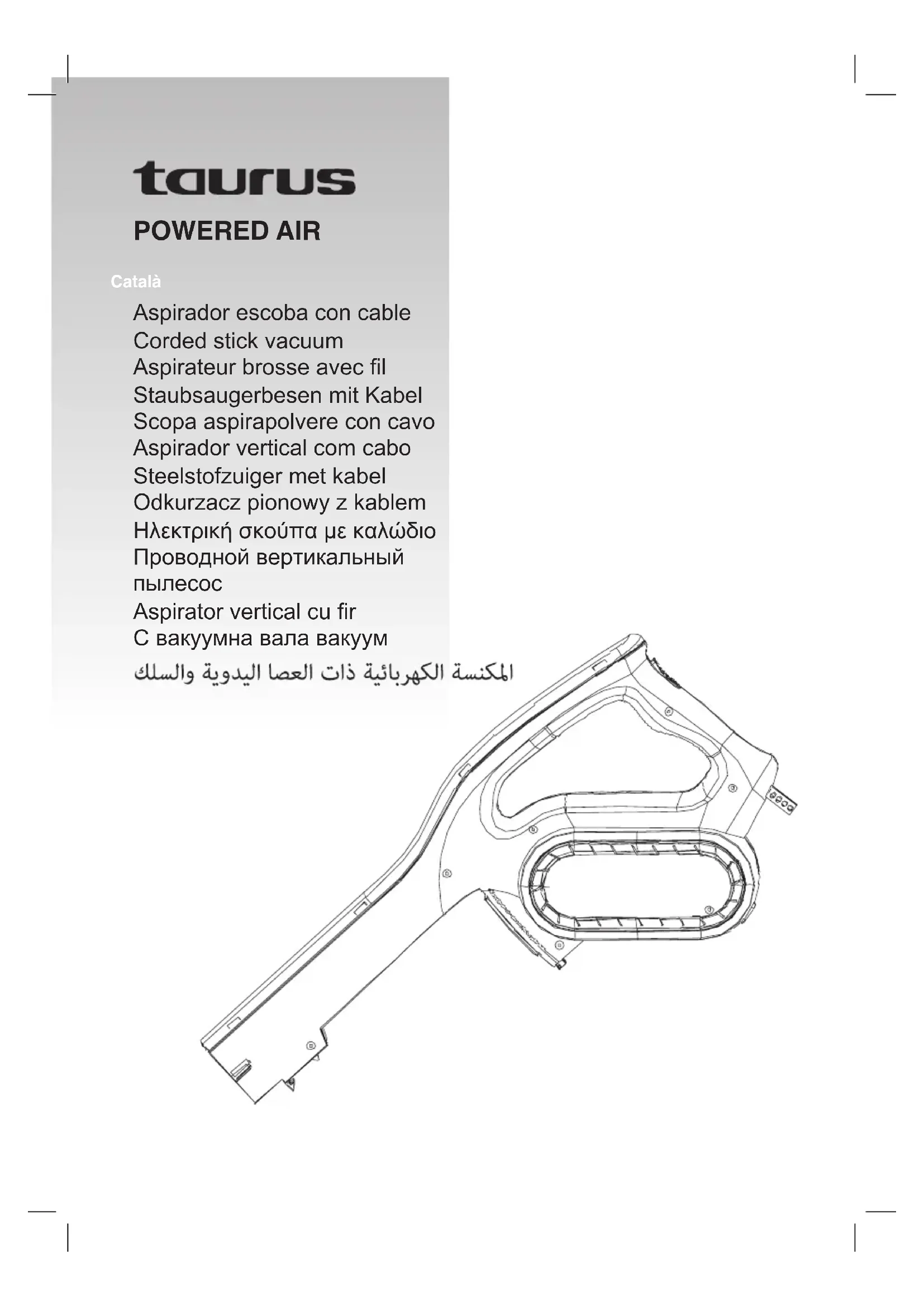 Niveau de puissance acoustique 80 dB Puissance d’entrée nomi- nale 600 WPour déterminer la conformité aux critères de conception écologique et pour le calcul des paramètres d’étiquetage énergétique, l’appareil est considéré comme étant un aspirateur à usage général avec référence aux normes européennes EN 60312-1, EN 60704-2-1 et EN 60335-2-2. Cet appareil est certié conforme à la directive 2014/35/UE de basse tension, de même qu’à la directive 2014/30/UE en matière de compatibilité électromagnétique, à la directive 2011/65/UE relative à la limitation de l’utilisation de certaines substances dangereuses dans les équipements électriques et électroniques et à la directive 2009/125/CE sur les conditions de conception écologique applicable aux produits en rapport avec l’énergie.Deutsch Staubsaugerbesen mit Kabel Powered Air Sehr geehrte Kundin, Vielen Dank für Ihr Vertrauen in die Marke TAU- RUS. Die Technologie, das Design und die Funktiona- lität dieses Produkts, das die anspruchsvollsten Qualitätsnormen erfüllt, werden Sie über viele Jahre zufriedenstellen. Lesen Sie die Gebrauchsanweisung sorgfältig, bevor Sie das Gerät einschalten und bewahren Sie diese zum Nachschlagen zu einem späteren Zeitpunkt auf. Werden die Hinweise dieser Bedie- nungsanleitung nicht beachtet und eingehalten, kann es zu Unfällen kommen.