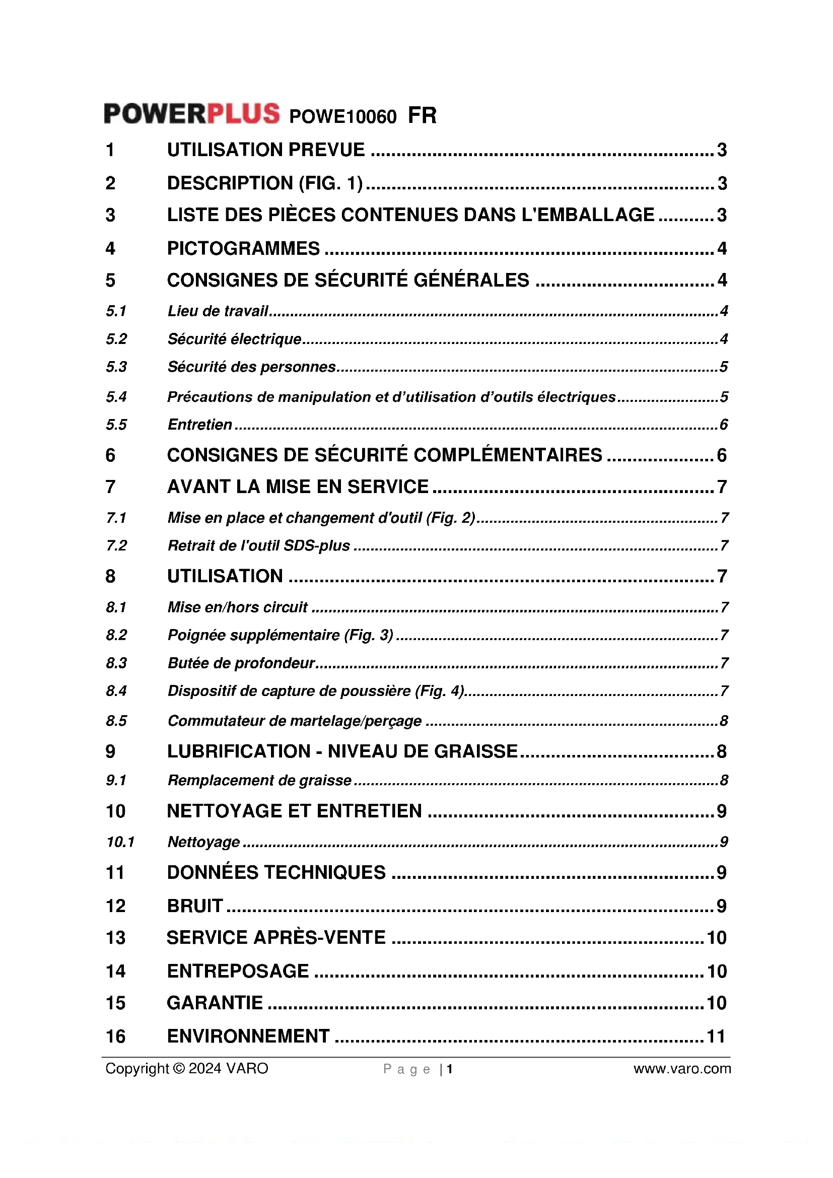 Longueur du câble 2 m + fiche VDE Type de mandrin 13 mm mandrin à clé avec adaptateur SDS 12 BRUIT Valeurs des émissions acoustiques mesurées selon la norme applicable. (K=3) Pression acoustique LpA 99 dB(A) Puissance acoustique LwA 107 dB(A) ATTENTION ! Lorsque la pression acoustique dépasse la valeur de 85 dB(A), il est nécessaire de porter des dispositifs individuels de protection de l’ouïe. aw (Vibrations) 29,2 m/s² K = 1,5 m/s²POWE10060 FR Copyright © 2024 VARO P a g e | 10 www.varo.com