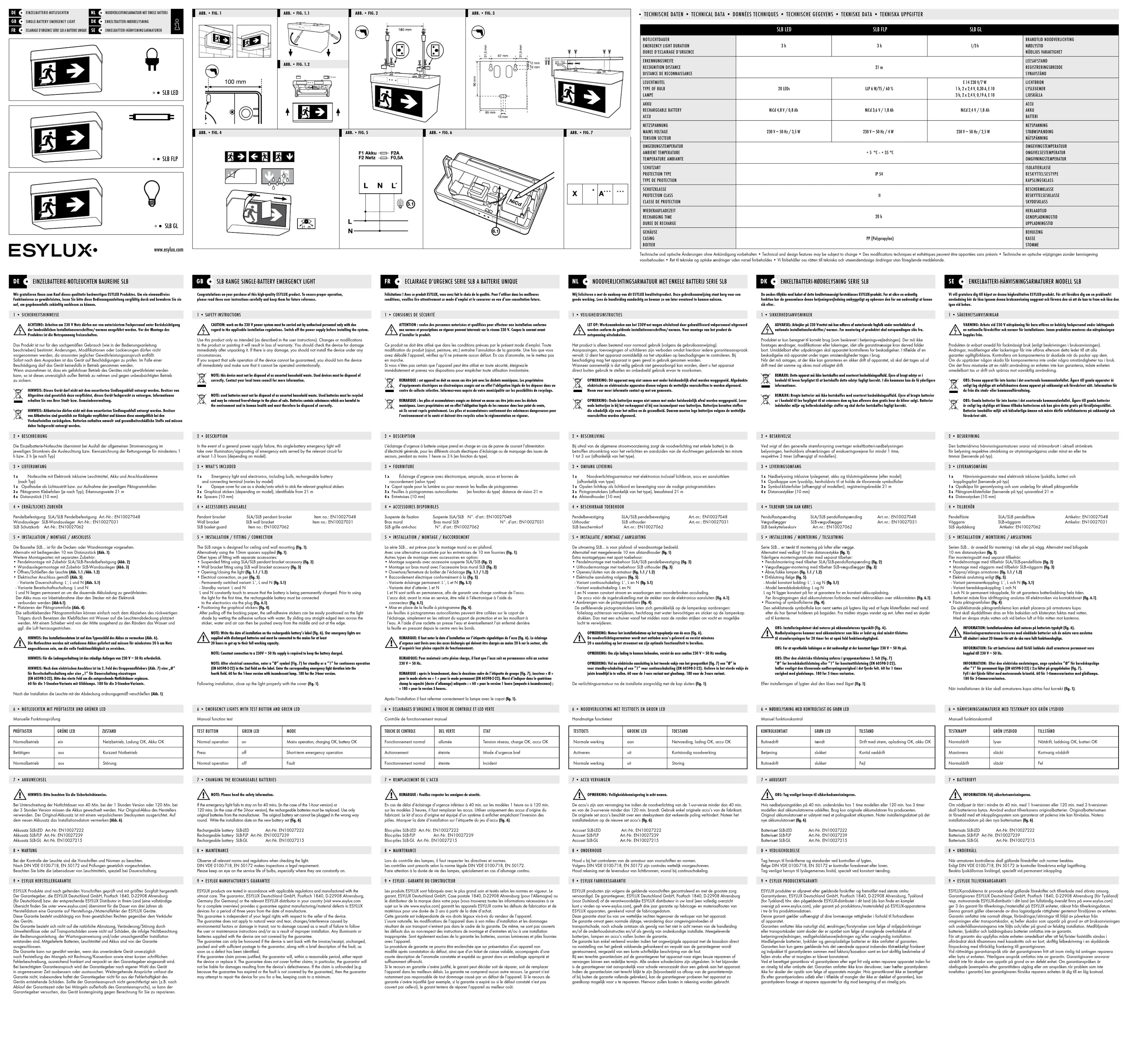 - Miseenplacedelafeuilleàpictogramme(fig. 4). Les feuilles à pictogrammes autocollantes peuvent être collées sur le capot de l‘éclairage, simplement en les retirant du support de protection et en les mouillant à l‘eau. A l‘aide d‘une raclette on presse l‘eau et éventuellement l‘air enfermé derrière la feuille en pressant depuis le centre vers les bords.REMARQUE: Il faut noter la date d‘installation sur l‘étiquette signalétique de l‘accu (fig. 6). Le éclairage d‘urgence sont livrés avec des accus déchargés qui doivent être chargés au moins 20 h sur le secteur, afin d‘acquérir leur pleine capacité de fonctionnement. REMARQUE: Pour maintenir cette pleine charge, il faut que l‘accu soit en permanence relié au secteur 230 V ∼ 50 Hz.REMARQUE : après le branchement, dans le deuxième cadre de l’étiquette de groupe (fig. 7), inscrivez « Ø » pour le mode alerte ou « 1 » pour le mode permanent (EN 60598-2-22). Merci d’indiquer dans le quatrième champ la capacité (durée d’allumage) adéquate : « 60 » pour la version 1 heure (ampoule à incandescence) ; « 180 » pour la version 3 heures.Après l‘installation il faut refermer correctement la lampe avec le capot (fig. 1). Contrôle de fonctionnement manuel REMARQUE : Veuillez respecter les consignes de sécurité. En cas de délai d‘éclairage d‘urgence inférieur à 40 min. sur les modèles 1 heure ou à 120 min. sur les modèles 3 heures, il faut remplacer les accus. Utiliser uniquement des accus d‘origine du fabricant. Le kit d‘accu d‘origine est équipé d‘un système à enficher empêchant l‘inversion des pôles. Marquer la date d‘installation sur l‘étiquette du jeu d‘accu (fig. 6). Bloc-piles SLB-LED Art.-Nr. EN10027222Bloc-piles SLB-FLP Art.-Nr. EN10027239Bloc-piles SLB-GL Art.-Nr. EN10027215 Lors du contrôle des lampes, il faut respecter les directives et normes.Les contrôles sont prescrits selon la norme légale DIN VDE 0100-718, EN 50172.Faire attention à la durée de vie des lampes, spécialement en cas d‘allumage continu. Les produits ESYLUX sont fabriqués avec le plus grand soin et testés selon les normes en vigueur. Le garant, ESYLUX Deutschland GmbH, Case postale 1840, D-22908 Ahrensburg (pour l’Allemagne) ou le distributeur de la marque dans votre pays (vous trouverez toutes les informations nécessaires à ce sujet sur le site www.esylux.com) garantit les appareils ESYLUX contre les défauts de fabrication et de matériaux pour une durée de 3 ans à partir de la date d’achat.Cette garantie est indépendante de vos droits légaux vis-à-vis du vendeur de l’appareil.L’usure naturelle, les modifications de l’appareil dues à son milieu d’installation et les dommages résultant de son transport n’entrent pas dans le cadre de la garantie. De même, ne sont pas couverts les défauts dus au non-respect des instructions de montage et d’entretien et/ou à une installation inappropriée. Sont également exclues de la garantie les batteries, sources lumineuses et piles fournies avec l’appareil.La procédure de garantie ne pourra être enclenchée que sur présentation d’un appareil non modifié après constatation du défaut, ainsi que d’un ticket de caisse valable, accompagnés d’une courte description de l’anomalie constatée et expédié au garant dans un emballage approprié et suffisamment affranchi.Si le recours en garantie s’avère justifié, le garant peut décider soit de réparer, soit de remplacer l’appareil dans les meilleurs délais. La garantie ne comprend aucun autre recours. Le garant n’est notamment pas responsable de tout dommage causé par un défaut de l’appareil. Si le recours de garantie s’avère injustifié (par exemple, si la garantie a expiré ou si le défaut constaté n’est pas couvert par celle-ci), le garant tentera de réparer l’appareil au meilleur coût.Wij feliciteren u met de aankoop van dit ESYLUX kwaliteitsproduct. Deze gebruiksaanwijzing staat borg voor een goede werking. Lees de handleiding aandachtig en bewaar ze om later eventueel te kunnen nalezen. LET OP: Werkzaamheden aan het 230V-net mogen uitsluitend door gekwalificeerd vakpersoneel uitgevoerd worden conform de geldende installatievoorschriften/-normen. Voor montage van het product de netspanning uitschakelen.Het product is alleen bestemd voor normaal gebruik (volgens de gebruiksaanwijzing). Aanpassingen, toevoegingen of schilderen zijn verboden omdat hierdoor iedere garantieaanspraak vervalt. U dient het apparaat onmiddellijk na het uitpakken op beschadigingen te controleren. Bij beschadiging mag het apparaat in geen geval in gebruik genomen worden.Wanneer aannemelijk is dat veilig gebruik niet gewaarborgd kan worden, dient u het apparaat direct buiten gebruik te stellen en onbedoeld gebruik ervan te voorkomen.OPMERKING: Dit apparaat mag niet samen met ander huishoudelijk afval worden weggegooid. Afgedankte elektrische en elektronische apparaten dienen volgens de wettelijke voorschriften te worden afgevoerd. Neem voor meer informatie contact op met uw gemeente.OPMERKING: Oude batterijen mogen niet samen met ander huishoudelijk afval worden weggegooid. Lever oude batterijen in bij het verkooppunt of bij een inzamelpunt voor batterijen. Batterijen bevatten stoffen die schadelijk zijn voor het milieu en de gezondheid. Daarom moeten lege batterijen volgens de wettelijke voorschriften worden afgevoerd. Bij uitval van de algemene stroomvoorziening zorgt de noodverlichting met enkele batterij in de betroffen stroomkring voor het verlichten en aanduiden van de vluchtwegen gedurende ten minste 1 tot 3 uur (afhankelijk van het type).