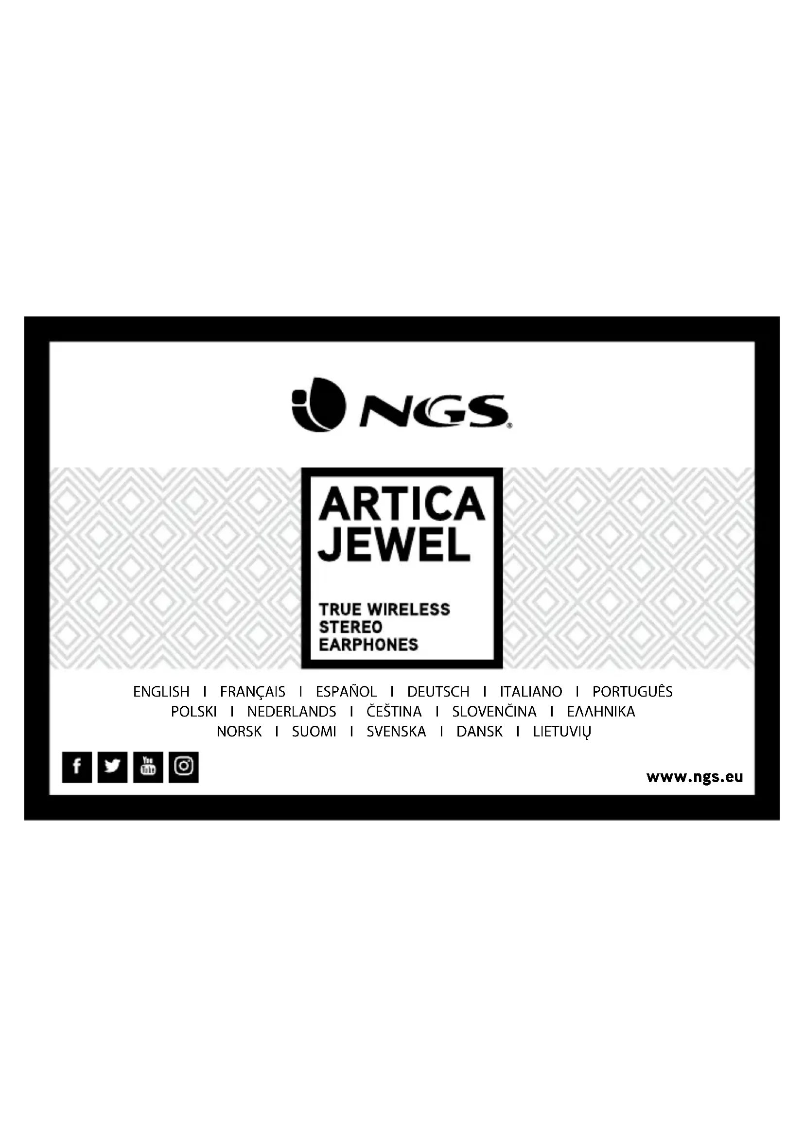 Garantie limitée. NGS certie que tous les produits matériels accompagnant cette documentation sont exempts de tous défauts de fabrication et sont garantis pendant une période de deux (2) ans, (3) ans ou (5) ans (selon le produit), à compter de la date d’achat du produit. La garantie de NGS est limitée à l’acheteur original et ne peut faire l’objet d’un transfert. Cette garantie est exécutée sans préjudice des droits légitimes du consommateur prévus par la loi. Garantie de la batterie. La batterie est un consommable, et en tant que telle sa garantie est de 12 mois. Compatible Bluetooth 5.0 Mains libres Batterie d’écouteur : 40 mAh / 3,7 V Temps de recharge des écouteurs : 1 heure Durée de fonctionnement : 5 heures* Base de charge : 300 mAh / 3,7 V Recharge des écouteurs 2 fois Temps de recharge de la base : 2 heures Distance de fonctionnement : jusqu’à 10 m