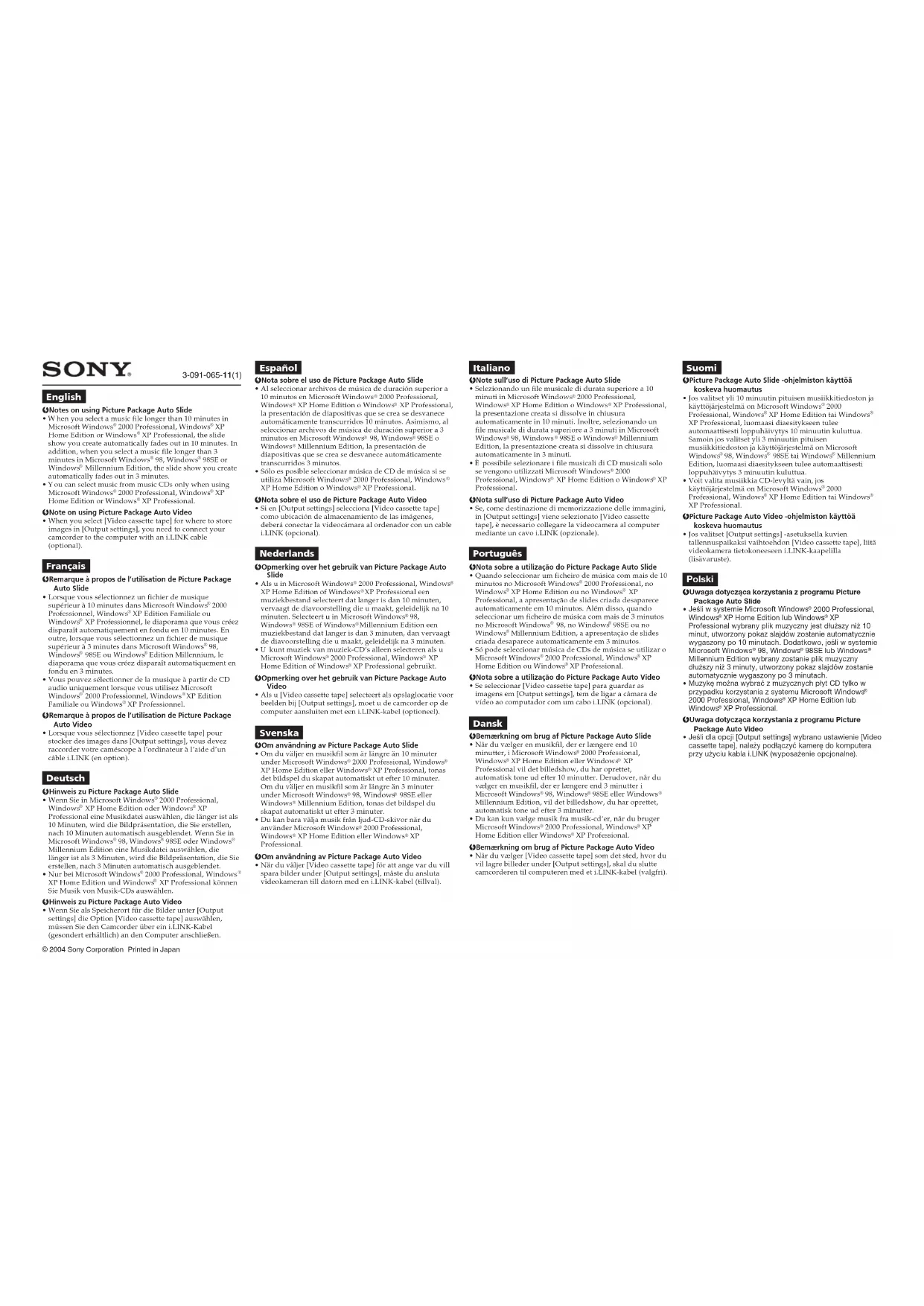 - Lorsque vous sélectionnez [Video cassette tape] pour stocker des images dans [Output settings], vous devez raccorder votre caméscope à l’ordinateur à l’aide d’un câble i.LINK (en option). Deutsch b Hinweis zu Picture Package Auto Slide