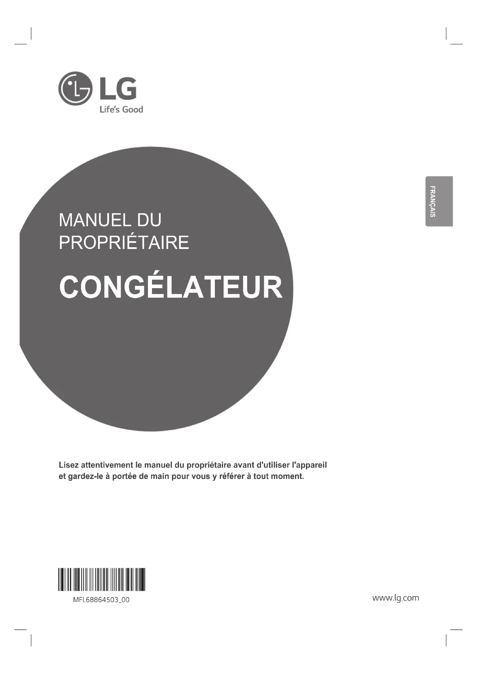 - Stellen Sie zur Vermeidung dieses Geräuschs sicher, dass die Seitenteile und die Rückseite nicht an einer Wand oder einem Schrank anstehen.Anmerkungwww.lg.com MANUEL DU PROPRIÉTAIRE CONGÉLATEUR Lisez attentivement le manuel du propriétaire avant d'utiliser l'appareil et gardez-le à portée de main pour vous y référer à tout moment. MFL68864503_00 FRANÇAIStable des matières Ce manuel est conçu pour un groupe d'appareils et peut contenir des images ou un contenu différent du modèle que vous avez acheté. Ce manuel est sujet à révision par le fabricant. Consignes de séCurité p. 3